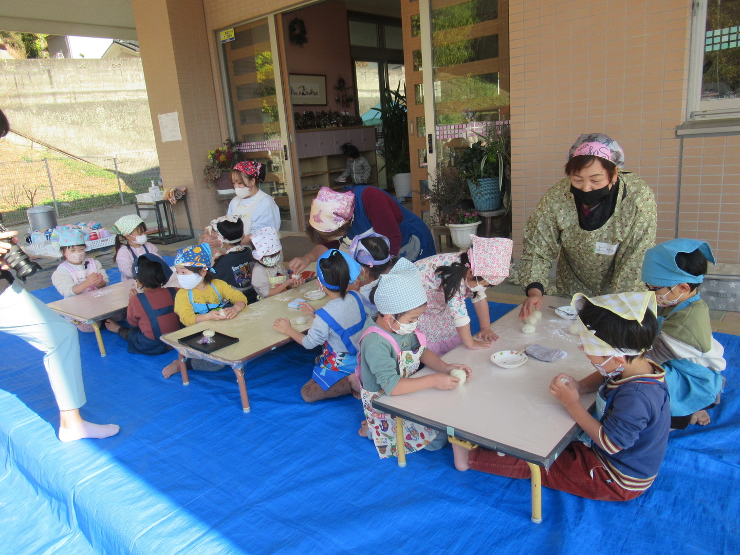 おじいちゃんおばあちゃんと一緒におもちつきをしました。初めにもち米を食べ、このお米がおもちになることを知らせ、おじいちゃんたちに手伝ってもらいながら臼と杵でつくと、だんだん柔らかくなりおいしそうなおもちができました!おばあちゃんたちに教えてもらいながら上手に丸め、自分で作ったあんこ餅を嬉しそうに食べていましたよ。