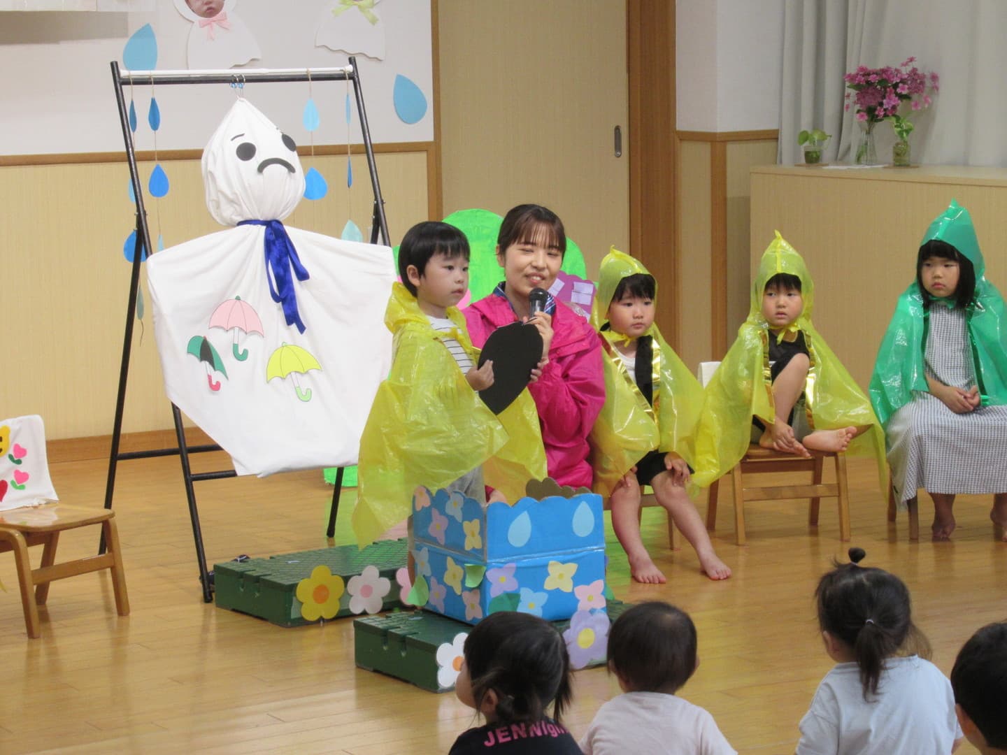 今日も朝から雨・・・誕生児さんはレインコートを着て、傘をさして登場しました。てるてる坊主を作り、シルエットクイズをしながら、かわいい傘の模様を付けていくと、てるてる坊主もニッコリ笑顔になりました。今月から以上児クラスはバイキング給食が始まり、嬉しそうに食べていましたよ。
