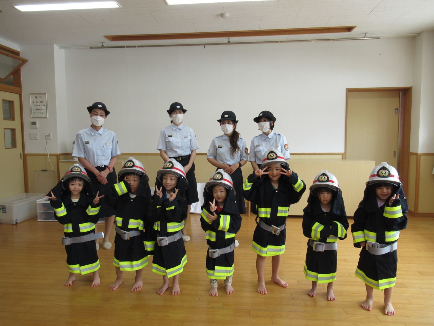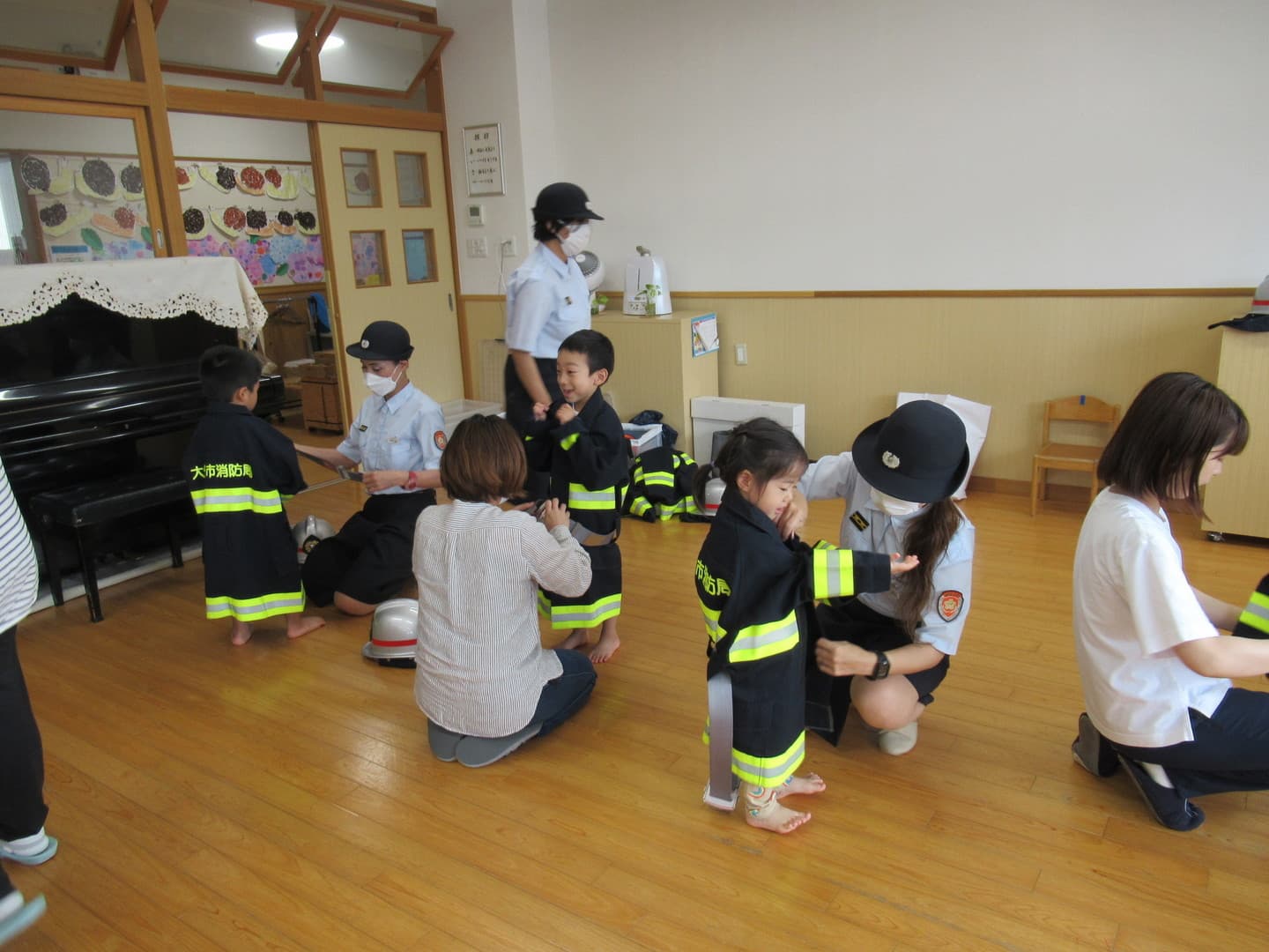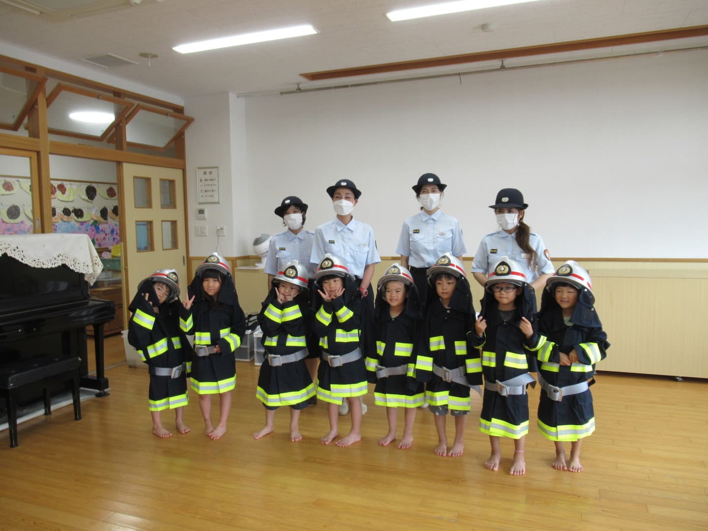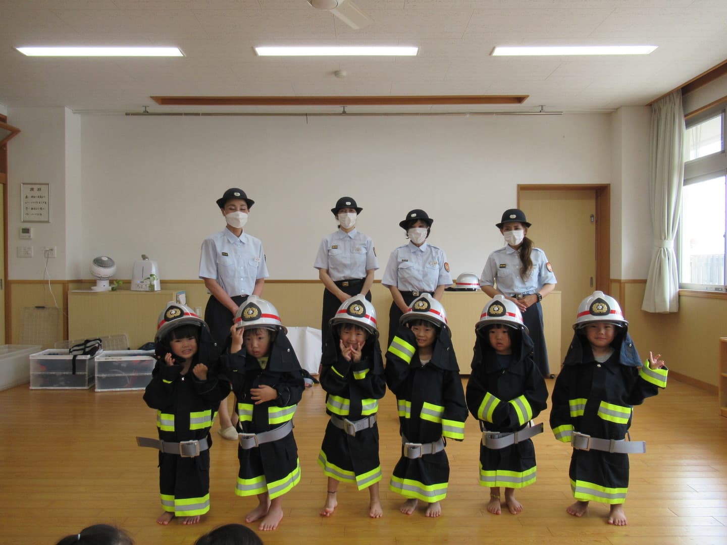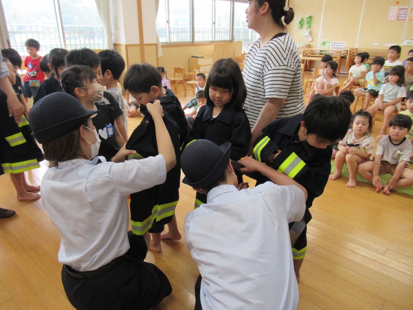 今日は女性消防団員の方に来ていただき、以上クラスで消防教室がありました。防災についての紙芝居を見たりクイズをして、地震や津波、大雨や火事の時の避難の仕方を楽しく学ぶことができました。避難訓練の時には「おはしも」の約束をしていますが、実はもうひとつ「ち」“近寄らない”がある事を教えてもらったので、これからは「おはしもち」で覚えていきたいと思います。最後は防火衣の試着をさせてもらい、うれしそうでした!