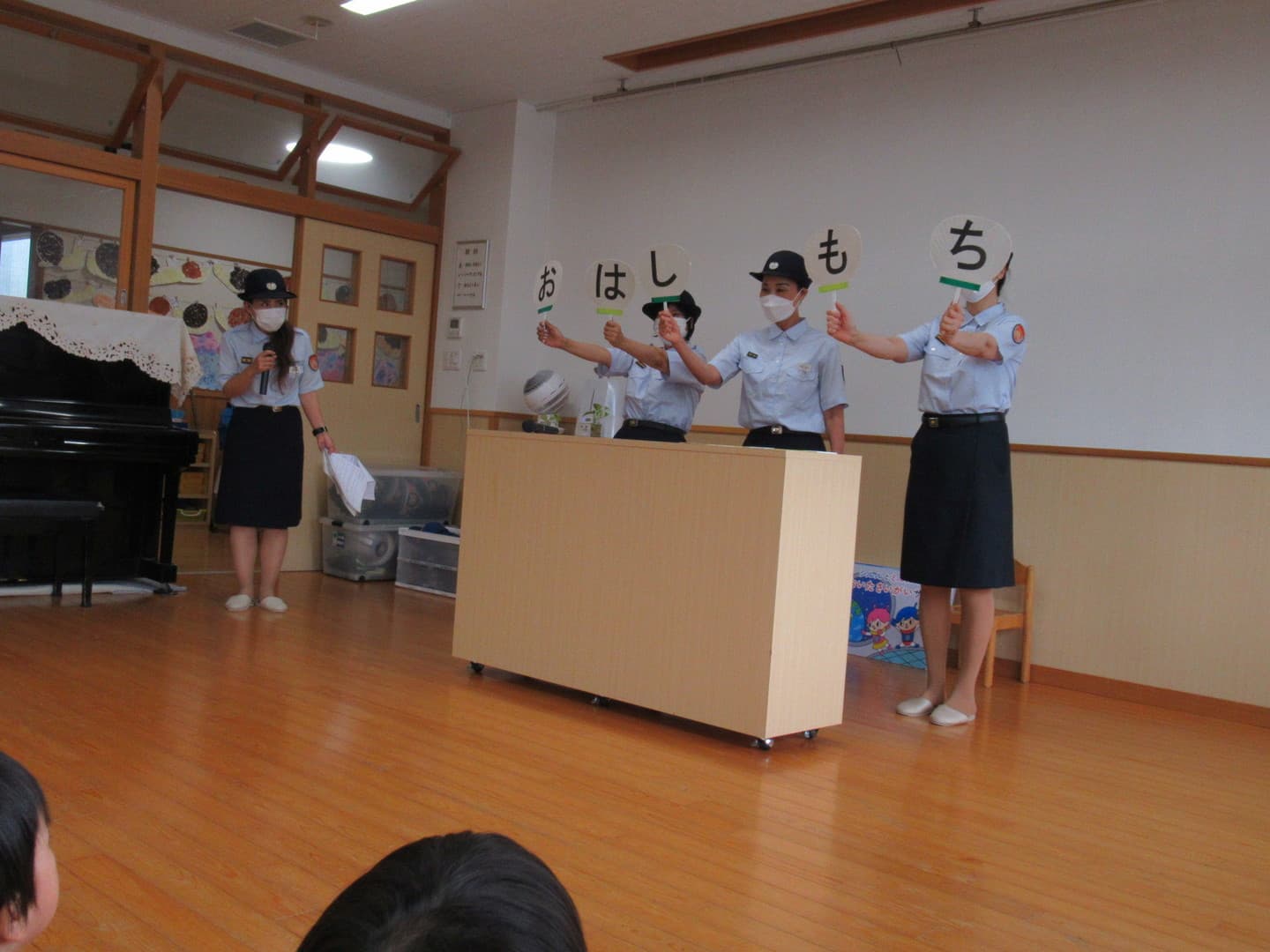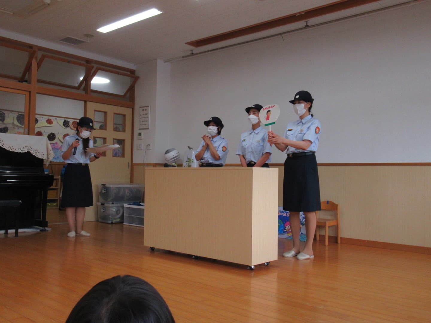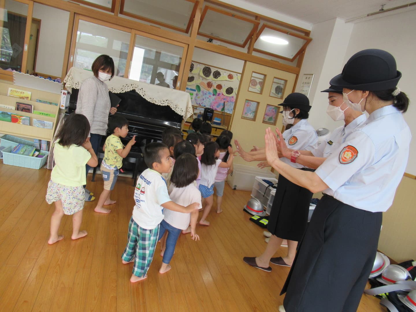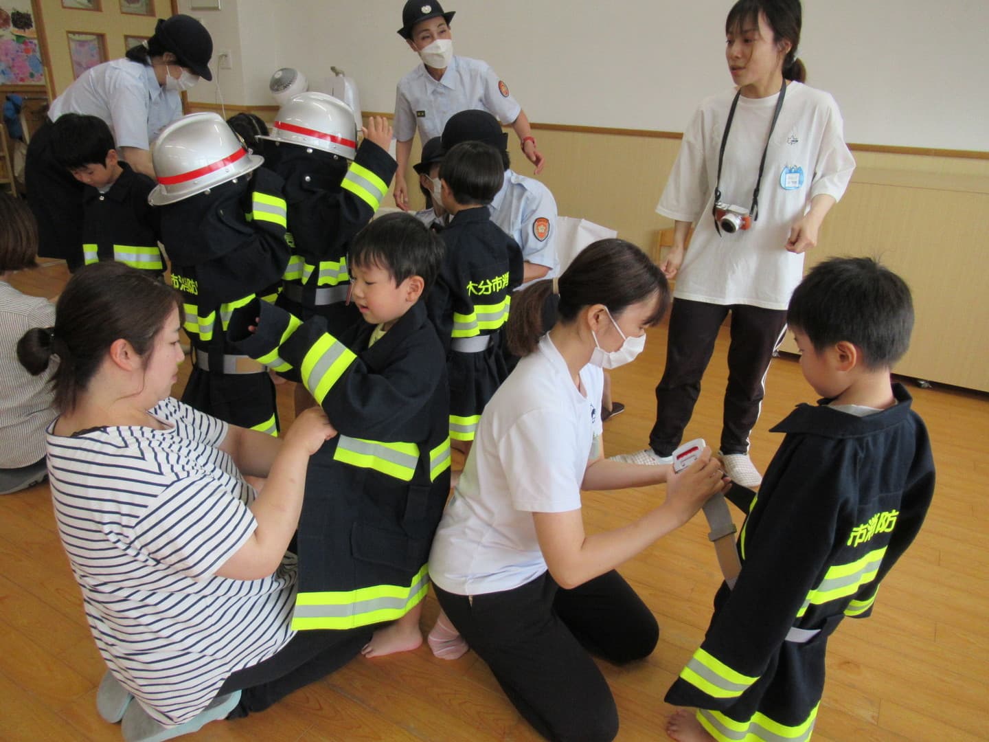 今日は女性消防団員の方に来ていただき、以上クラスで消防教室がありました。防災についての紙芝居を見たりクイズをして、地震や津波、大雨や火事の時の避難の仕方を楽しく学ぶことができました。避難訓練の時には「おはしも」の約束をしていますが、実はもうひとつ「ち」“近寄らない”がある事を教えてもらったので、これからは「おはしもち」で覚えていきたいと思います。最後は防火衣の試着をさせてもらい、うれしそうでした!