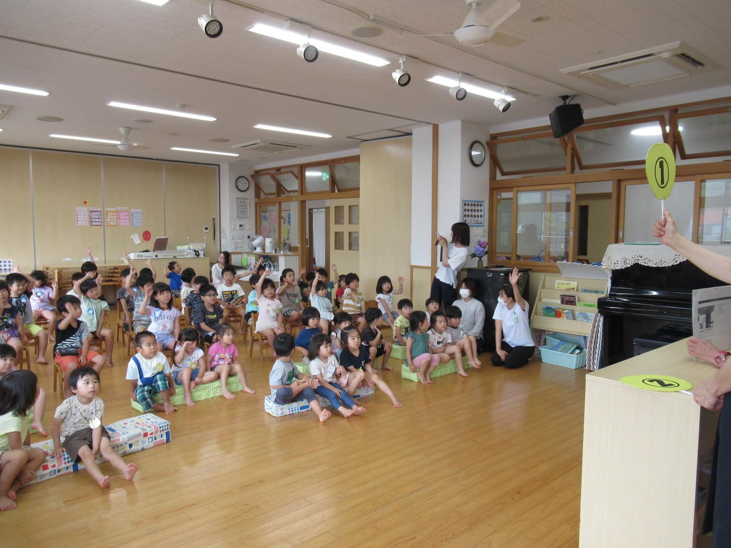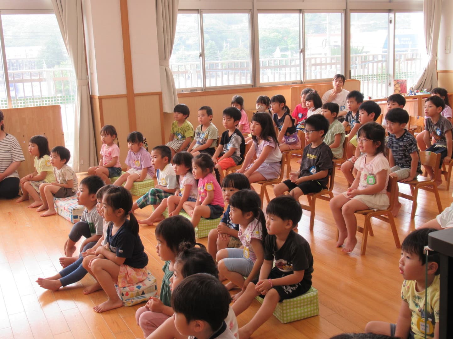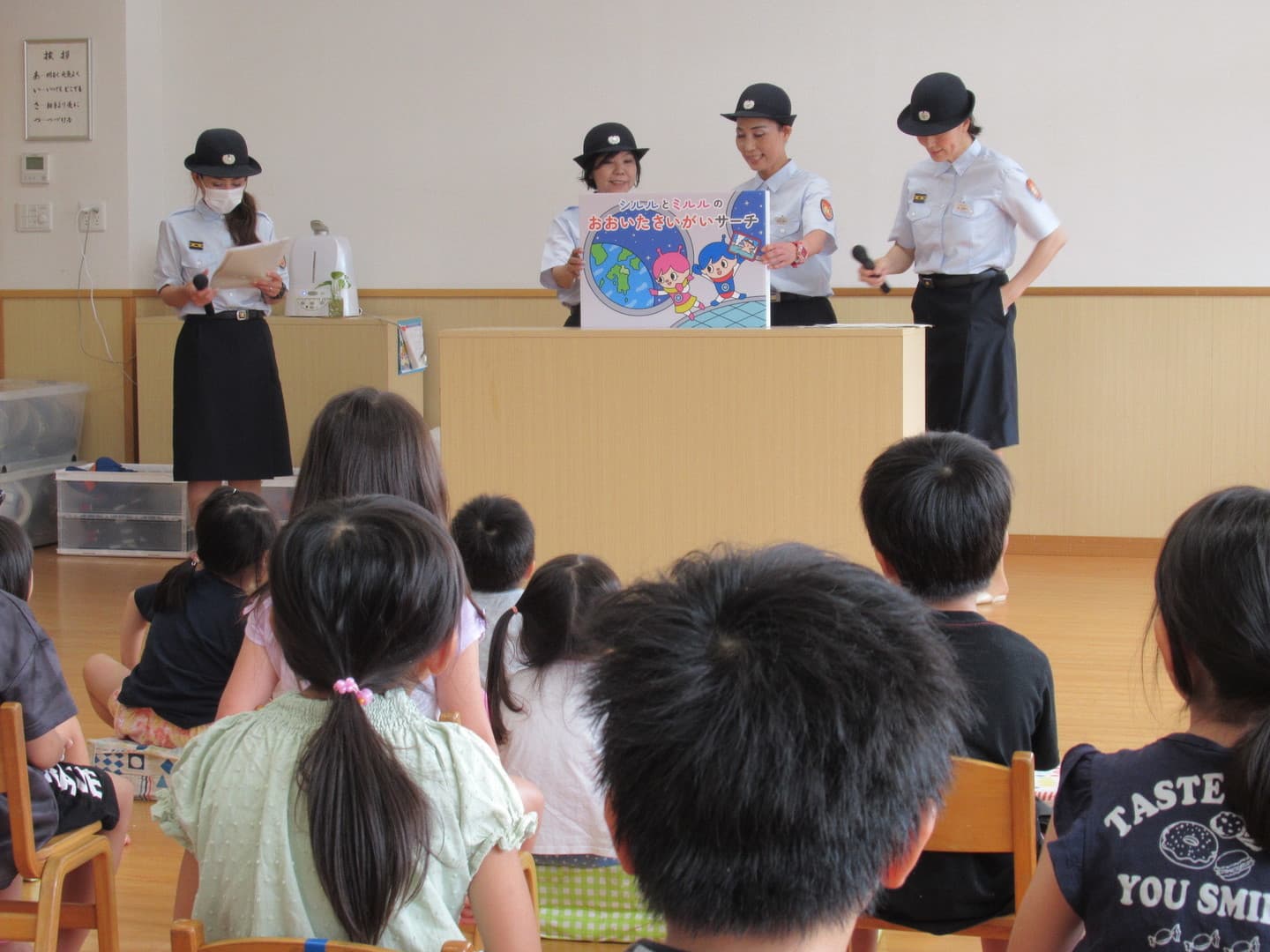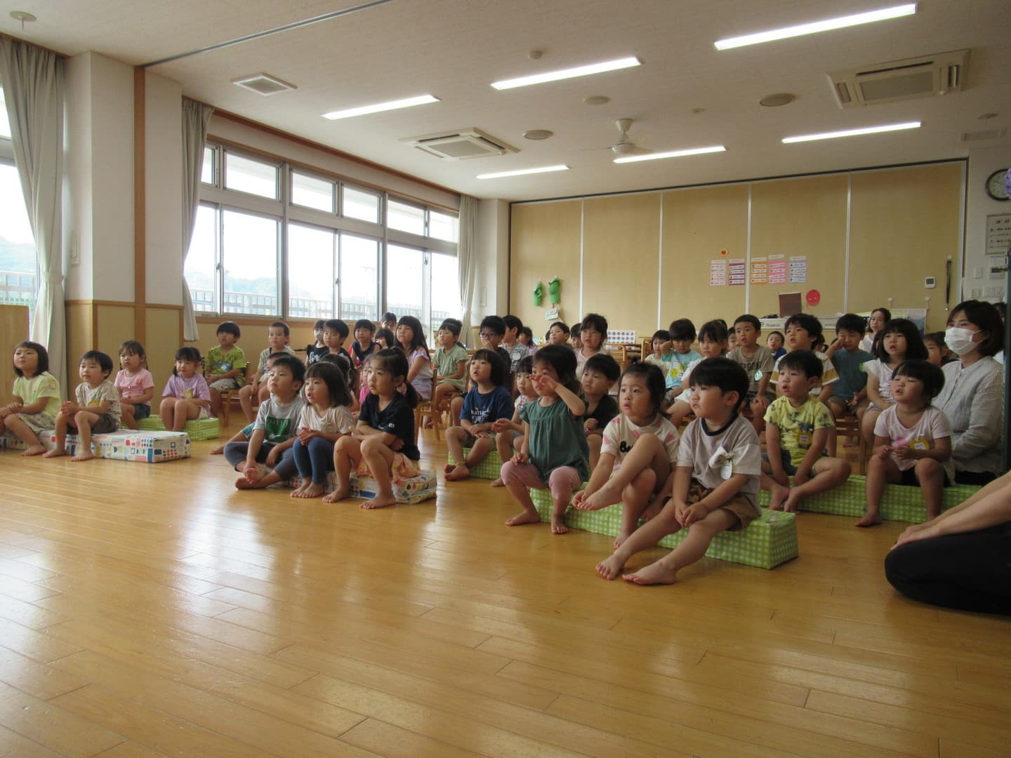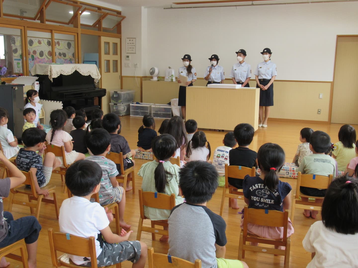 今日は女性消防団員の方に来ていただき、以上クラスで消防教室がありました。防災についての紙芝居を見たりクイズをして、地震や津波、大雨や火事の時の避難の仕方を楽しく学ぶことができました。避難訓練の時には「おはしも」の約束をしていますが、実はもうひとつ「ち」“近寄らない”がある事を教えてもらったので、これからは「おはしもち」で覚えていきたいと思います。最後は防火衣の試着をさせてもらい、うれしそうでした!