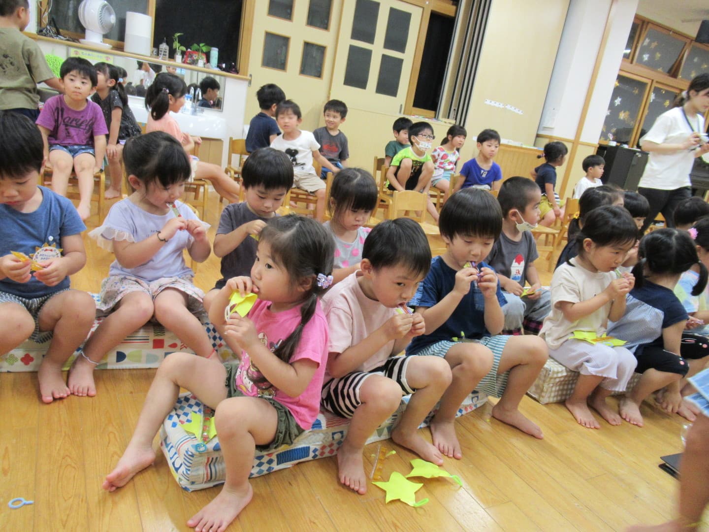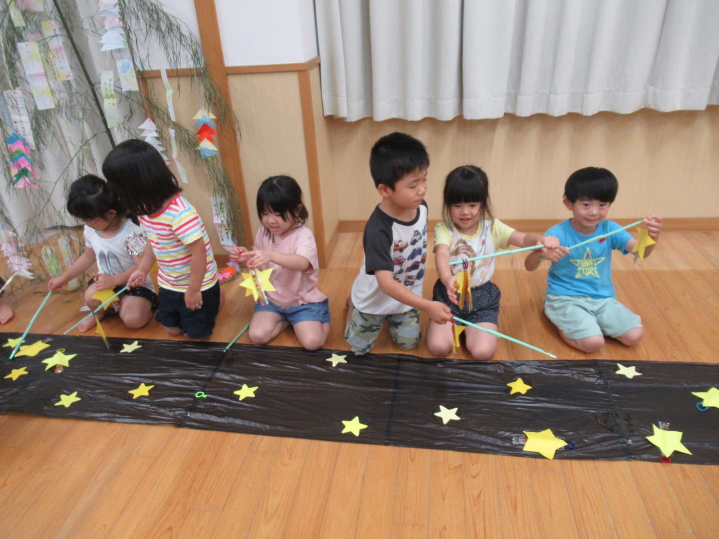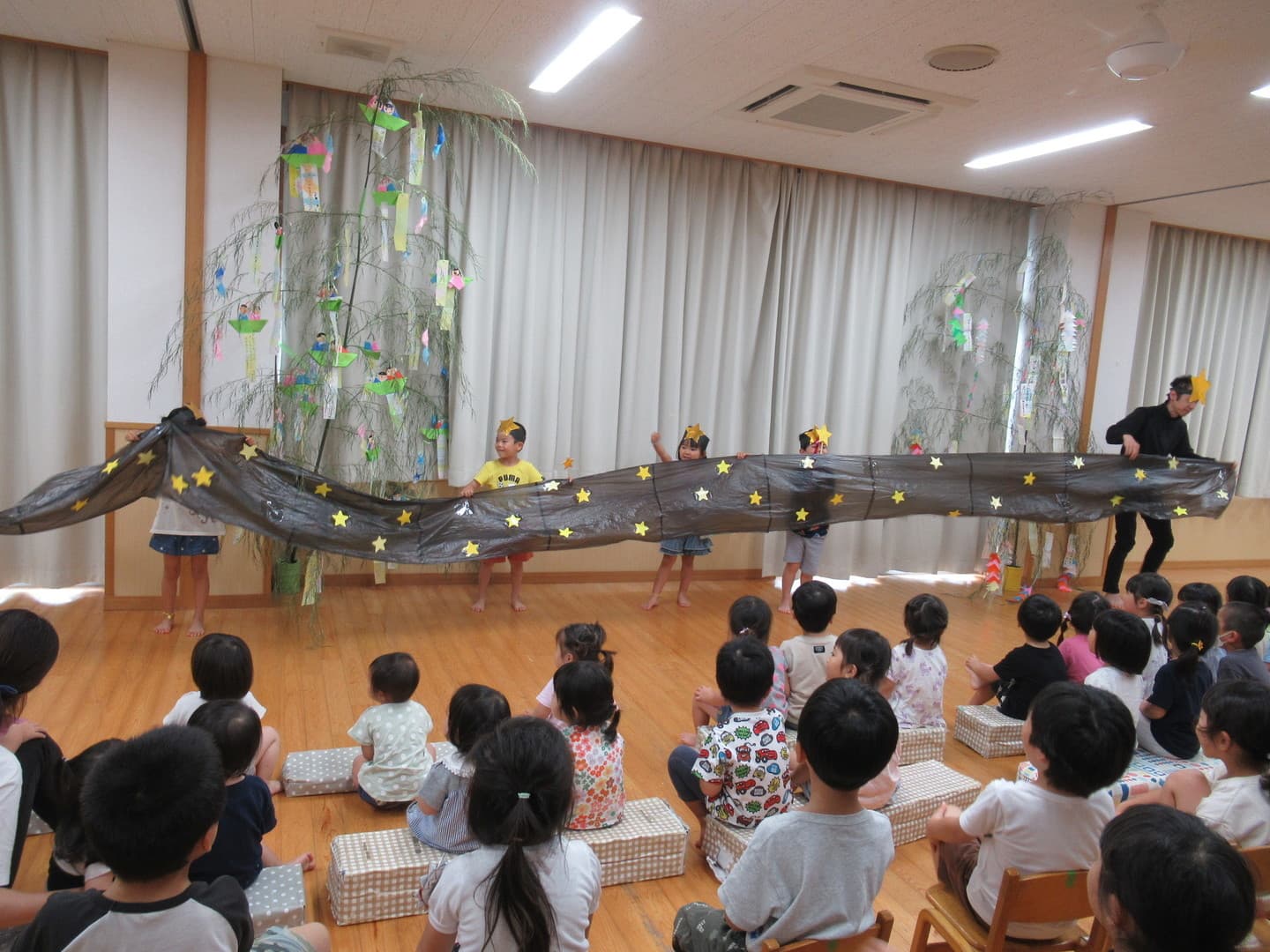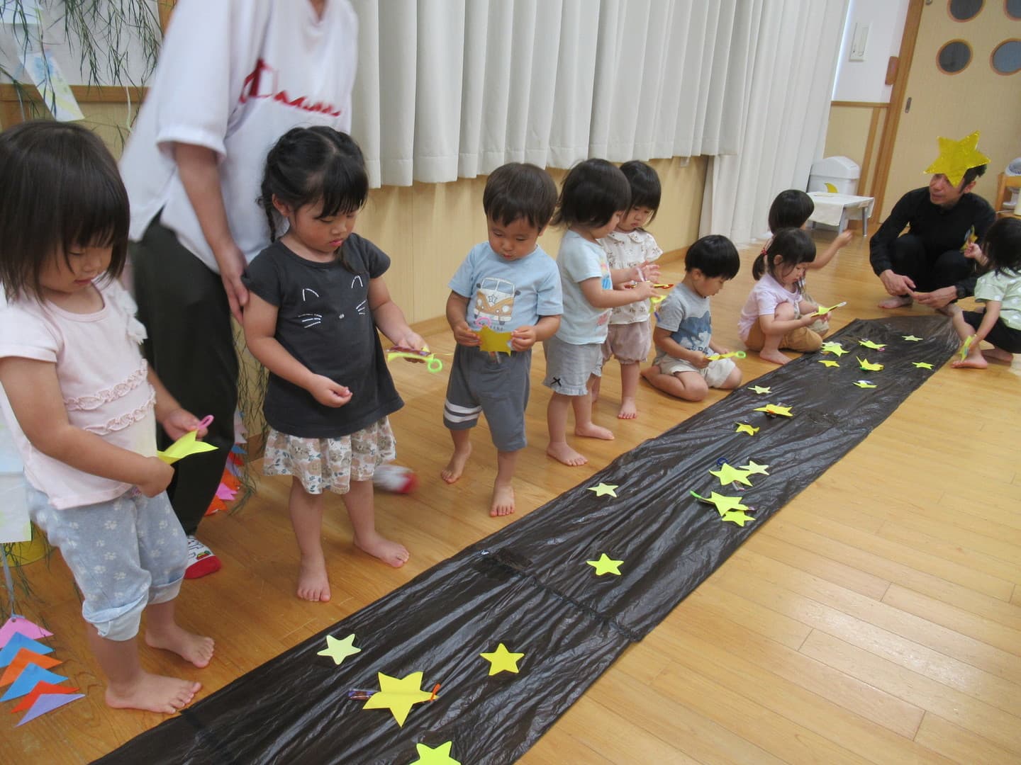 今日は7月7日の七夕です。こども園でも、笹に手作りの飾りや短冊を飾ったり、たなばたさまの歌を歌って当日を楽しみにしていました。今日は、みんなで手遊びをしたり、織姫と彦星のブラックシアターを見たり、願い事を発表していると、お星さまたちが天の川と一緒にやってきました☆お星さまゼリーのプレゼントもあり、みんな大喜び!楽しい七夕会になりました♪