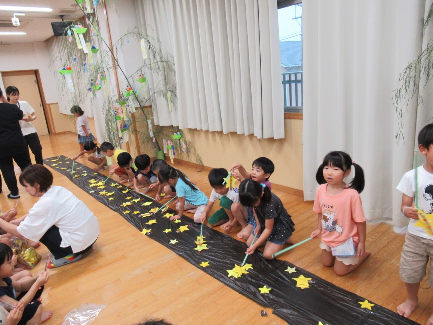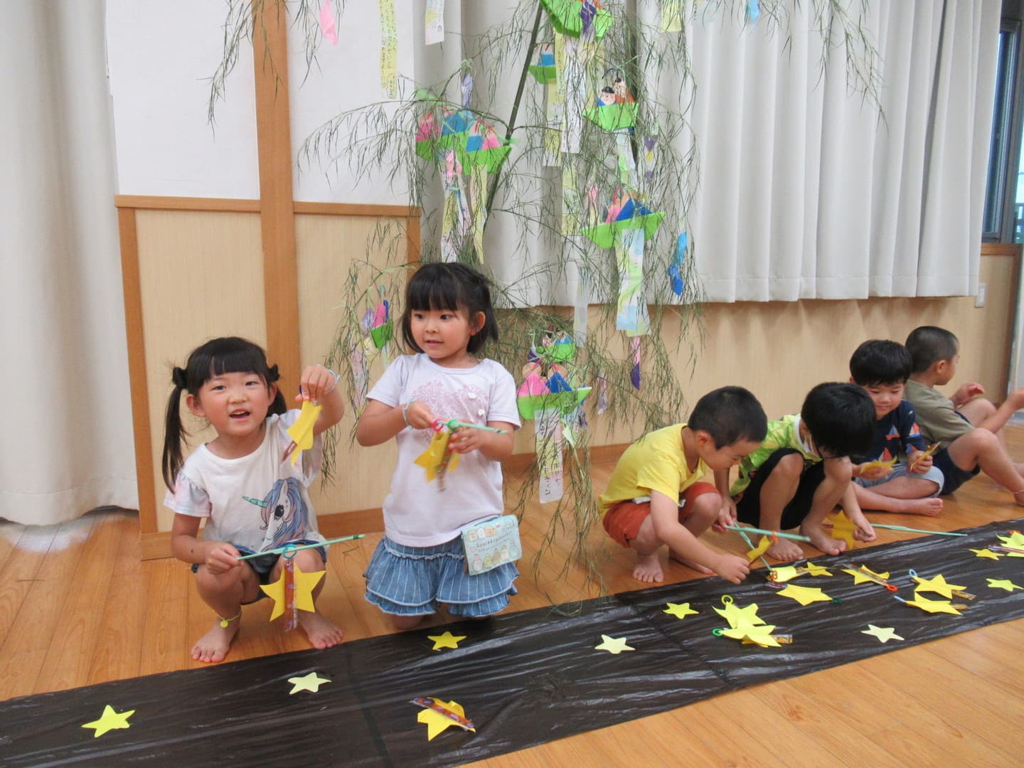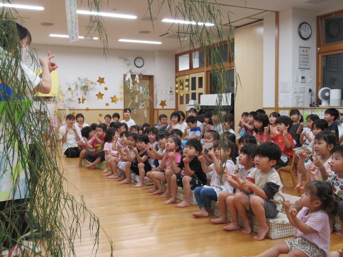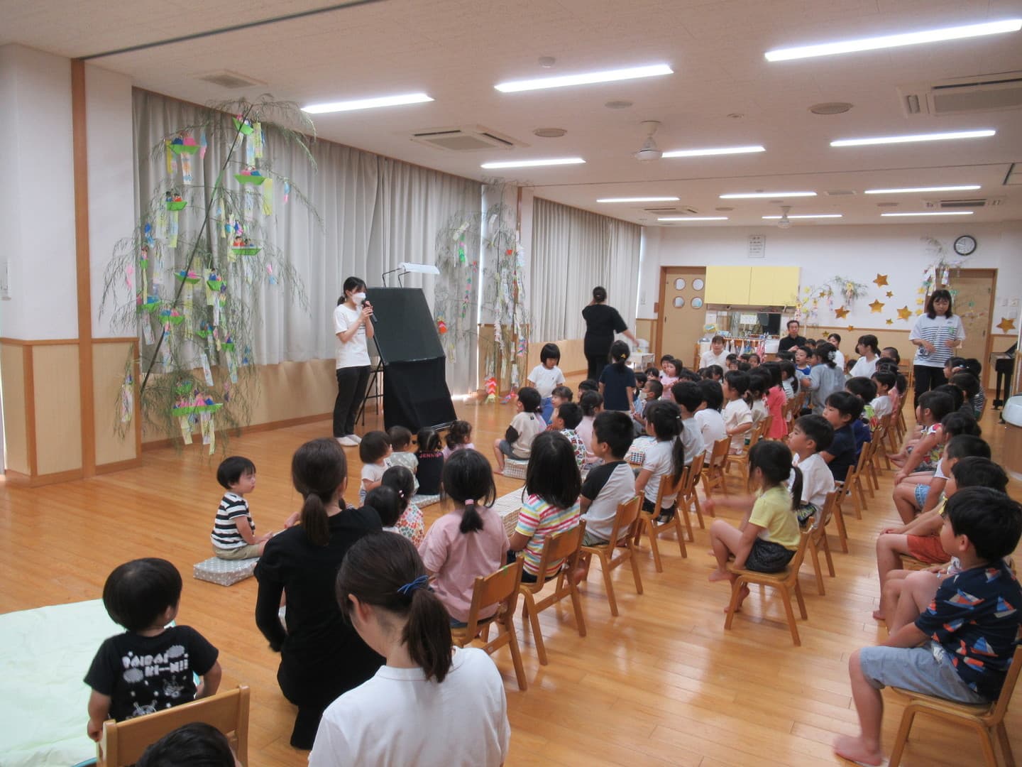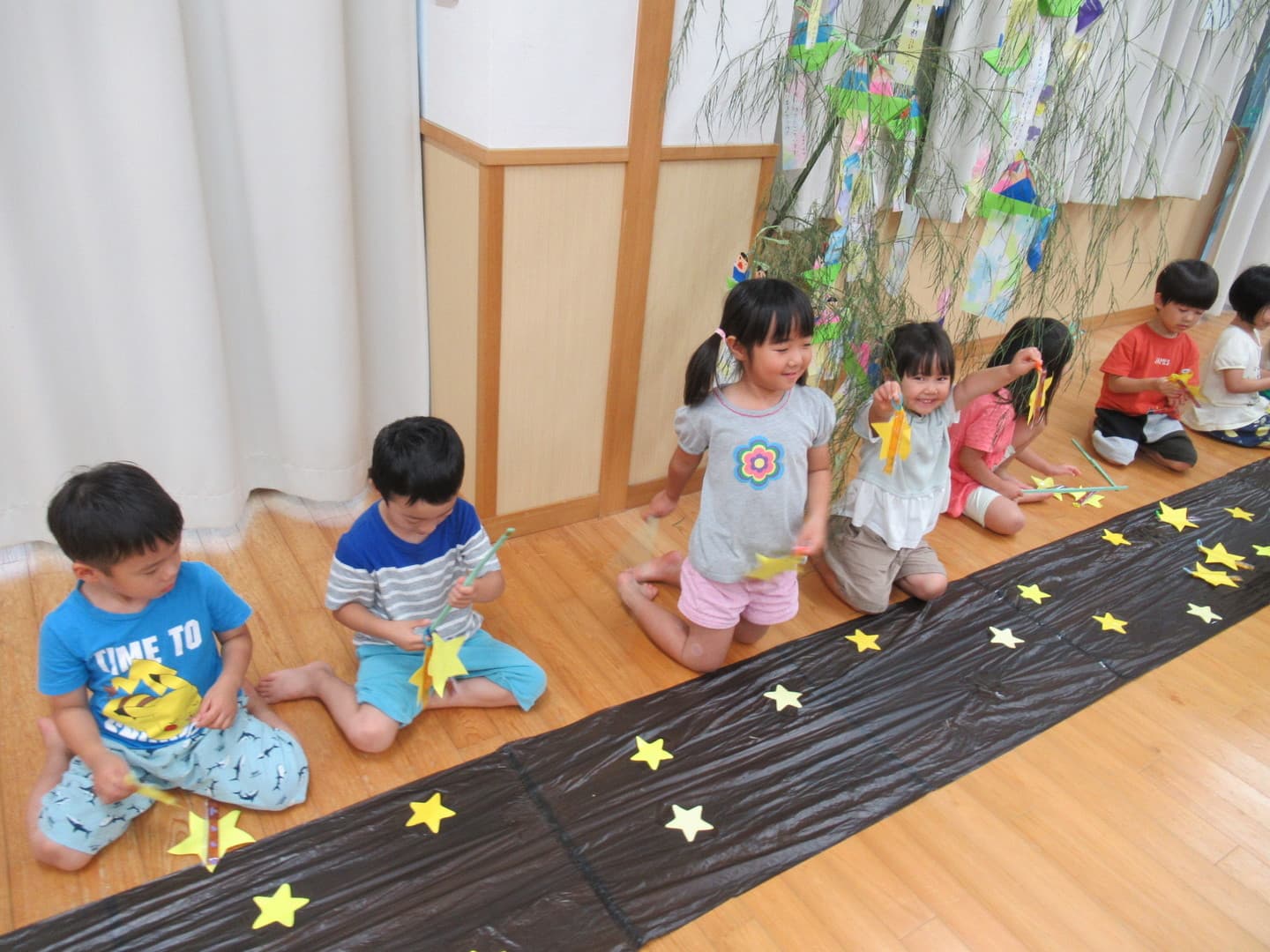 今日は7月7日の七夕です。こども園でも、笹に手作りの飾りや短冊を飾ったり、たなばたさまの歌を歌って当日を楽しみにしていました。今日は、みんなで手遊びをしたり、織姫と彦星のブラックシアターを見たり、願い事を発表していると、お星さまたちが天の川と一緒にやってきました☆お星さまゼリーのプレゼントもあり、みんな大喜び!楽しい七夕会になりました♪