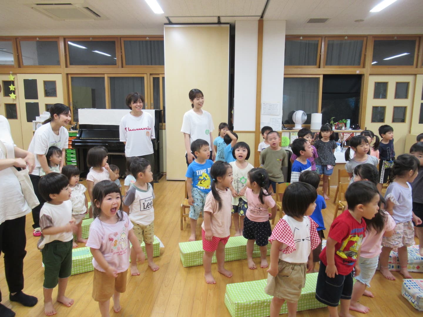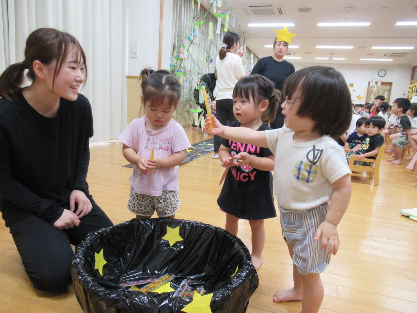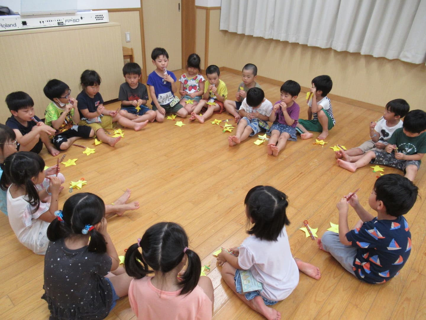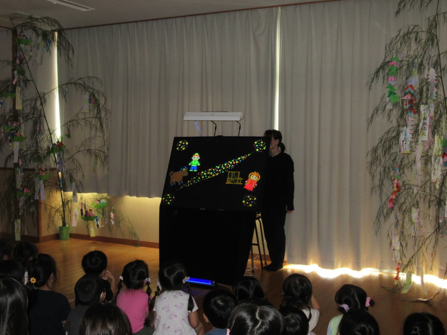 今日は7月7日の七夕です。こども園でも、笹に手作りの飾りや短冊を飾ったり、たなばたさまの歌を歌って当日を楽しみにしていました。今日は、みんなで手遊びをしたり、織姫と彦星のブラックシアターを見たり、願い事を発表していると、お星さまたちが天の川と一緒にやってきました☆お星さまゼリーのプレゼントもあり、みんな大喜び!楽しい七夕会になりました♪