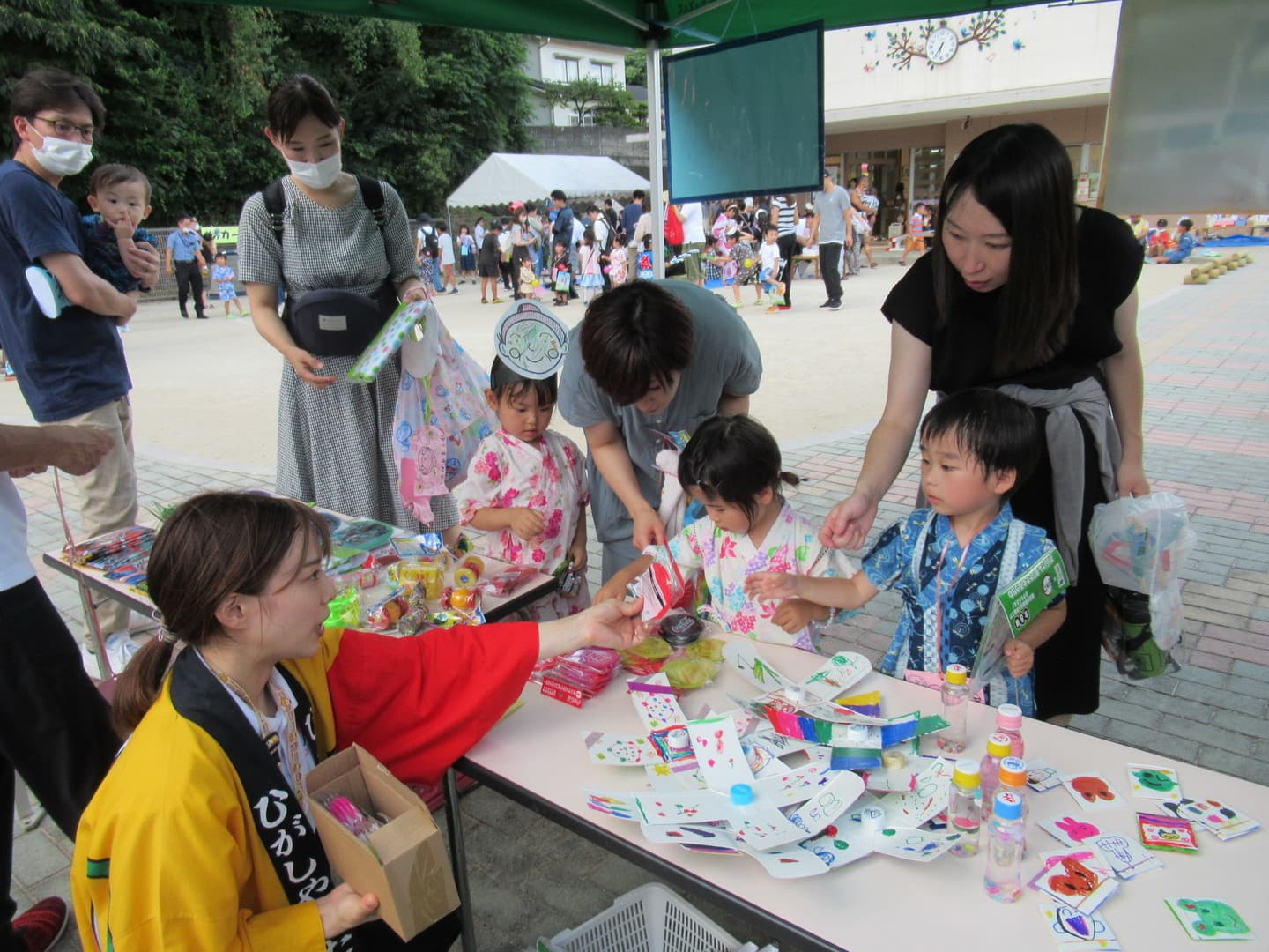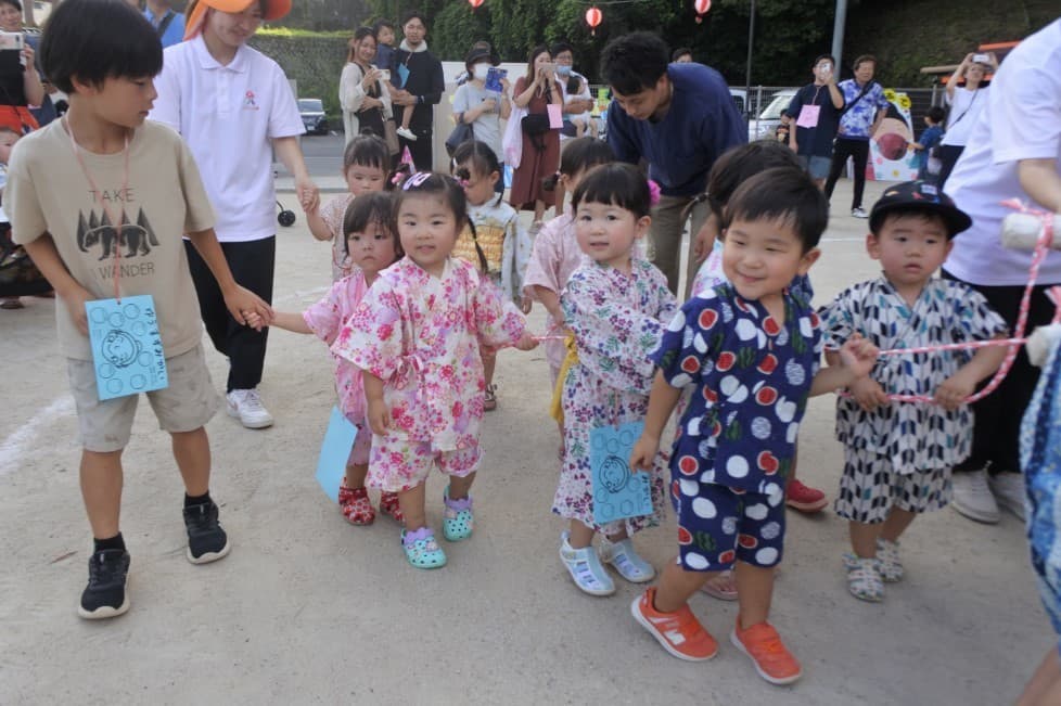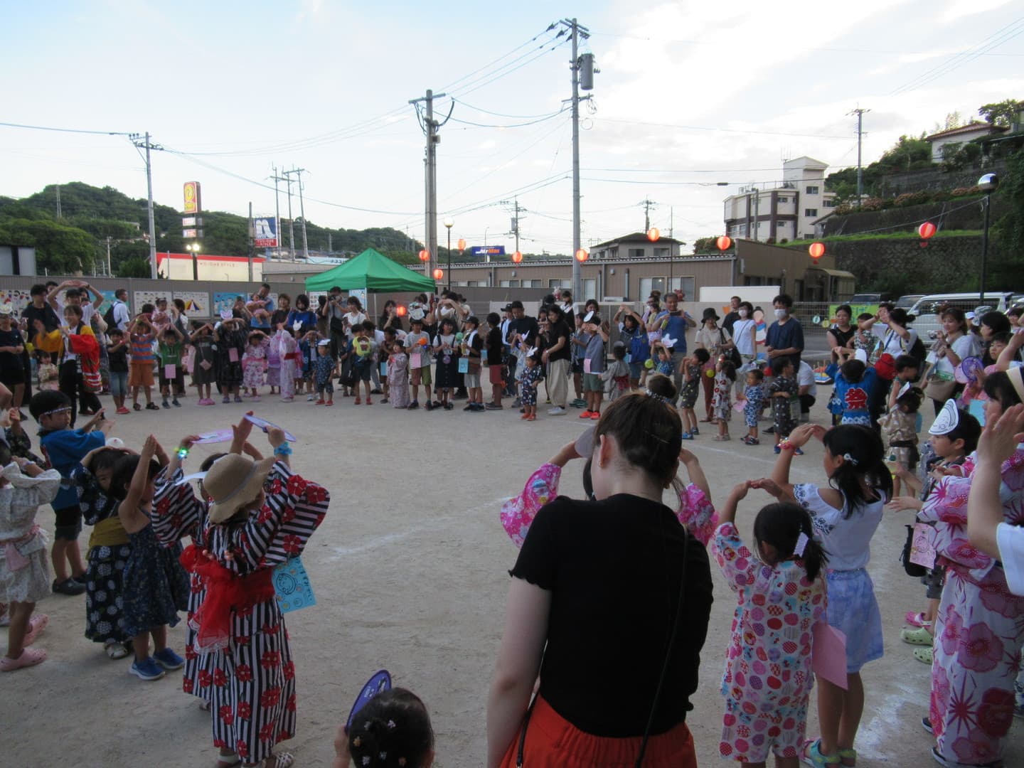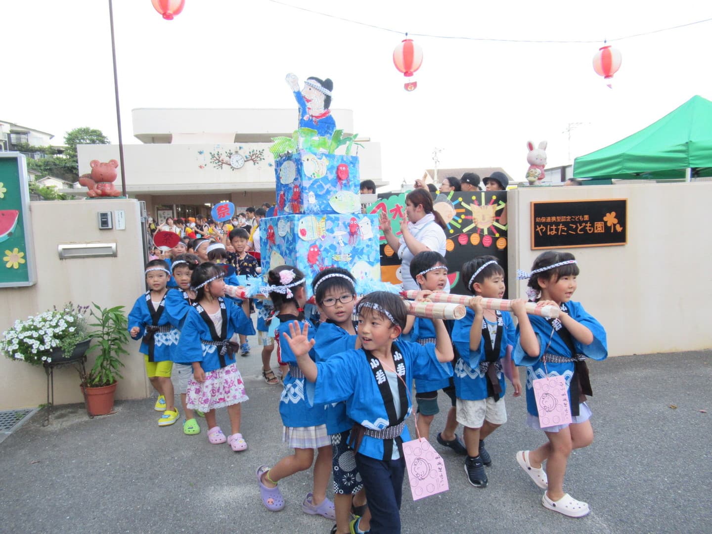今年は久しぶりに通常開催となり、1年生などたくさんの方が遊びに来てくれました。そら・たいよう組さんは、お神輿を担ぎ「わっしょい!わっしょい!」と元気な掛け声をあげて園周辺を練り歩き、近くの施設まで行きました。園内では、ゲームコーナーやバザーなどがあり、最後はみんなで盆踊り♪暑い中でしたが、夏の夕暮れのひと時を楽しく過ごすことができました。