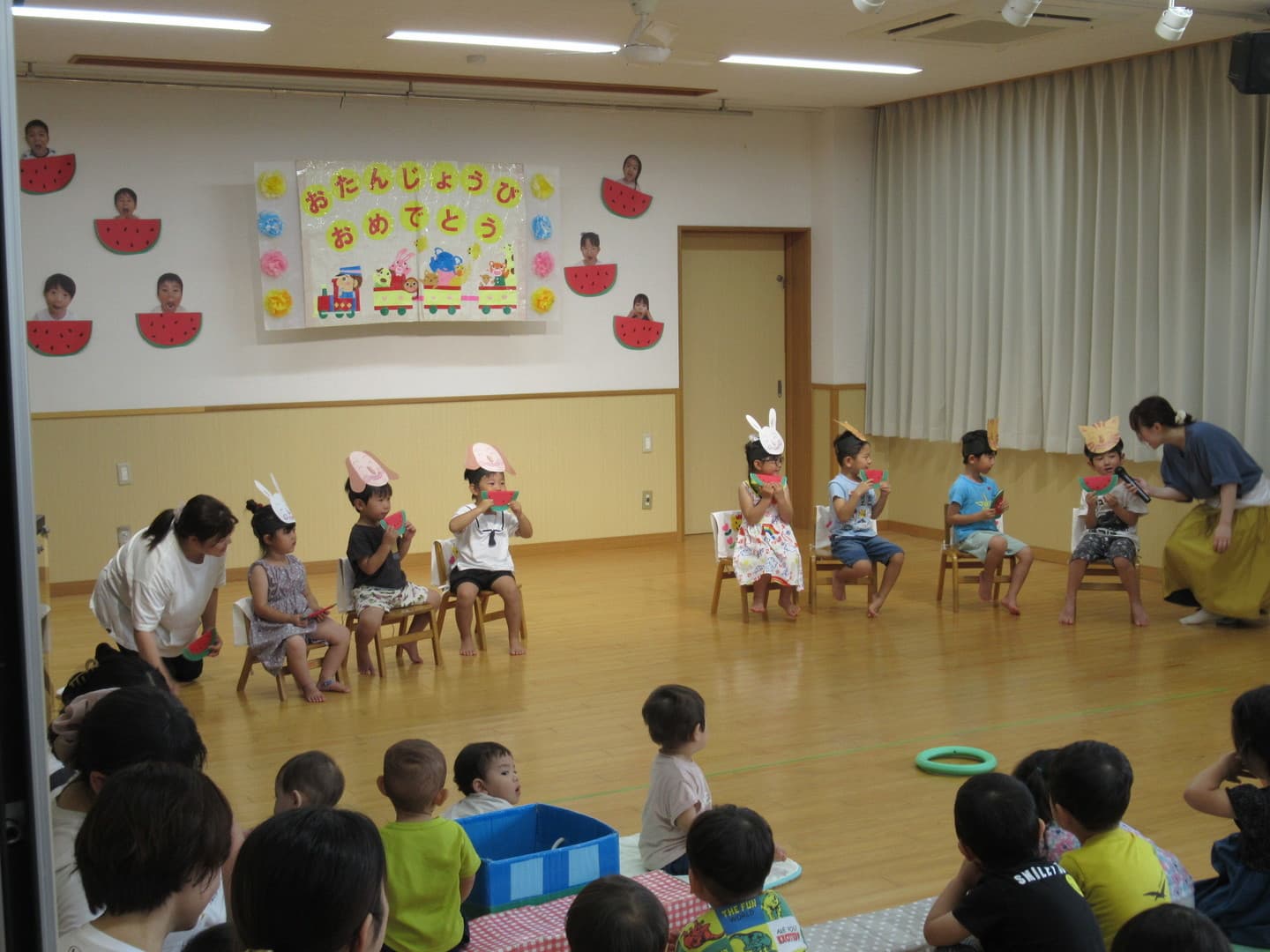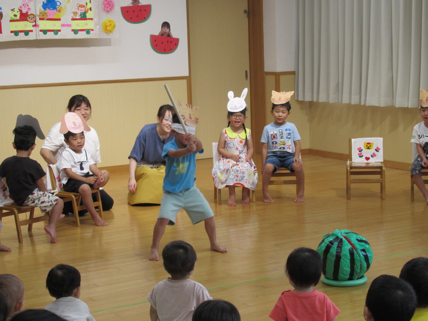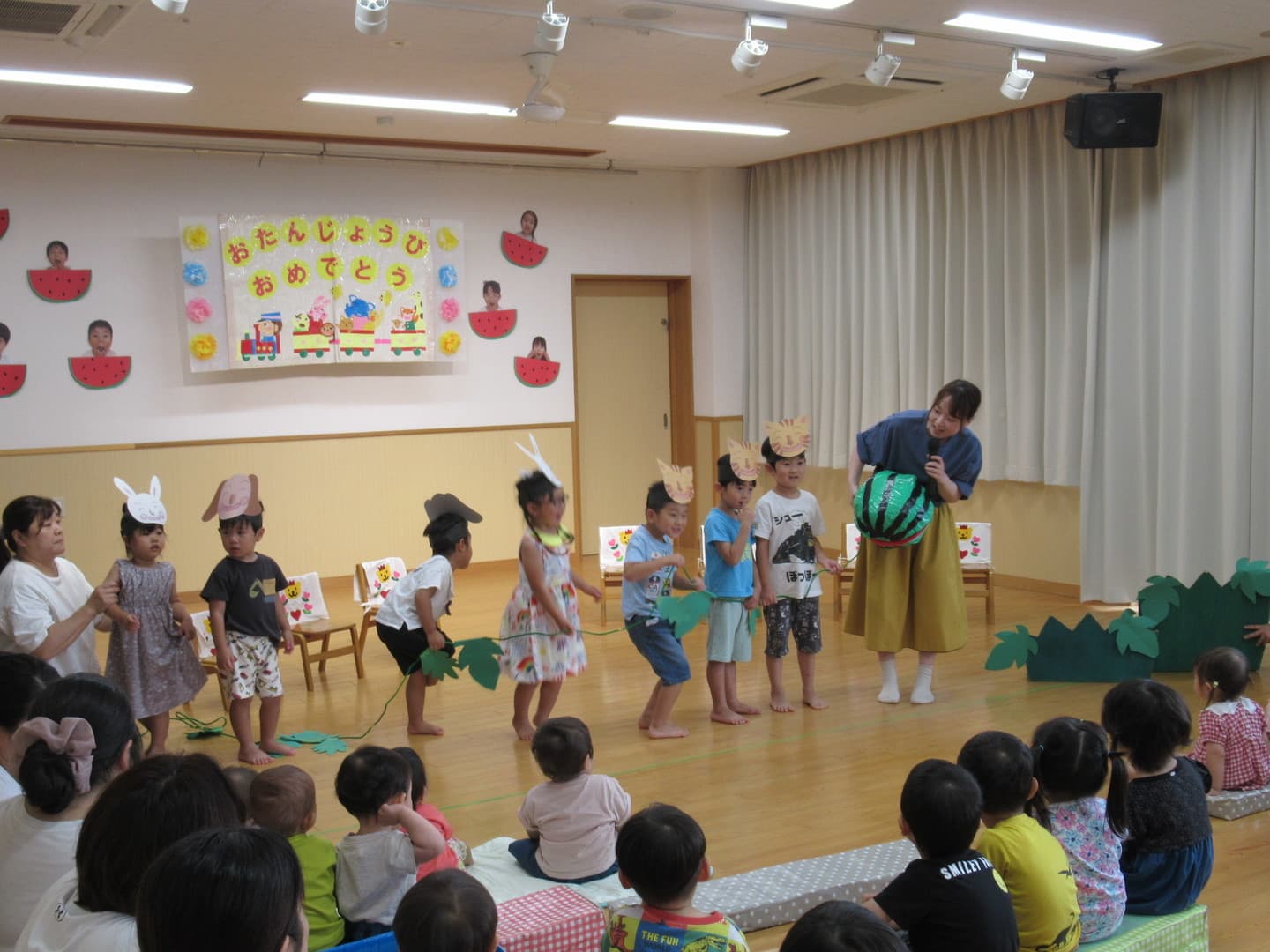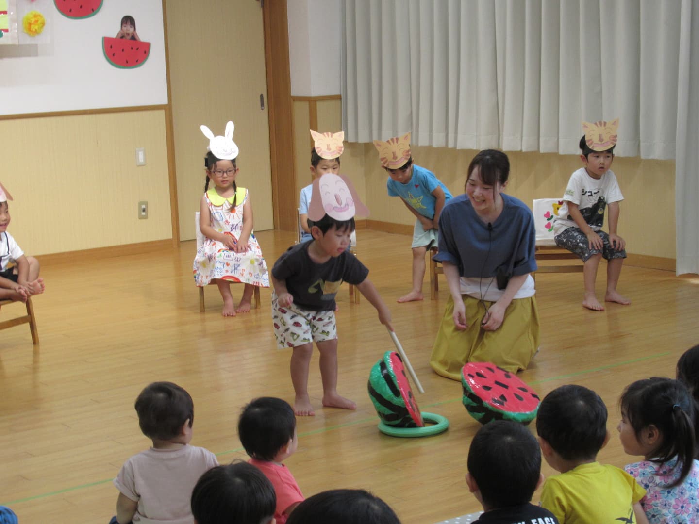 ばばばあちゃんが春に植えた種が大きく育ち、収穫しようとしましたが重たくてできません。困っていると動物たちがやって来て手伝ってくれました。力を合わせて蔓を引っ張ると出てきたのは大きなスイカ!みんなでスイカ割りをして食べたり、ケーキに飾って楽しい誕生会が始まりました。給食にもスイカが出たので、喜んでいましたよ。