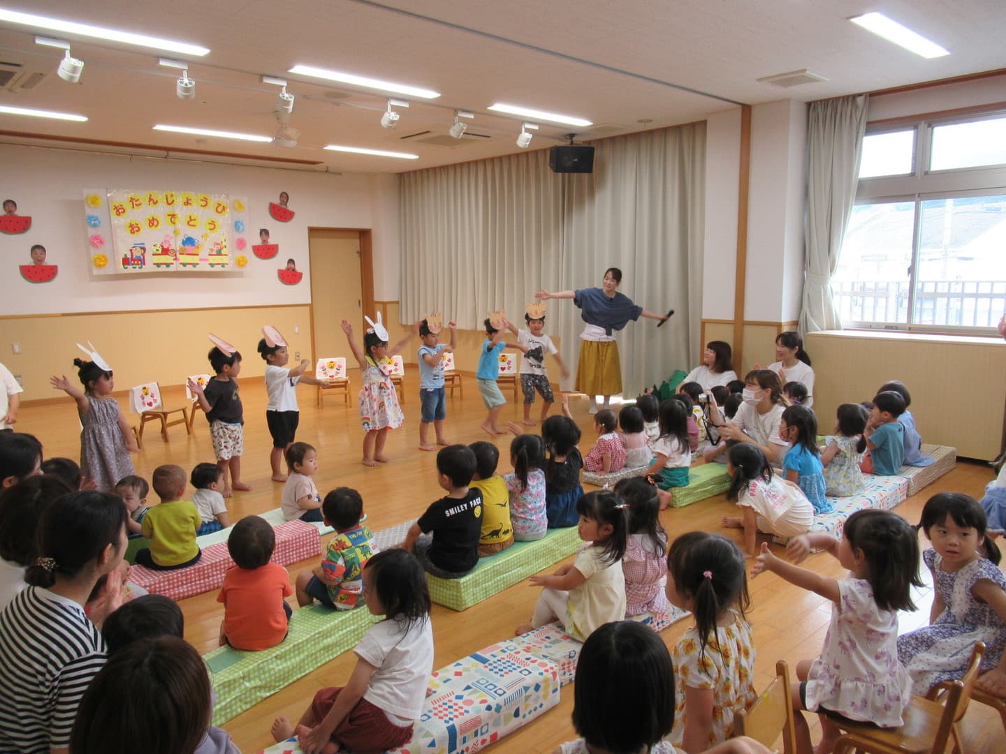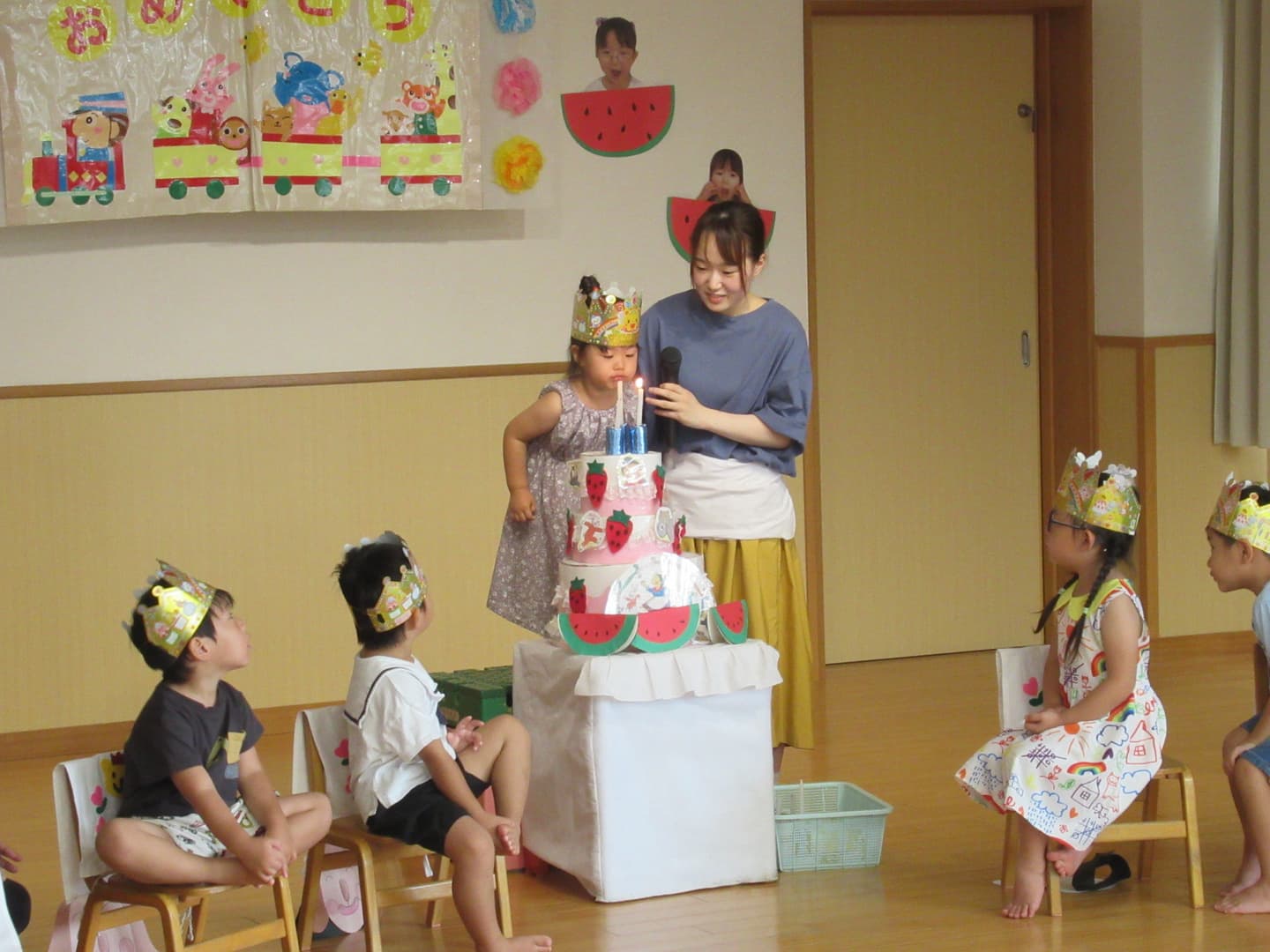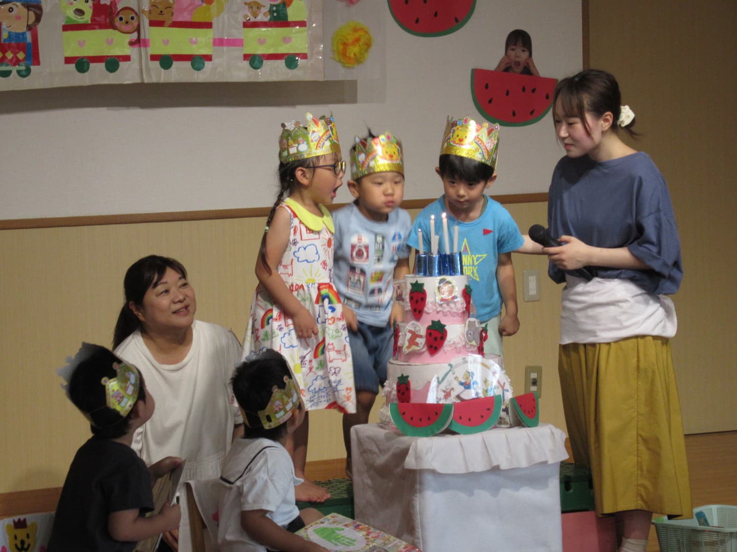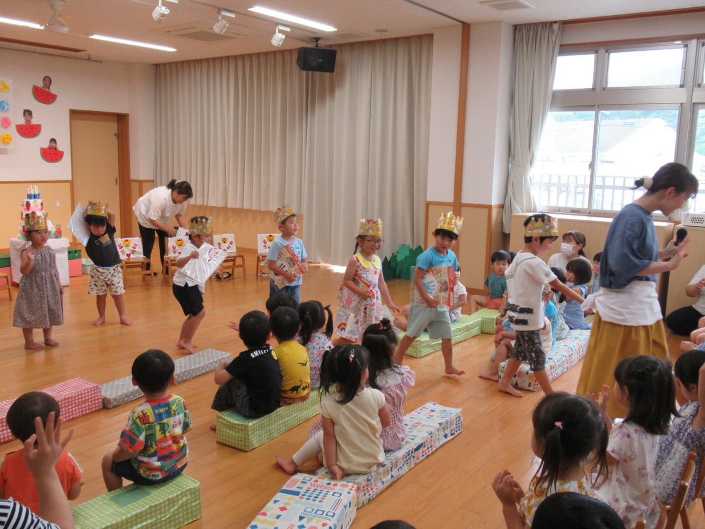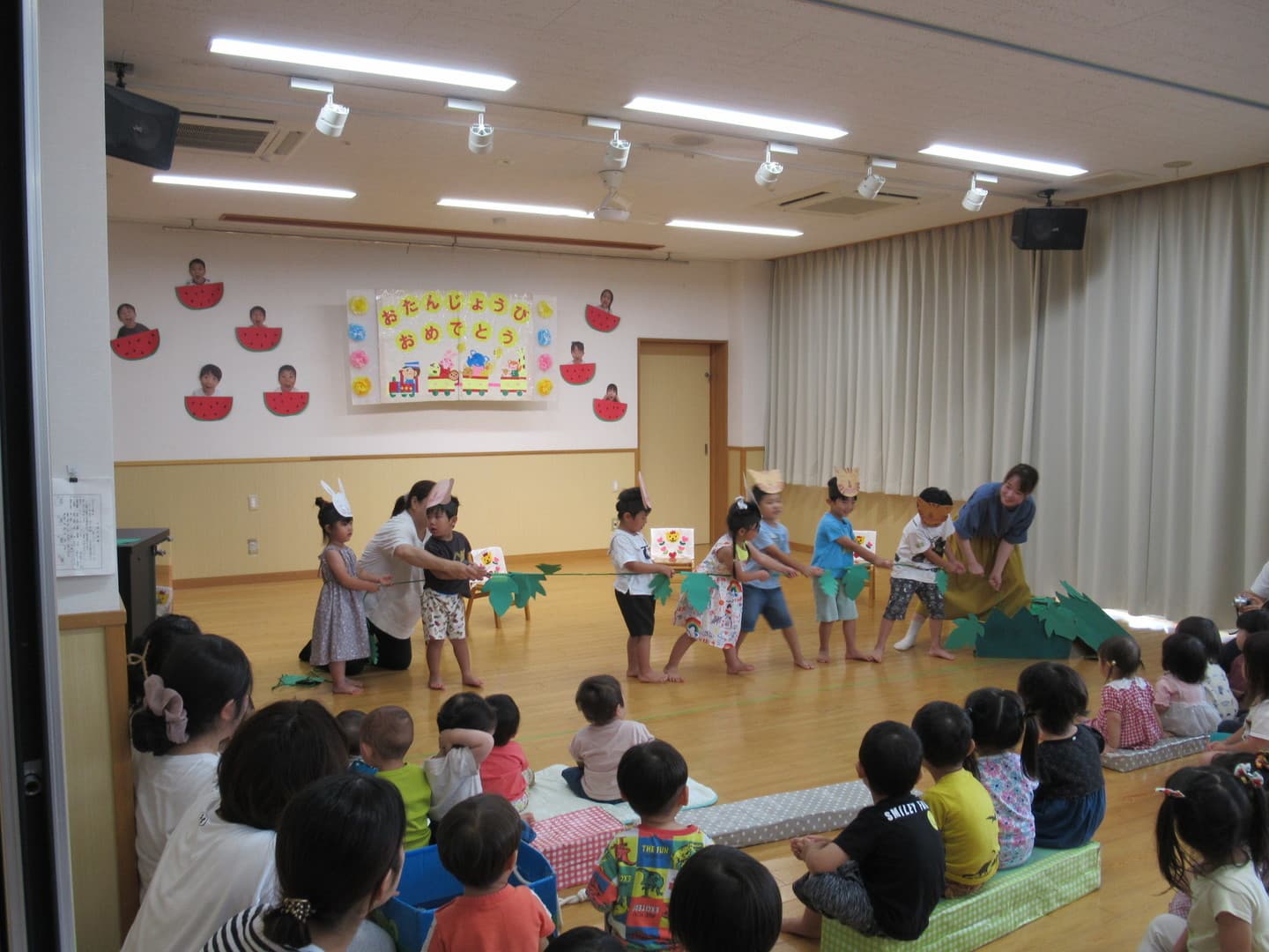ばばばあちゃんが春に植えた種が大きく育ち、収穫しようとしましたが重たくてできません。困っていると動物たちがやって来て手伝ってくれました。力を合わせて蔓を引っ張ると出てきたのは大きなスイカ!みんなでスイカ割りをして食べたり、ケーキに飾って楽しい誕生会が始まりました。給食にもスイカが出たので、喜んでいましたよ。