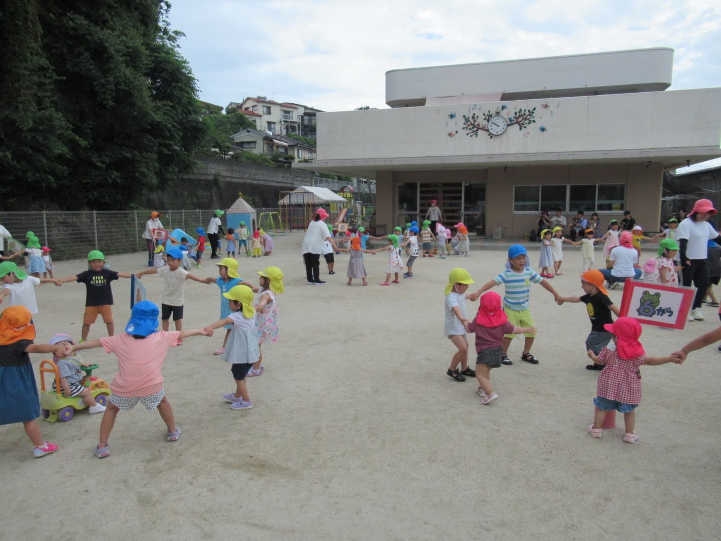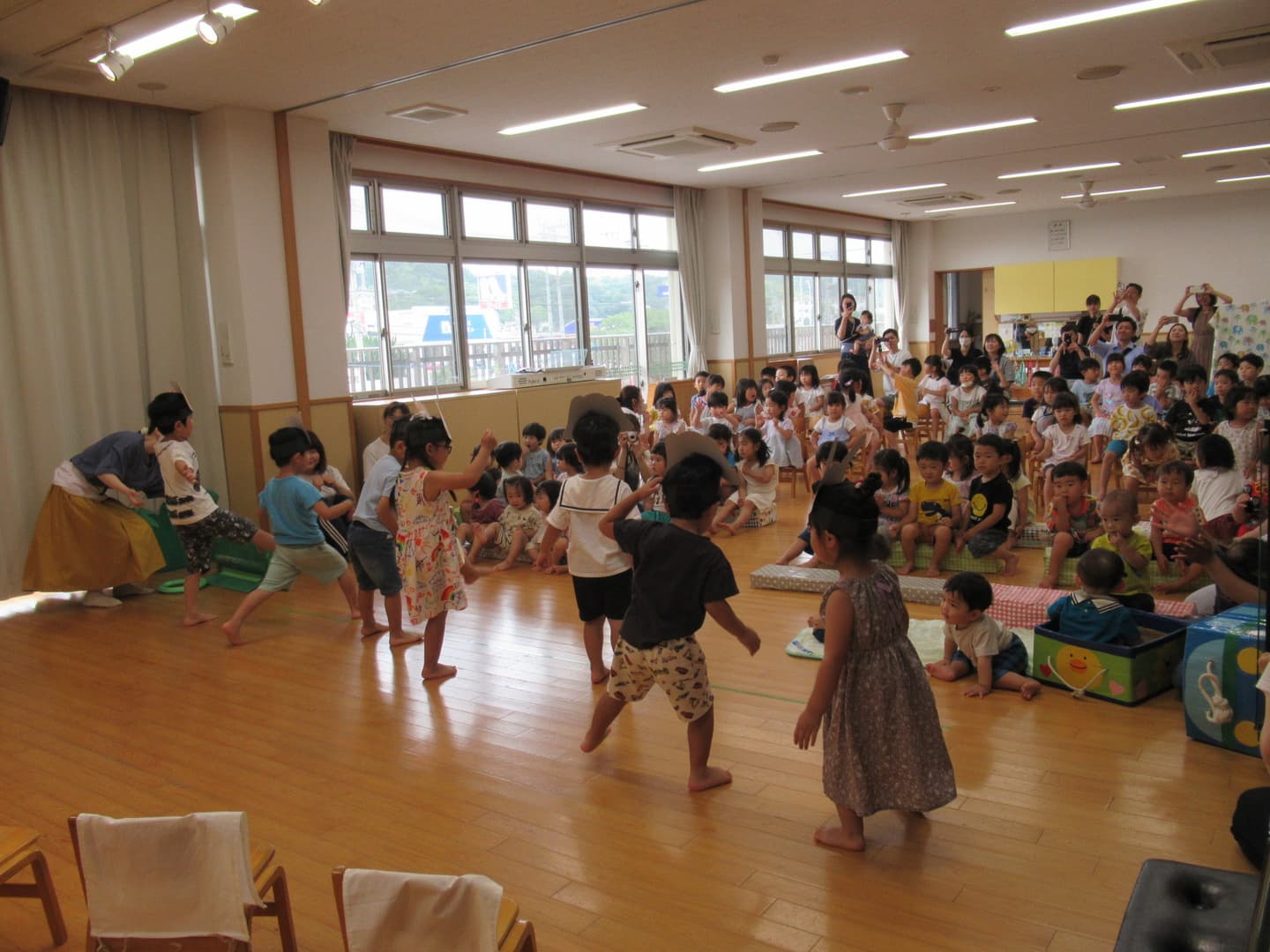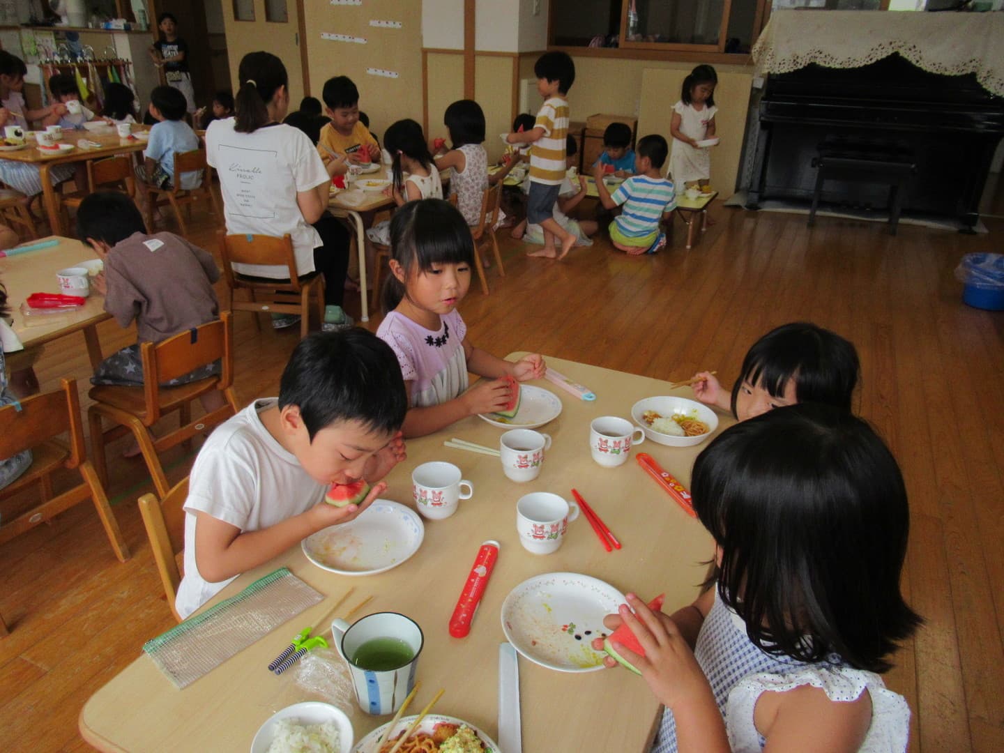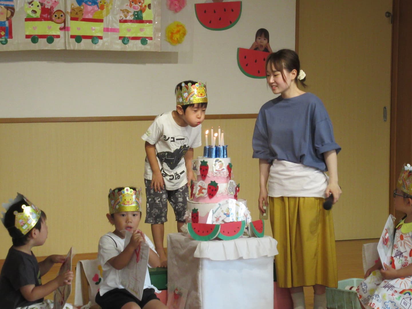 ばばばあちゃんが春に植えた種が大きく育ち、収穫しようとしましたが重たくてできません。困っていると動物たちがやって来て手伝ってくれました。力を合わせて蔓を引っ張ると出てきたのは大きなスイカ!みんなでスイカ割りをして食べたり、ケーキに飾って楽しい誕生会が始まりました。給食にもスイカが出たので、喜んでいましたよ。
