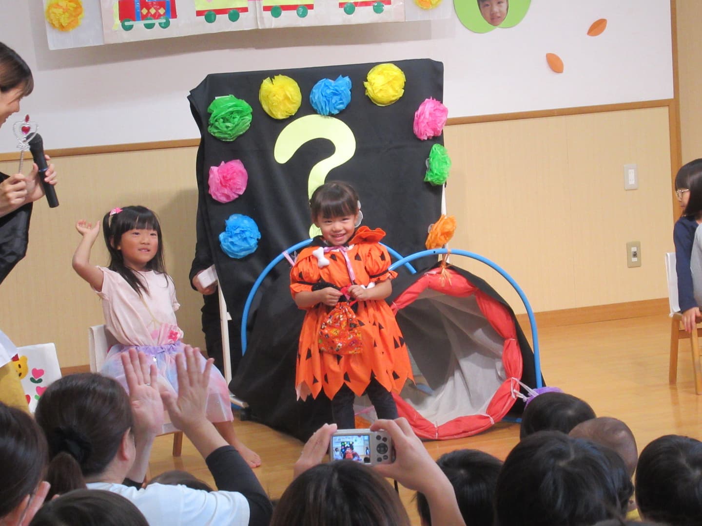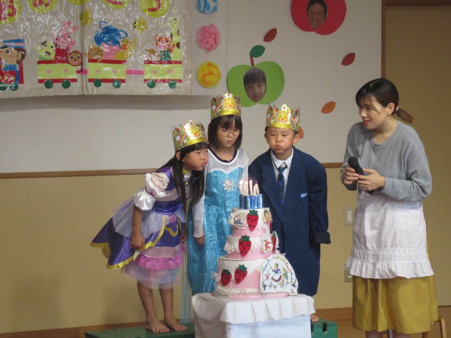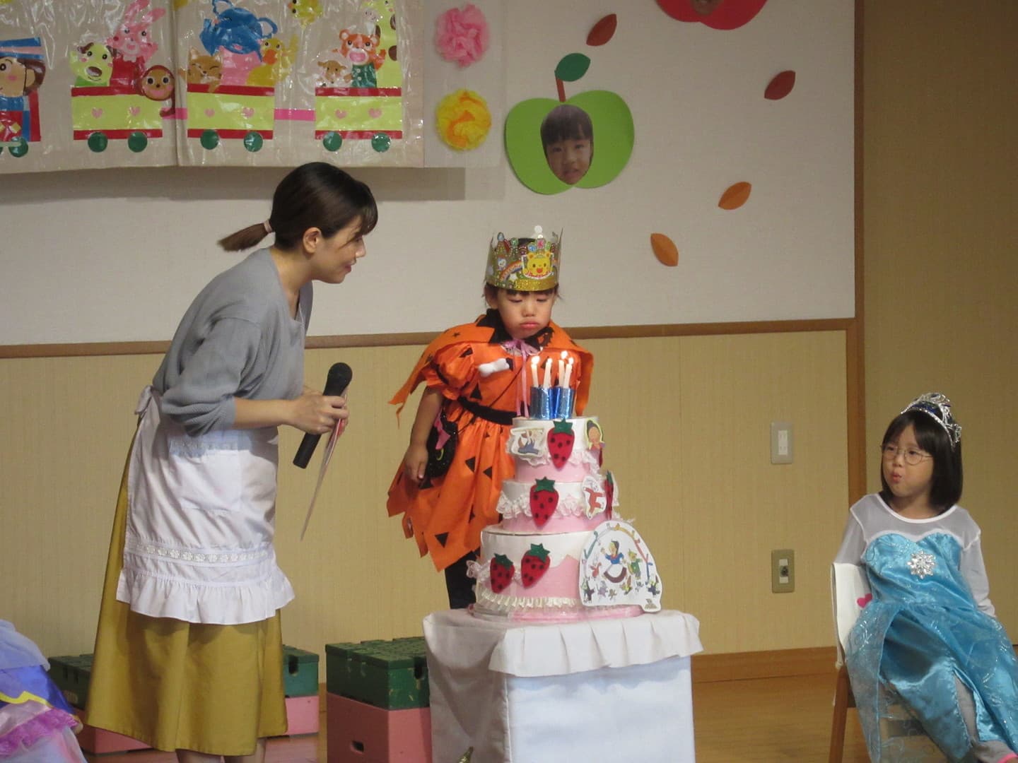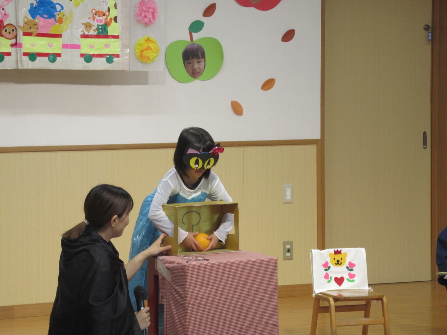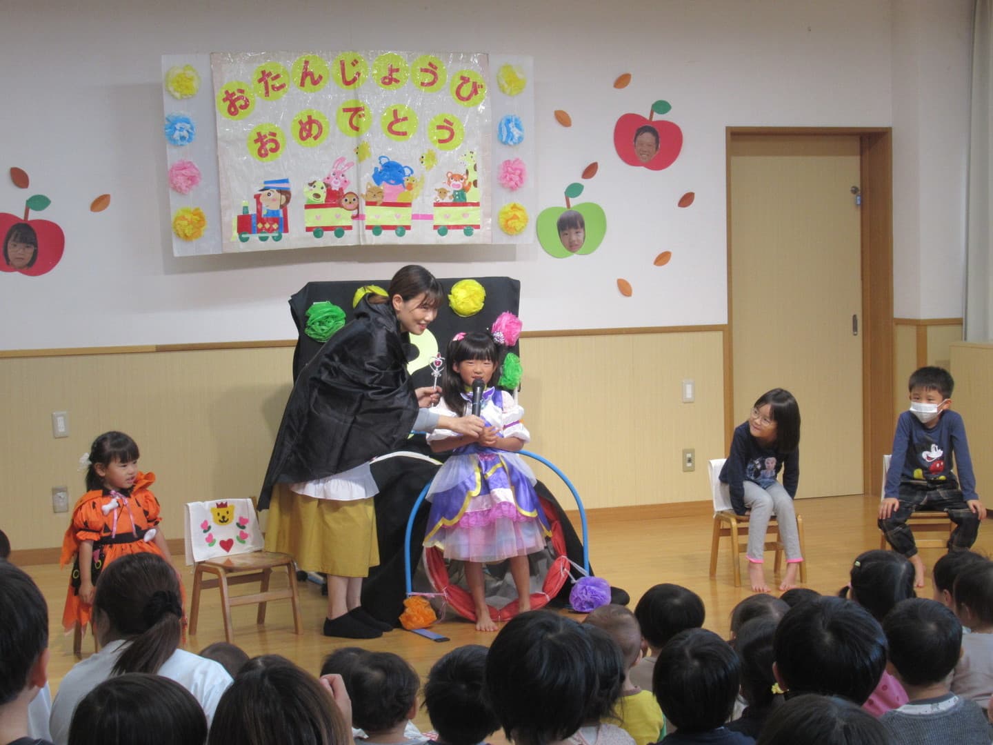 “まほう”の手遊びをして、“へんしんトンネル”の絵本を見たら、今日だけ魔法が使えるようになったばばばあちゃんがやって来ました。不思議なトンネルに魔法をかけると、誕生日のお友だちがそれぞれなりたい姿に変身することができました!その後も、箱の中身当てクイズやつき組さんから歌のプレゼントがあり、楽しい誕生会になりました。バイキング給食はおかわりをしてたくさん食べていましたよ。