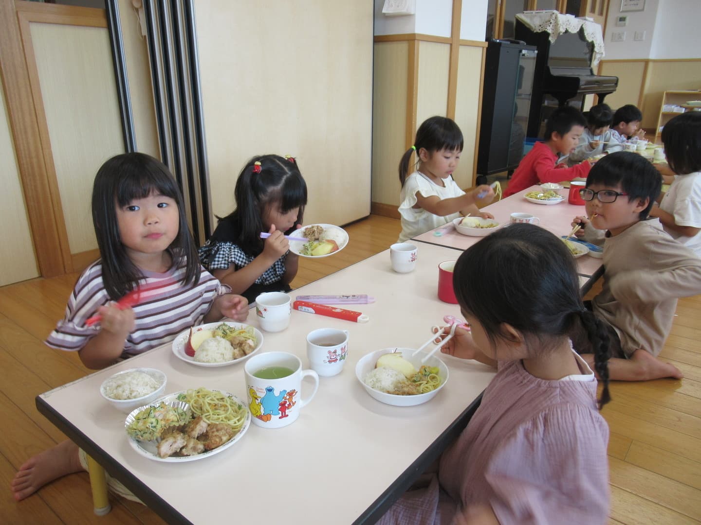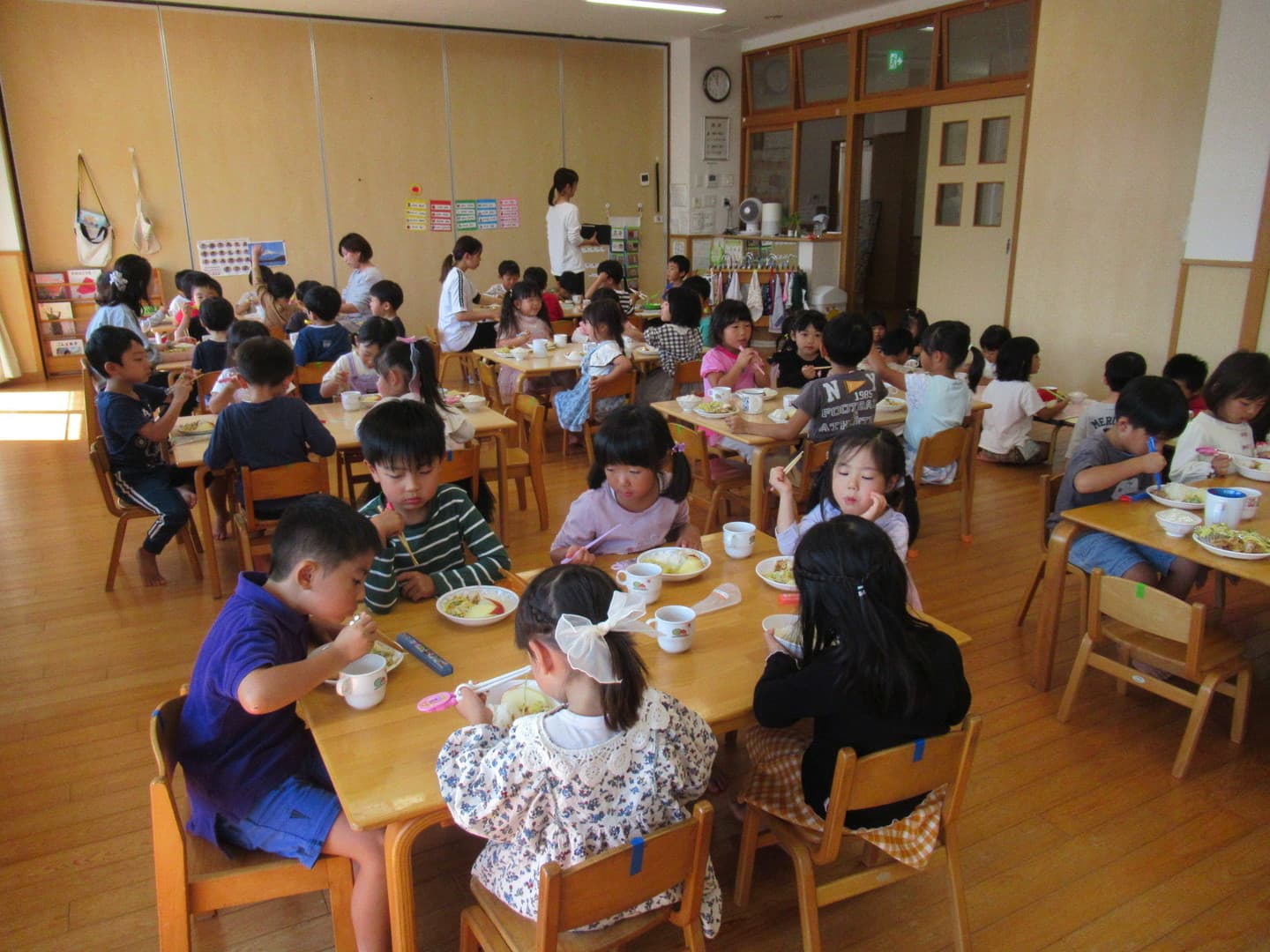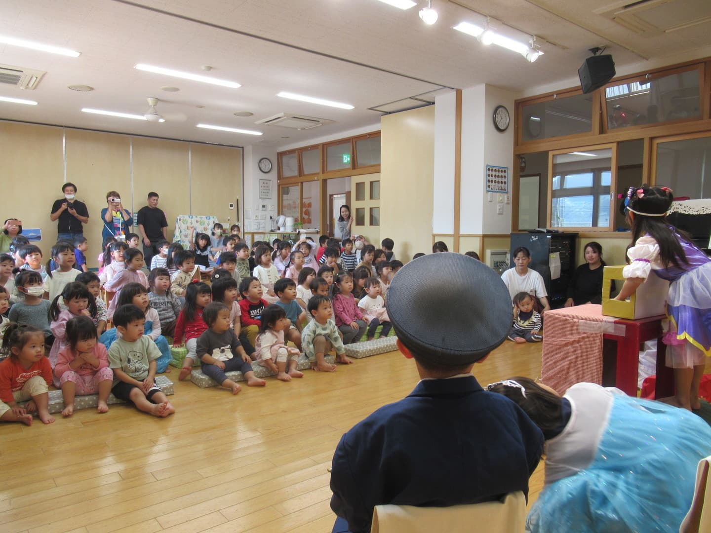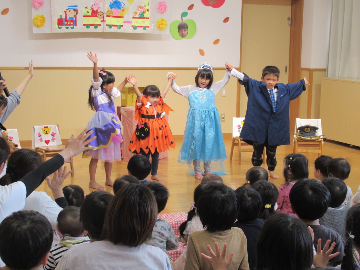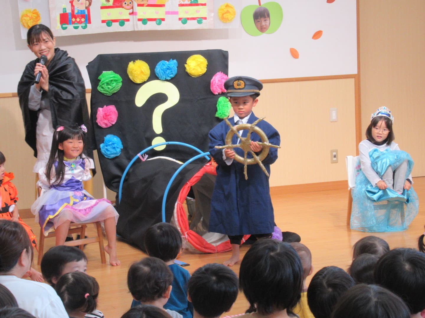 “まほう”の手遊びをして、“へんしんトンネル”の絵本を見たら、今日だけ魔法が使えるようになったばばばあちゃんがやって来ました。不思議なトンネルに魔法をかけると、誕生日のお友だちがそれぞれなりたい姿に変身することができました!その後も、箱の中身当てクイズやつき組さんから歌のプレゼントがあり、楽しい誕生会になりました。バイキング給食はおかわりをしてたくさん食べていましたよ。