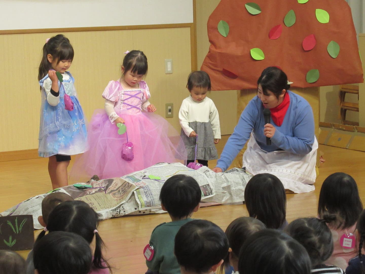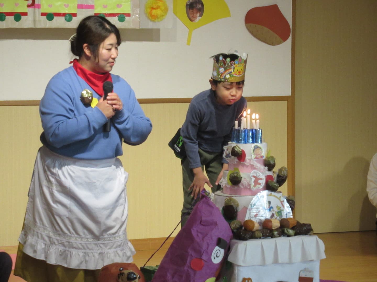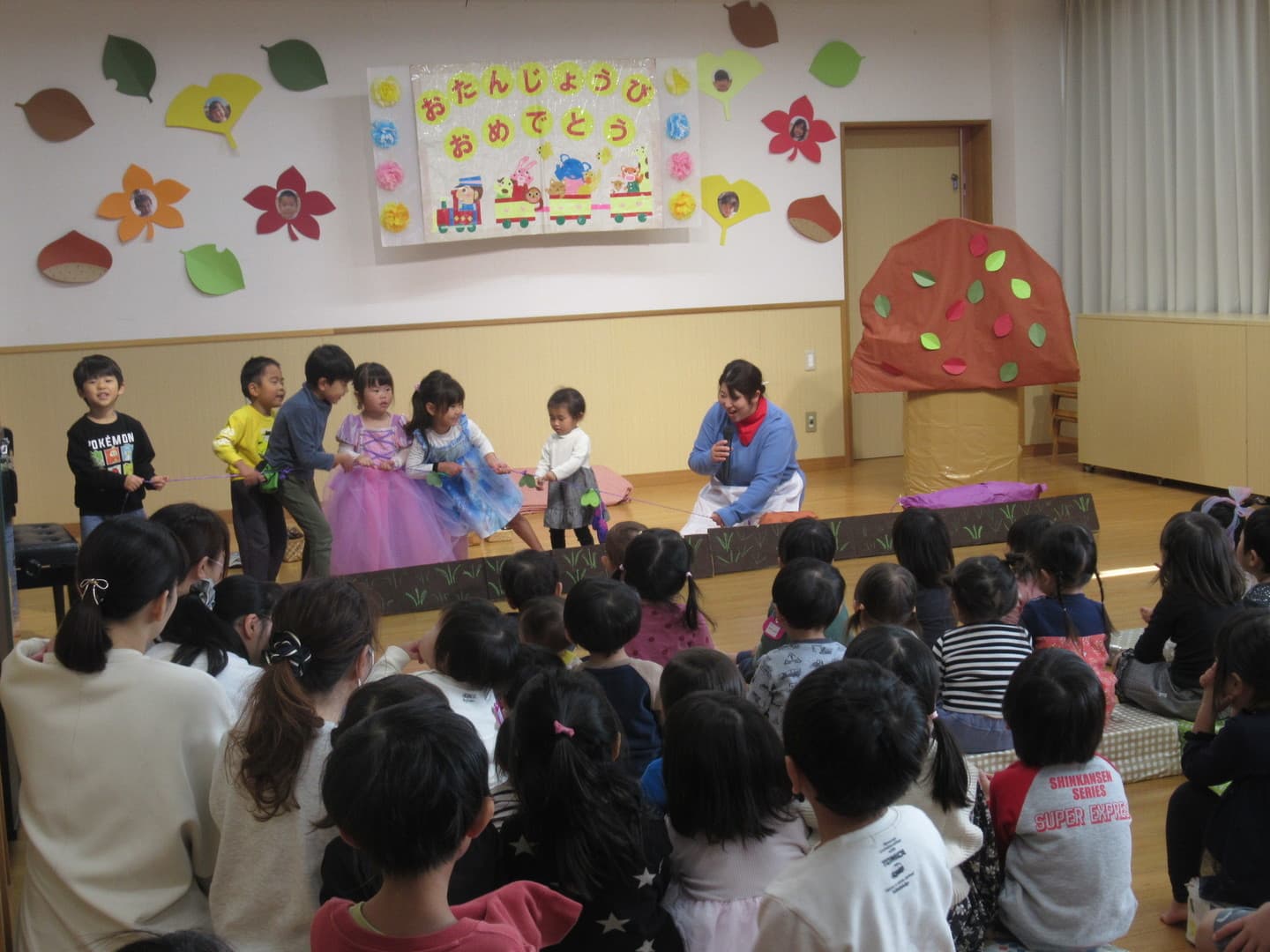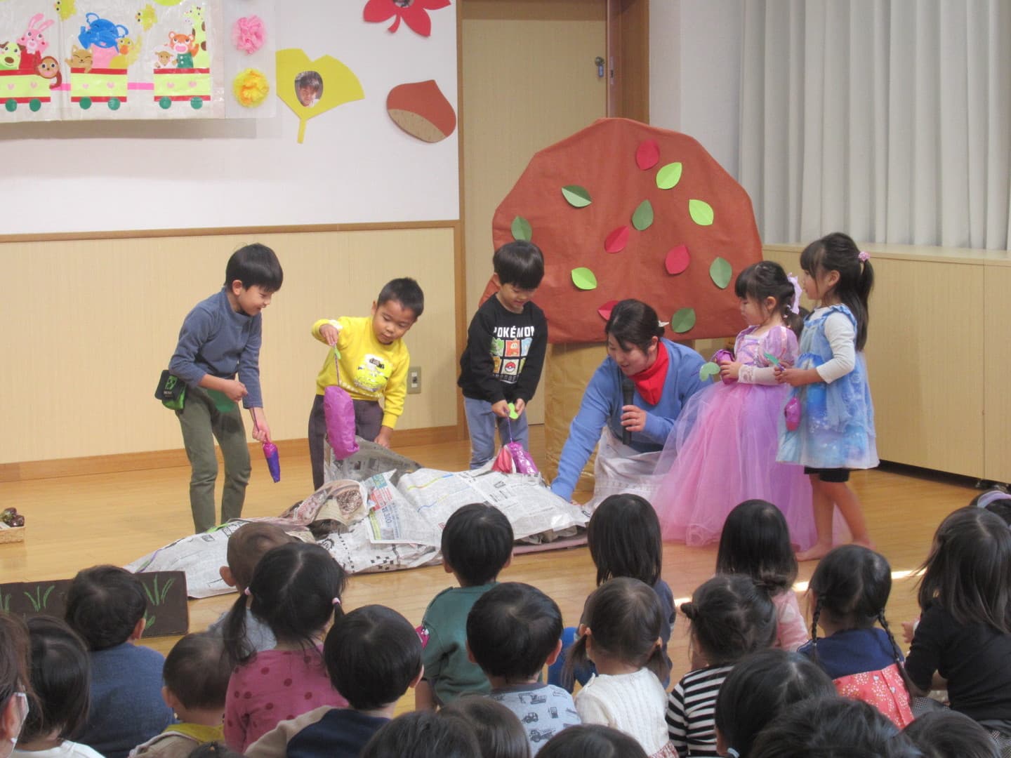 「さつまのおいも」の紙芝居を見たあと、困った様子のばばばあちゃんがやって来ました。せっかくのお誕生日会なのに楽しことが思い付かない・・・と困っていると、6人のお誕生児さんが来て、一緒に秋探しに行くことに!どんぐりを拾ったり、お芋掘りをして、楽しい秋探しをすることが出来ました。