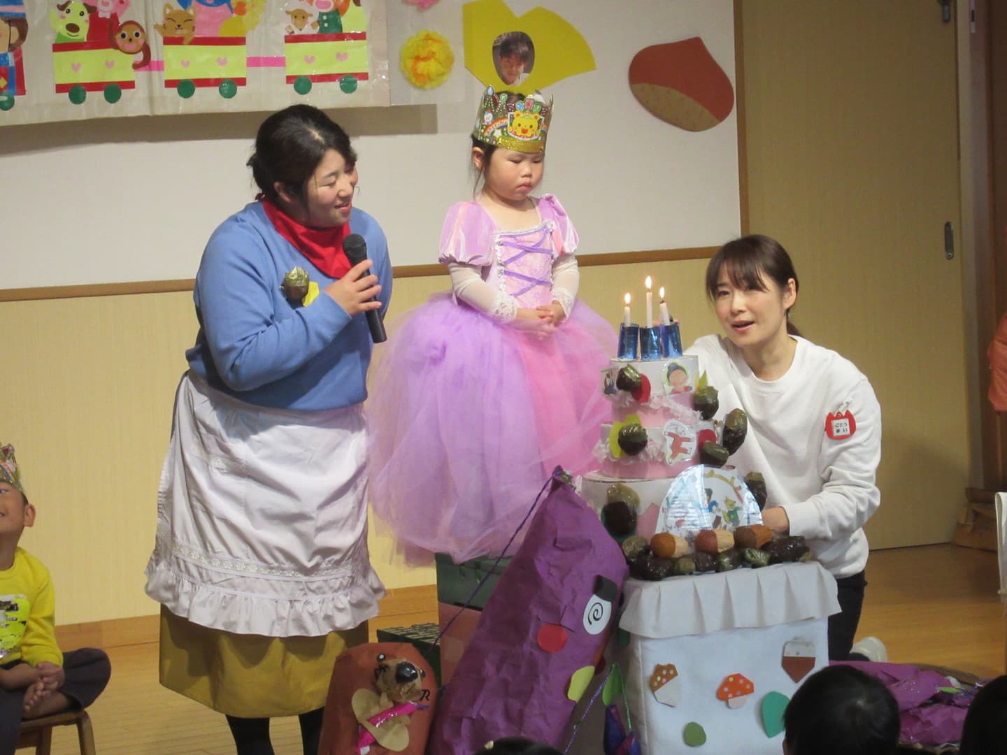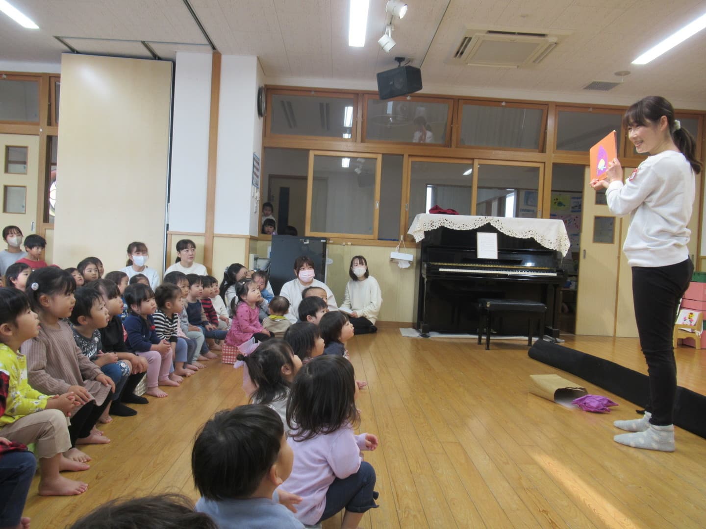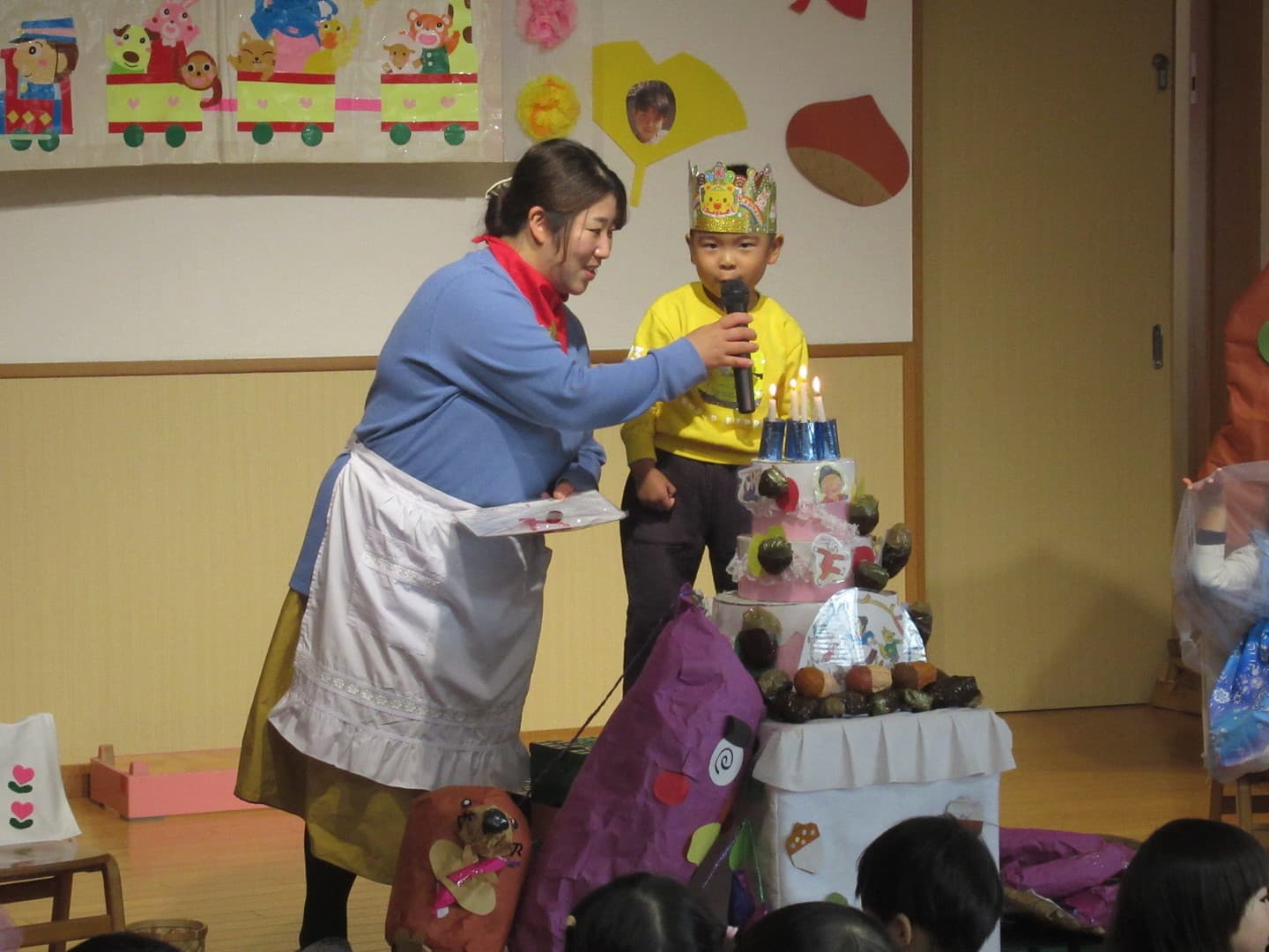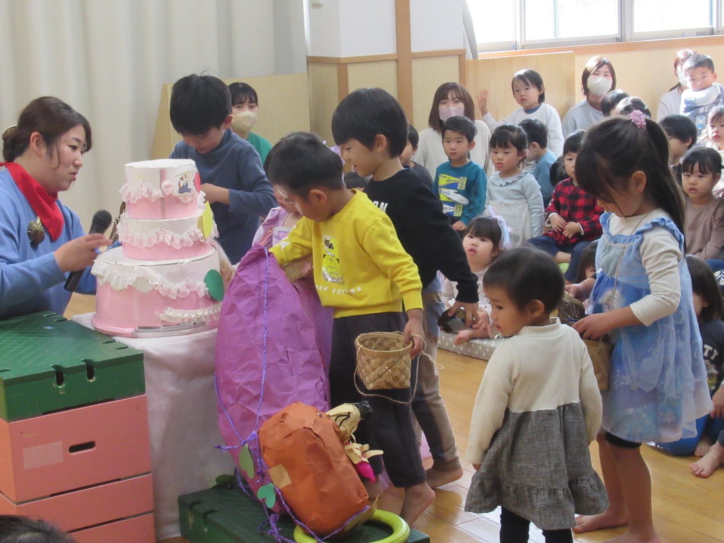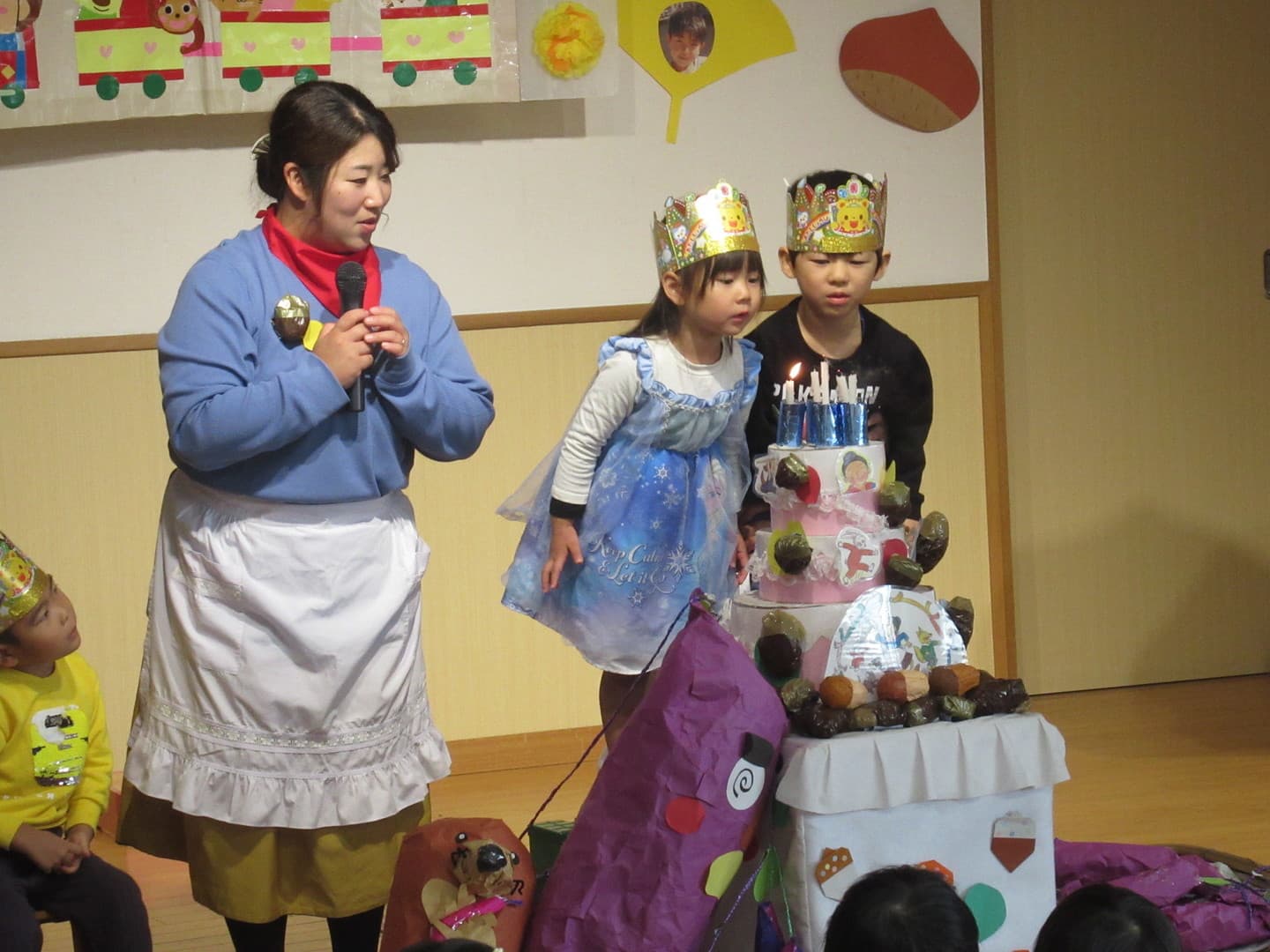 「さつまのおいも」の紙芝居を見たあと、困った様子のばばばあちゃんがやって来ました。せっかくのお誕生日会なのに楽しことが思い付かない・・・と困っていると、6人のお誕生児さんが来て、一緒に秋探しに行くことに!どんぐりを拾ったり、お芋掘りをして、楽しい秋探しをすることが出来ました。