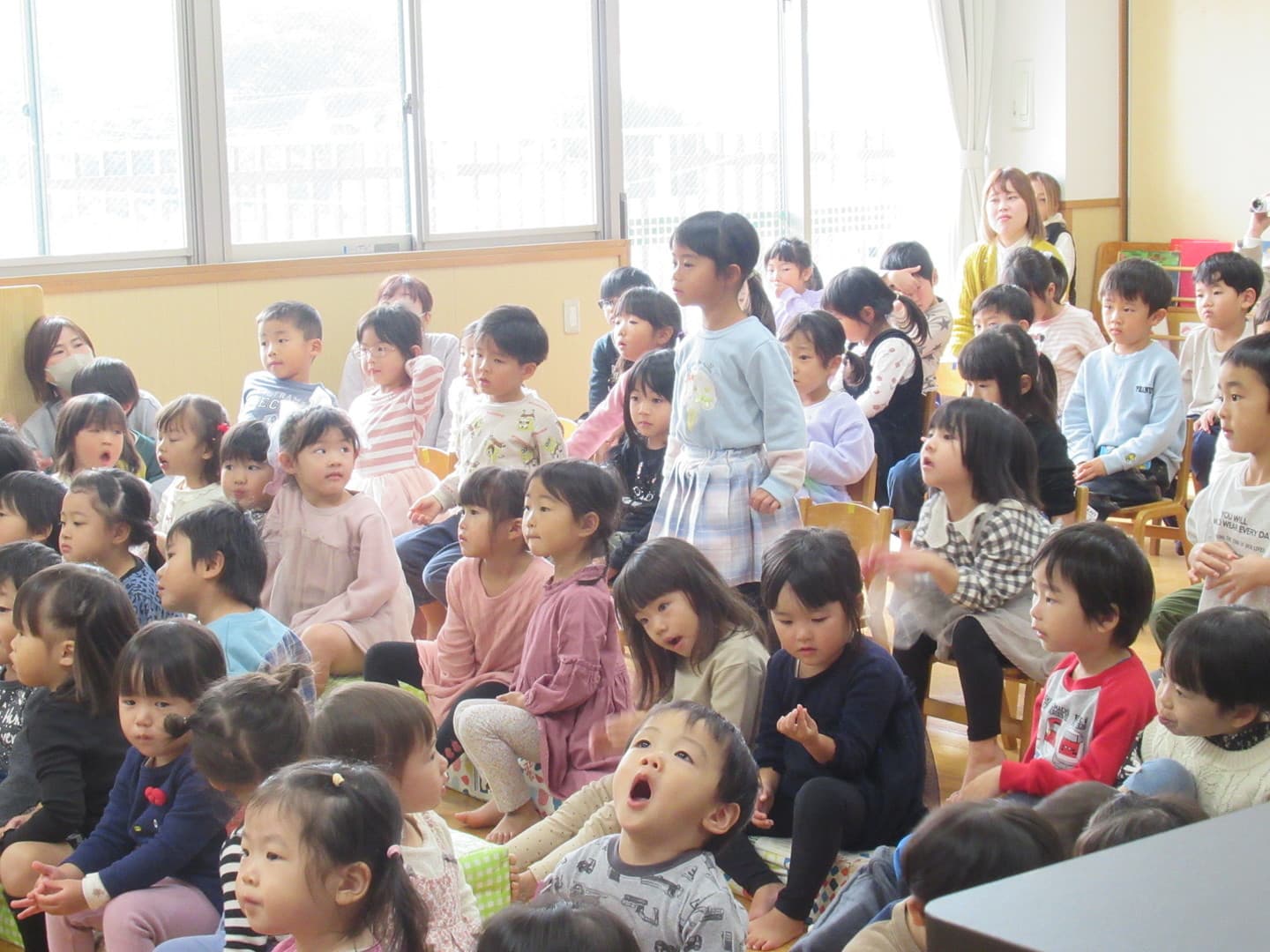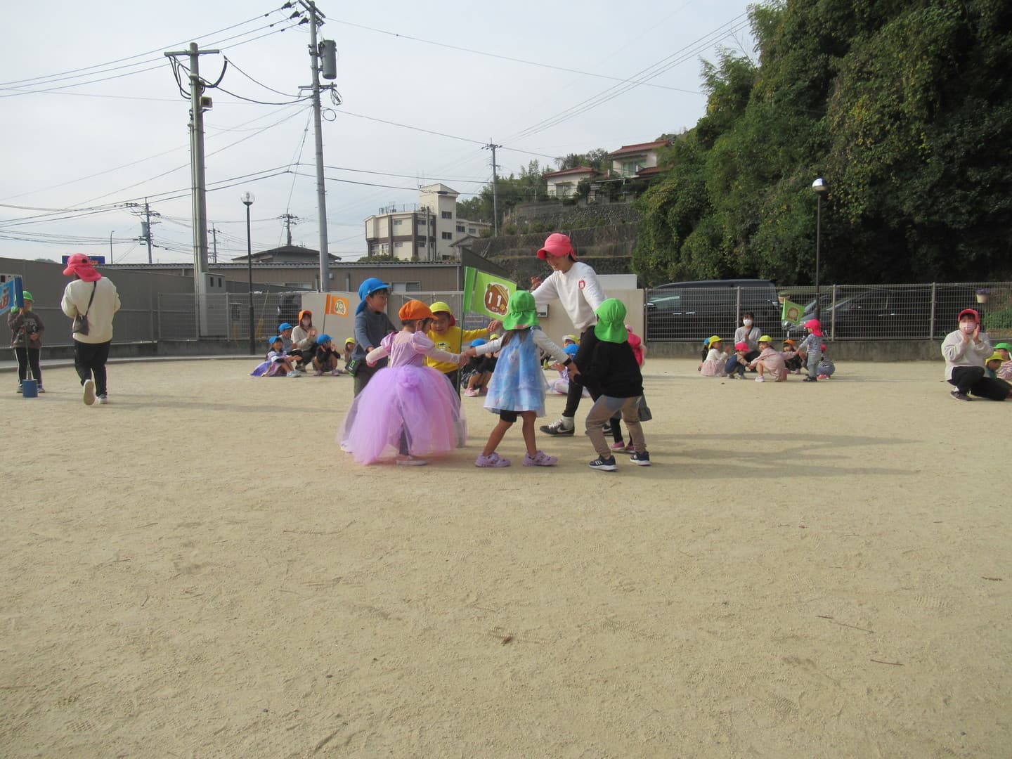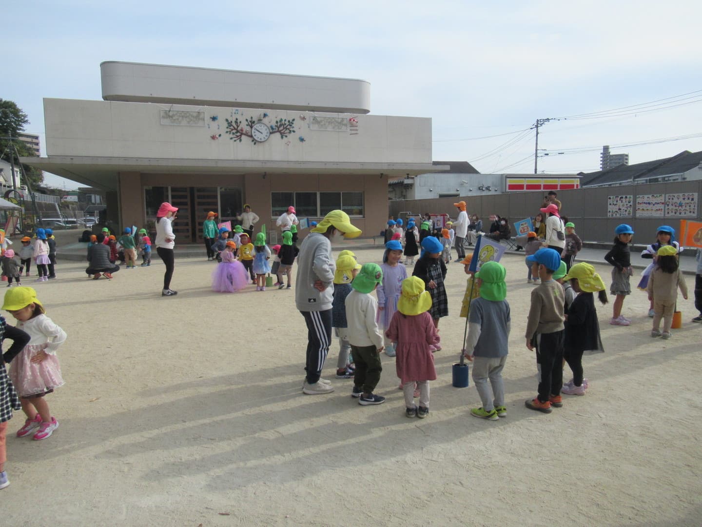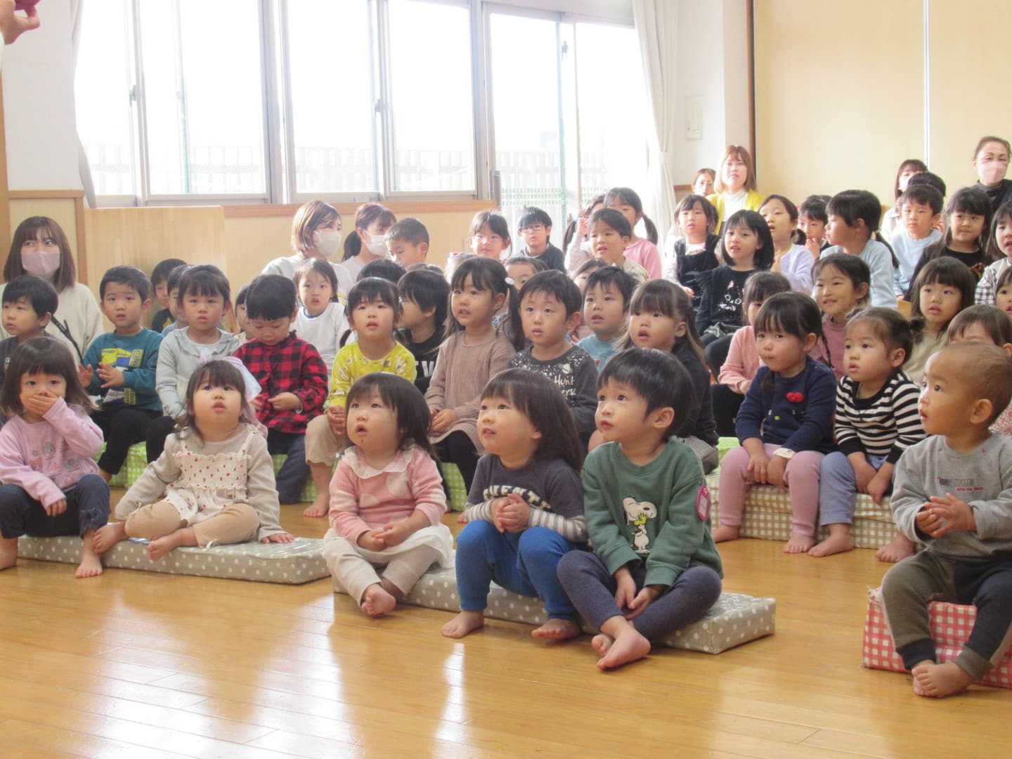 「さつまのおいも」の紙芝居を見たあと、困った様子のばばばあちゃんがやって来ました。せっかくのお誕生日会なのに楽しことが思い付かない・・・と困っていると、6人のお誕生児さんが来て、一緒に秋探しに行くことに!どんぐりを拾ったり、お芋掘りをして、楽しい秋探しをすることが出来ました。