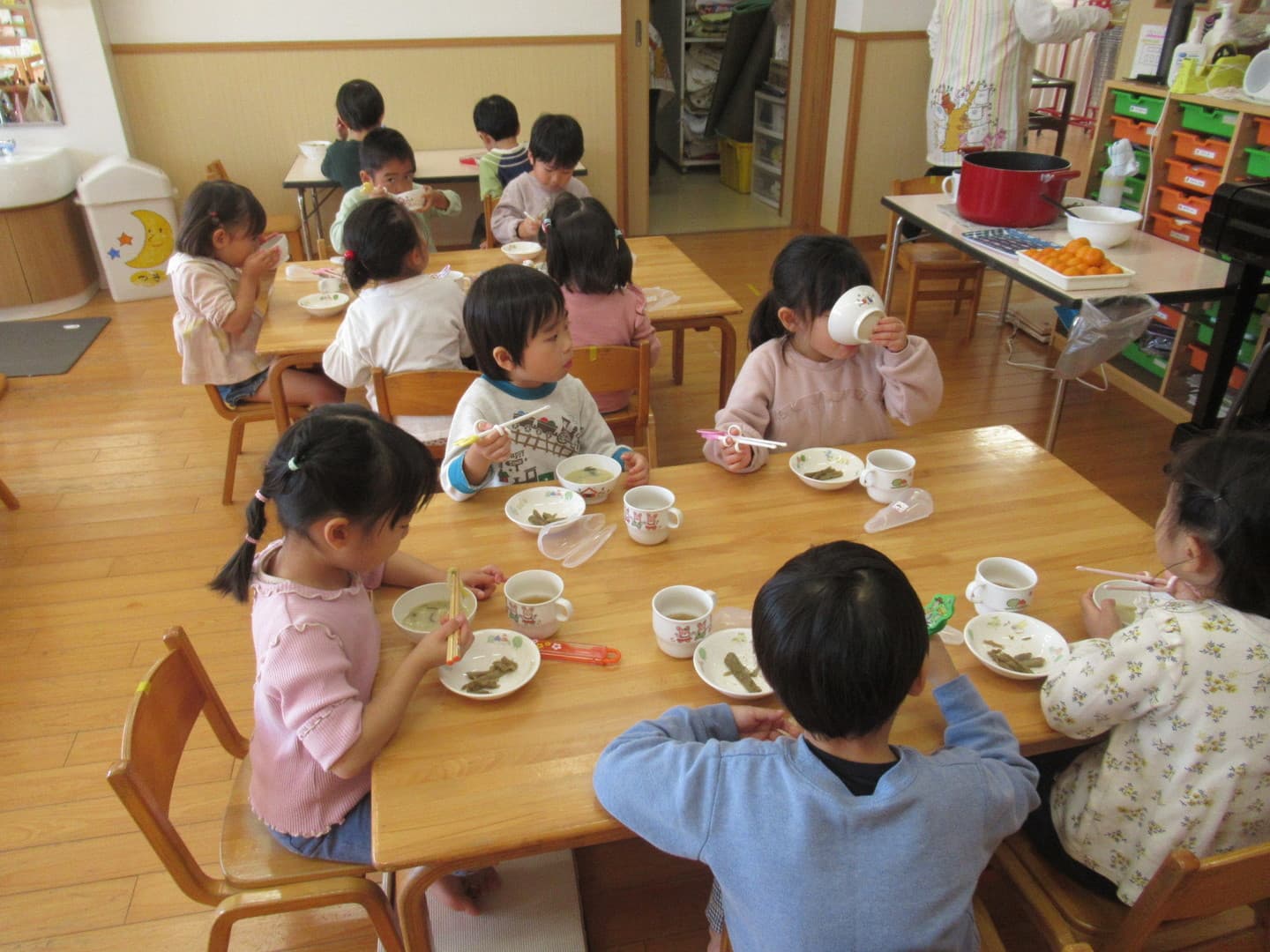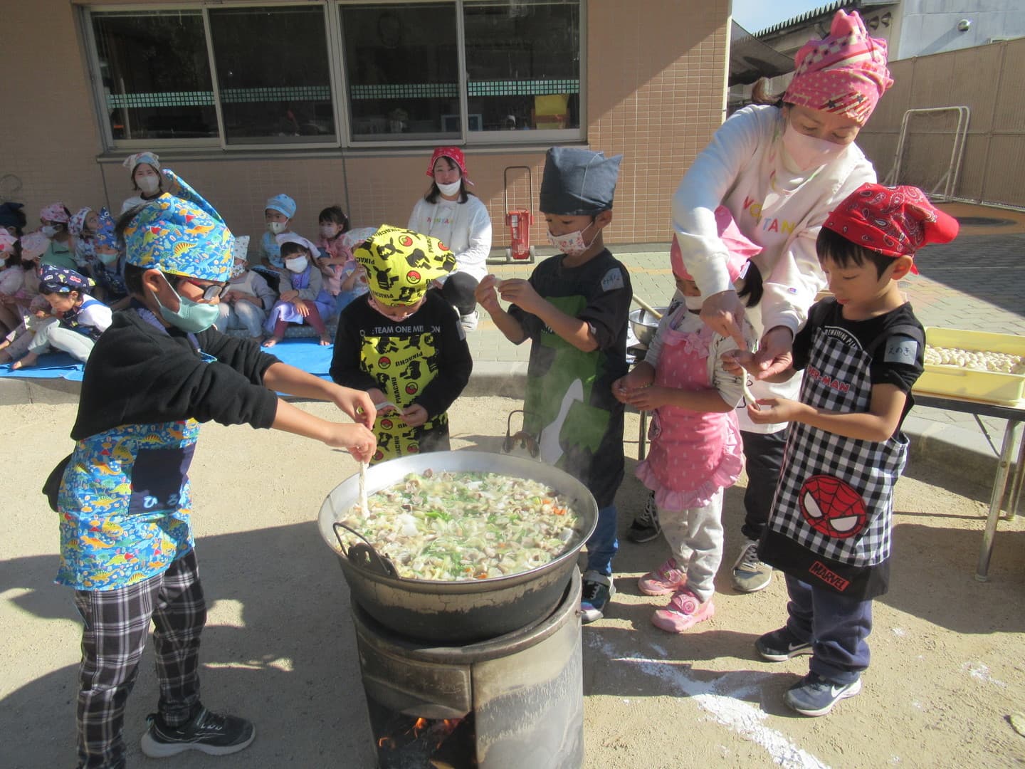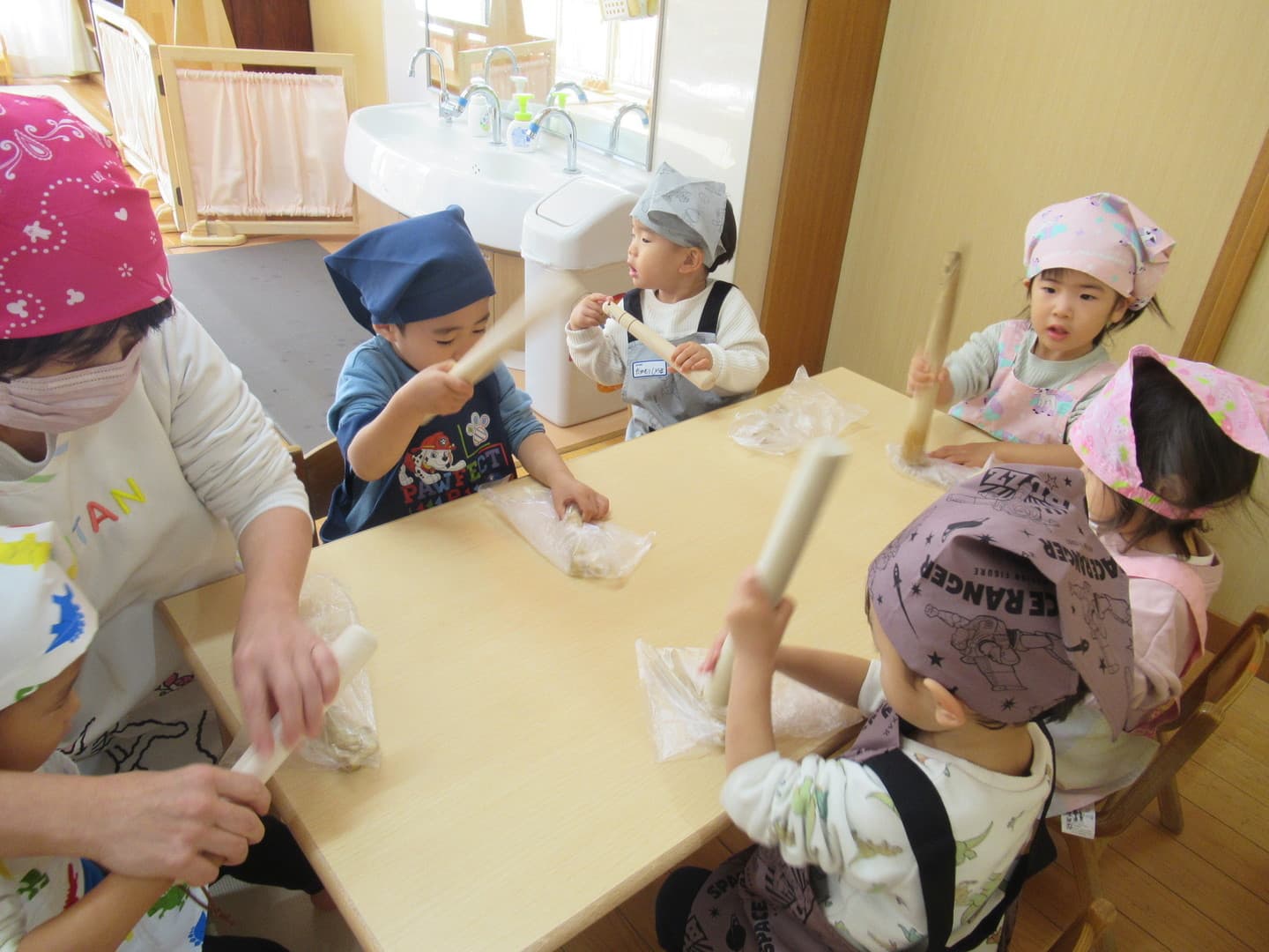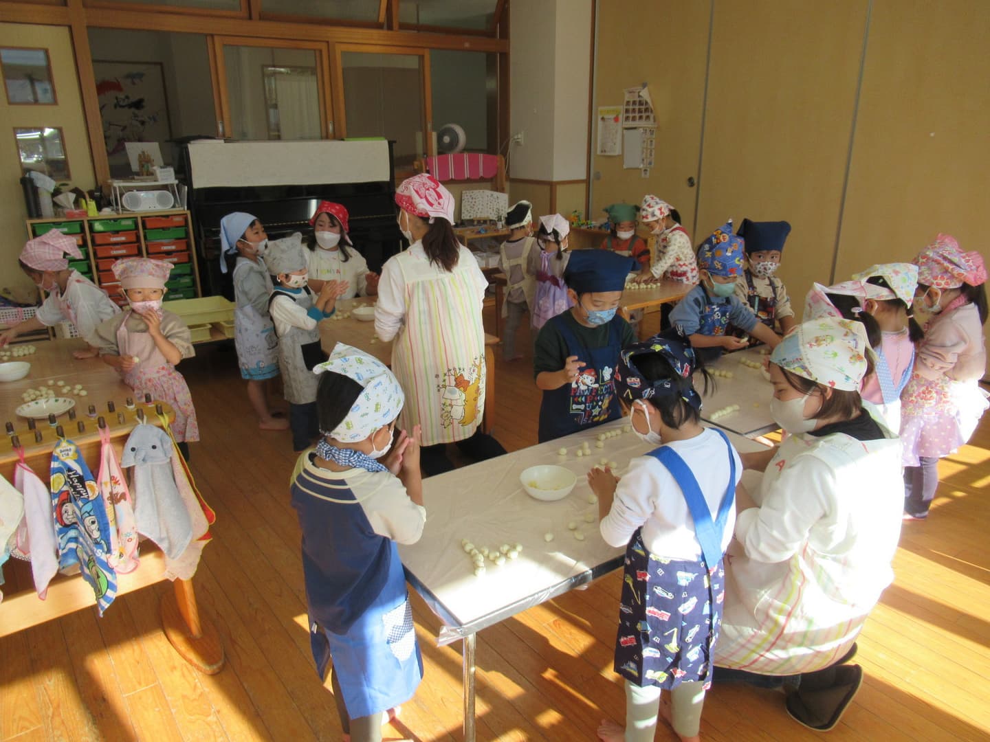 「おなべおなべにえたかな」の絵本を見てから、だんご汁クッキングを始めました。野菜を切ったり、ちぎったり、だんごを丸めたり・・・準備が出来たら大きなお鍋に入れていきました。だんごを伸ばすのも上手でしたよ。にじ組さんは叩きごぼうを作り、つき組さんはサツマイモを入れた秘密のだんごを作りました。自分たちで作っただんご汁は美味しかったようでおかわりをして食べていました。