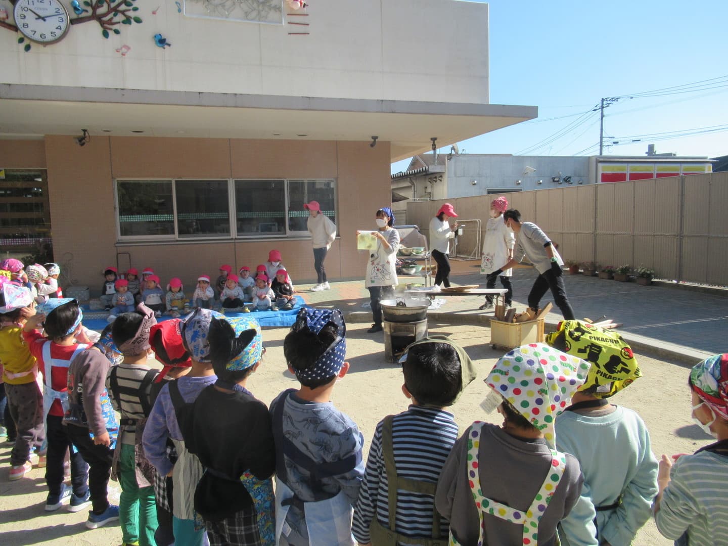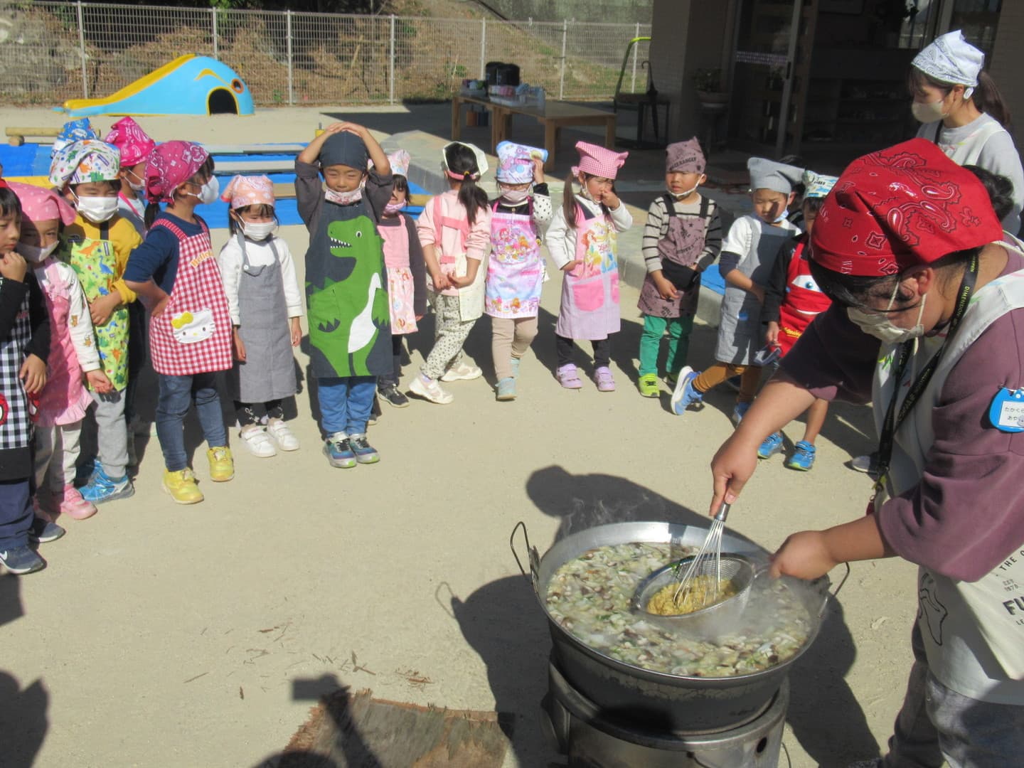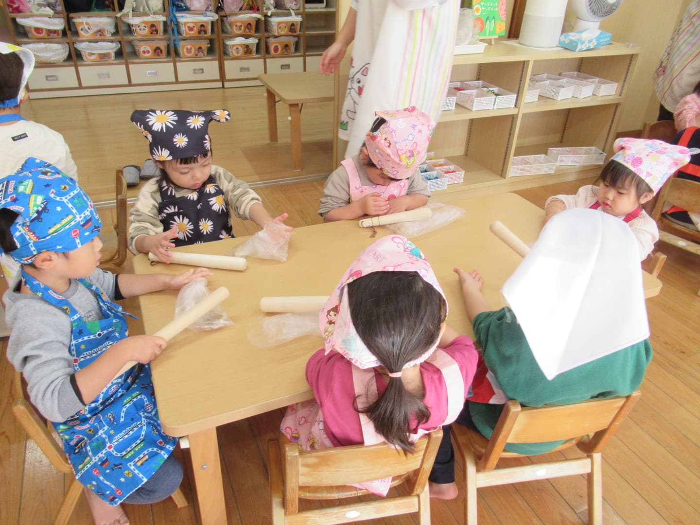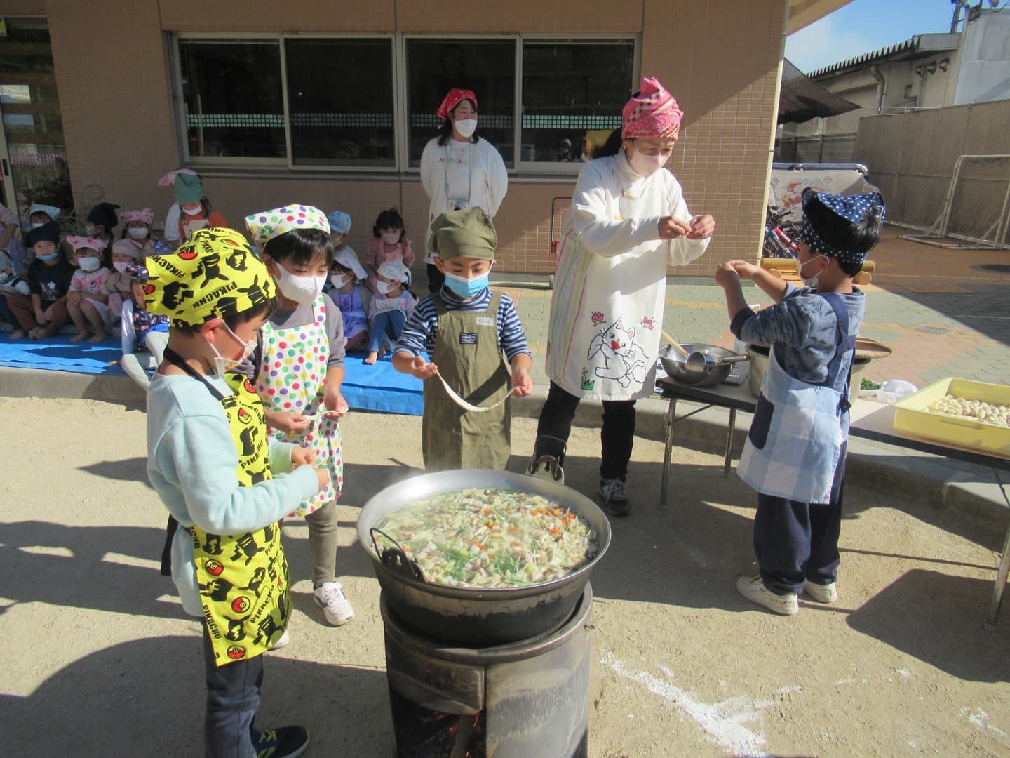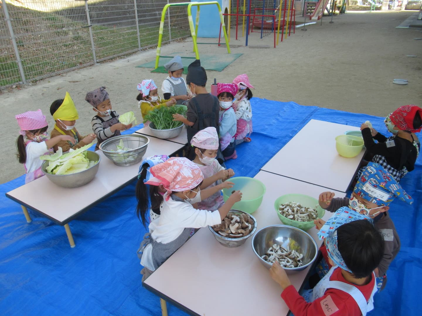 「おなべおなべにえたかな」の絵本を見てから、だんご汁クッキングを始めました。野菜を切ったり、ちぎったり、だんごを丸めたり・・・準備が出来たら大きなお鍋に入れていきました。だんごを伸ばすのも上手でしたよ。にじ組さんは叩きごぼうを作り、つき組さんはサツマイモを入れた秘密のだんごを作りました。自分たちで作っただんご汁は美味しかったようでおかわりをして食べていました。