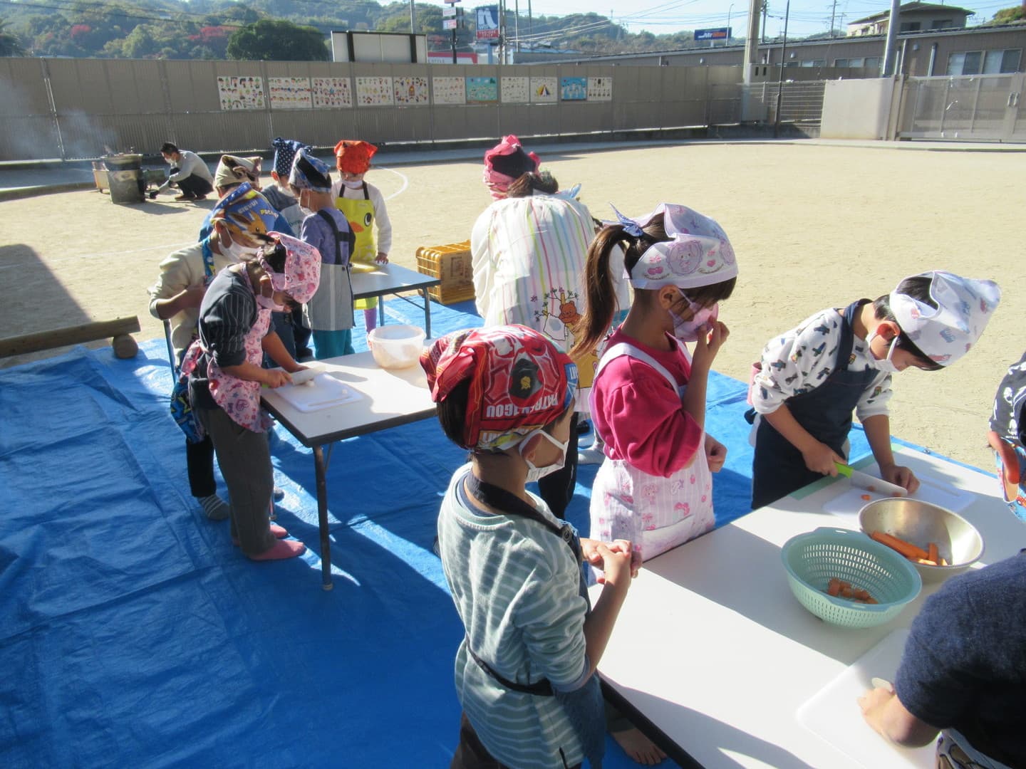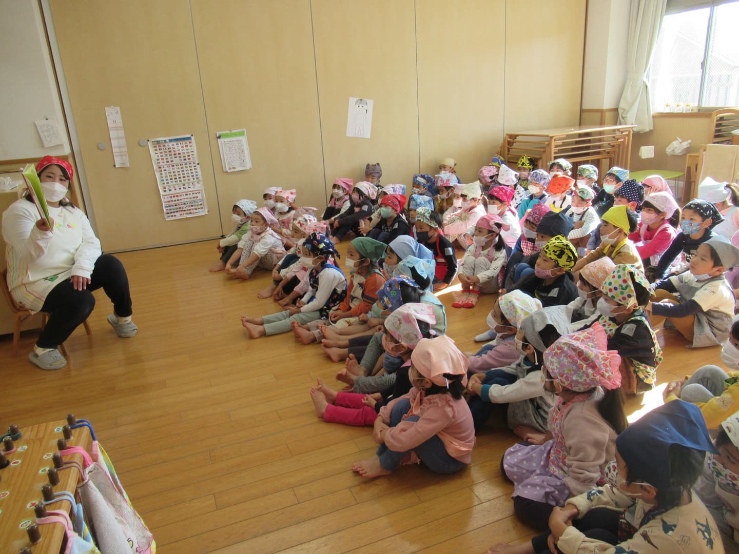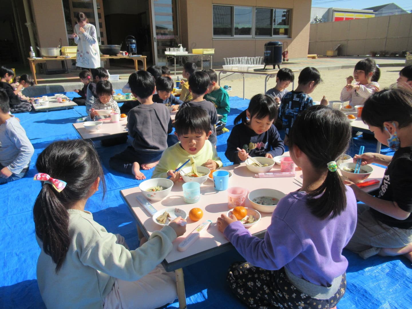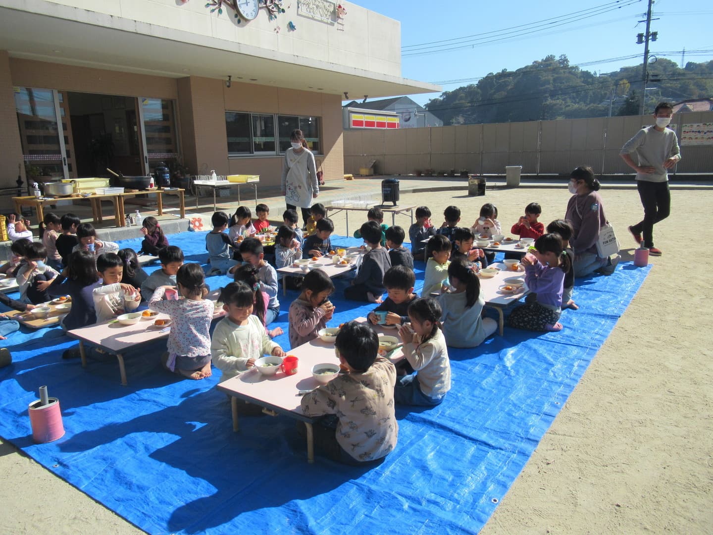 「おなべおなべにえたかな」の絵本を見てから、だんご汁クッキングを始めました。野菜を切ったり、ちぎったり、だんごを丸めたり・・・準備が出来たら大きなお鍋に入れていきました。だんごを伸ばすのも上手でしたよ。にじ組さんは叩きごぼうを作り、つき組さんはサツマイモを入れた秘密のだんごを作りました。自分たちで作っただんご汁は美味しかったようでおかわりをして食べていました。