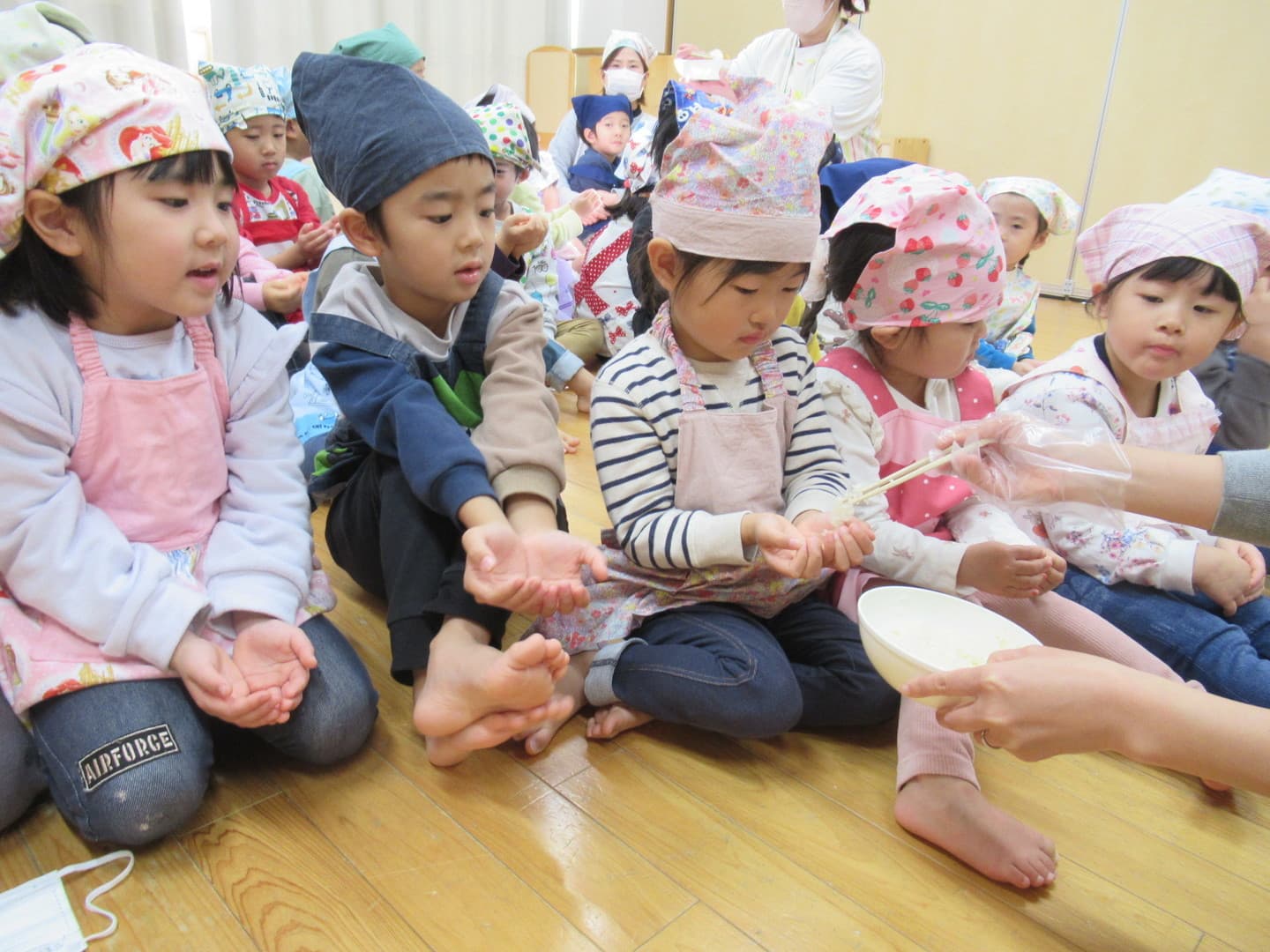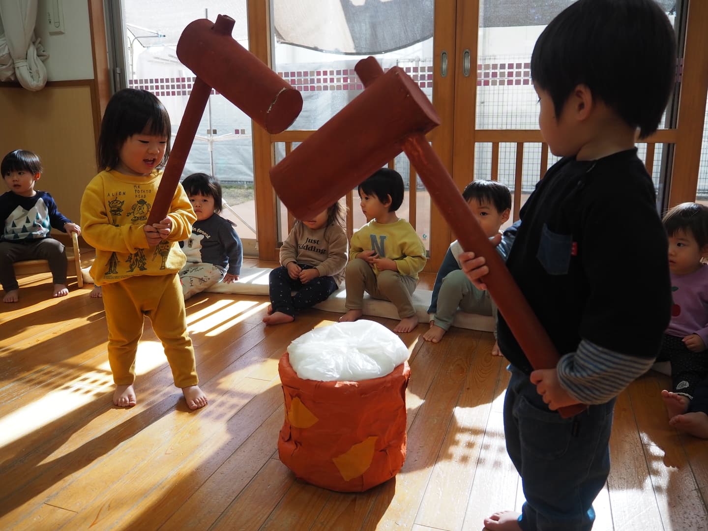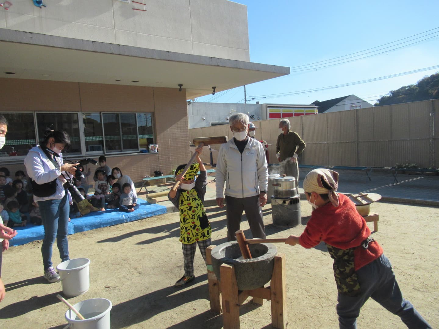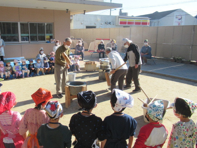 今年は久しぶりにおじいちゃんおばあちゃんを招いておもちつきをしました。初めにもち米を食べ、このお米を臼と杵でつくとおもちになっていくことを知らせました。「ぺったんぺったん」の掛け声に合わせてつくと、だんだん柔らかくなり、おいしそうなおもちができました!おばあちゃんたちに教えてもらいながら、上手に丸めていましたよ。小さいクラスのお友だちは、ごっこ遊びをして楽しみました。今日作ったおもちは、お雑煮やぜんざいにして食べる予定です。