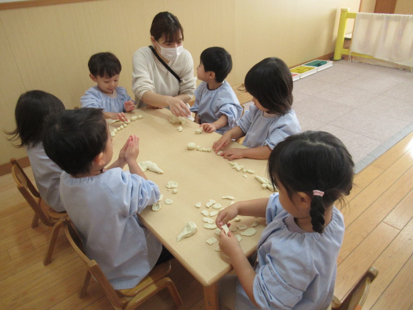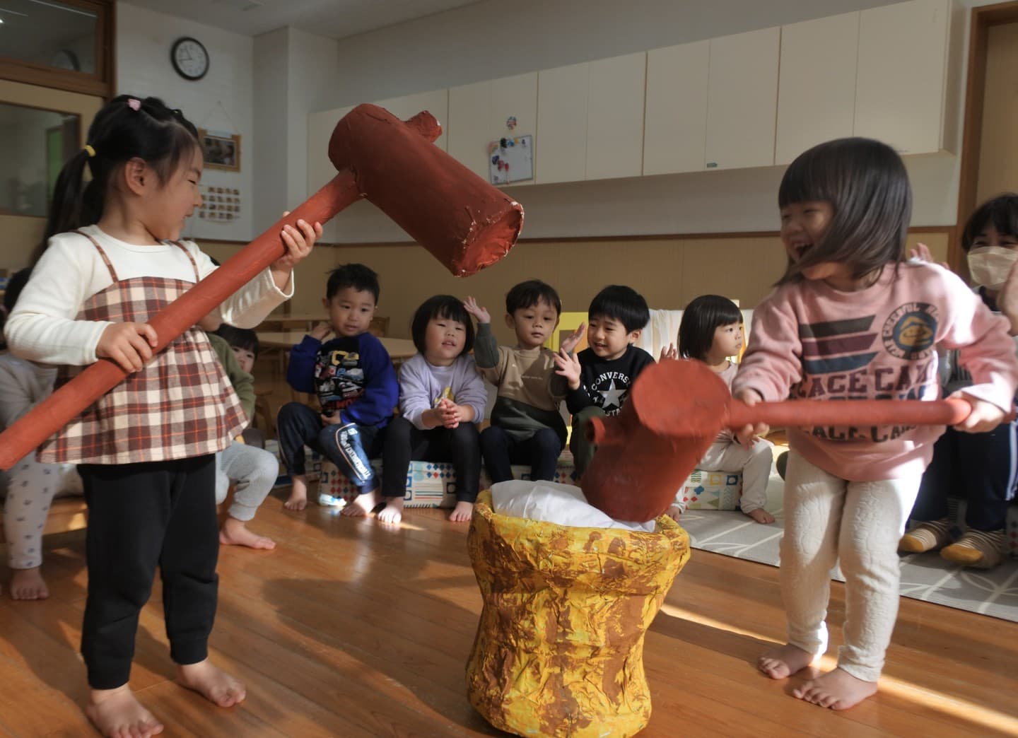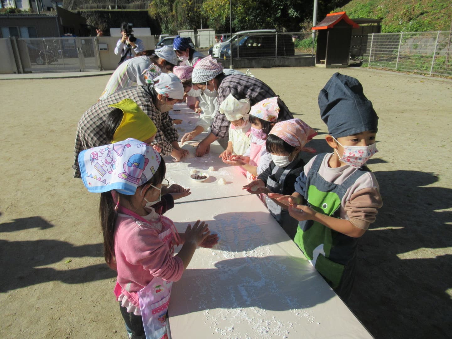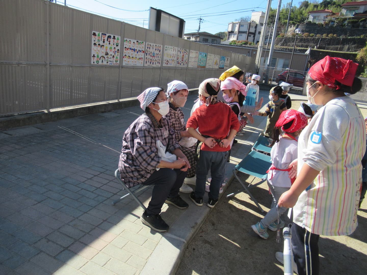 今年は久しぶりにおじいちゃんおばあちゃんを招いておもちつきをしました。初めにもち米を食べ、このお米を臼と杵でつくとおもちになっていくことを知らせました。「ぺったんぺったん」の掛け声に合わせてつくと、だんだん柔らかくなり、おいしそうなおもちができました!おばあちゃんたちに教えてもらいながら、上手に丸めていましたよ。小さいクラスのお友だちは、ごっこ遊びをして楽しみました。今日作ったおもちは、お雑煮やぜんざいにして食べる予定です。