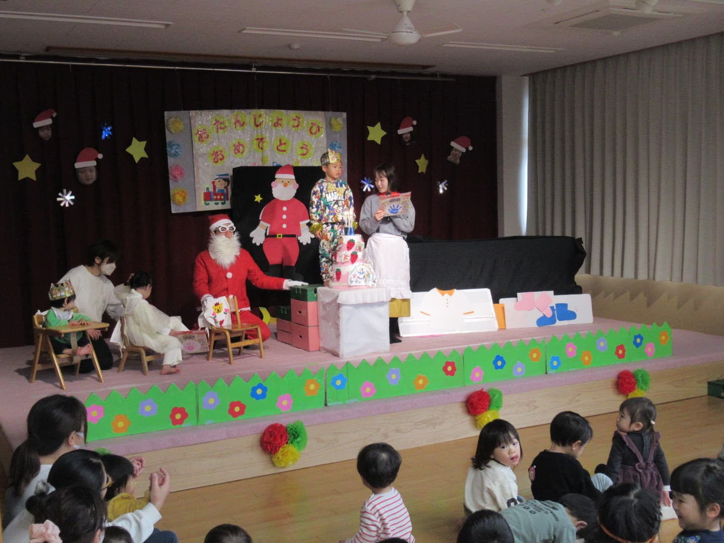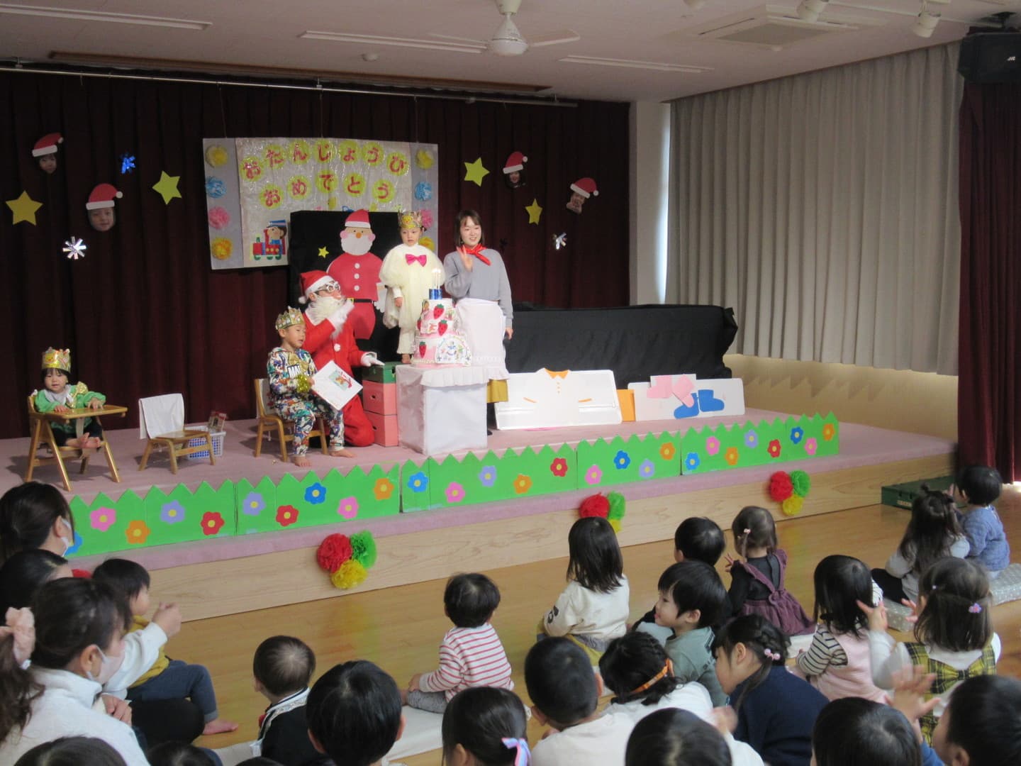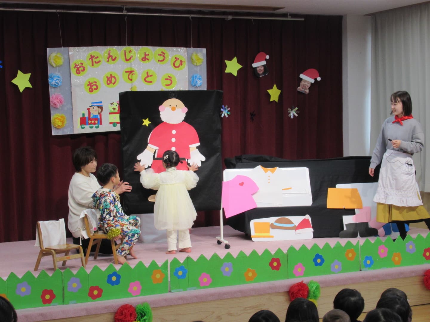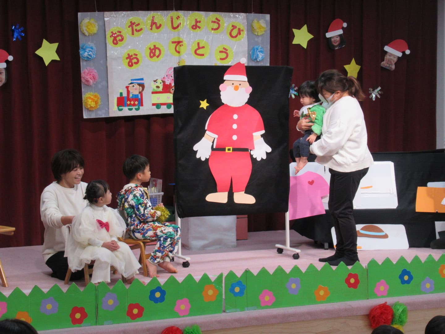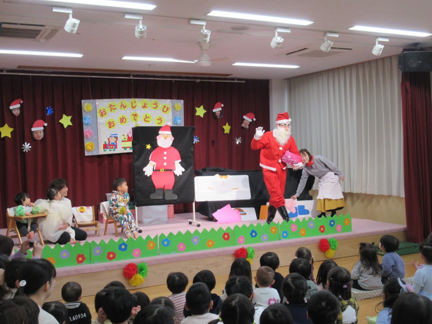 ばばばあちゃんが持ってきた不思議なパネルを開くと、裸のおじいさんが出てきました。寒そうなのでお誕生日のお友だちが服を着せてあげると…サンタさんが出来上がりました。すると鈴の音が聞こえてきて、サンタさんがやって来ました!どうやらクリスマスの日を間違えたようです。せっかくなのでお誕生会に参加してもらい楽しい会になりました。25日のクリスマス会にもう一度来てくれるようです。