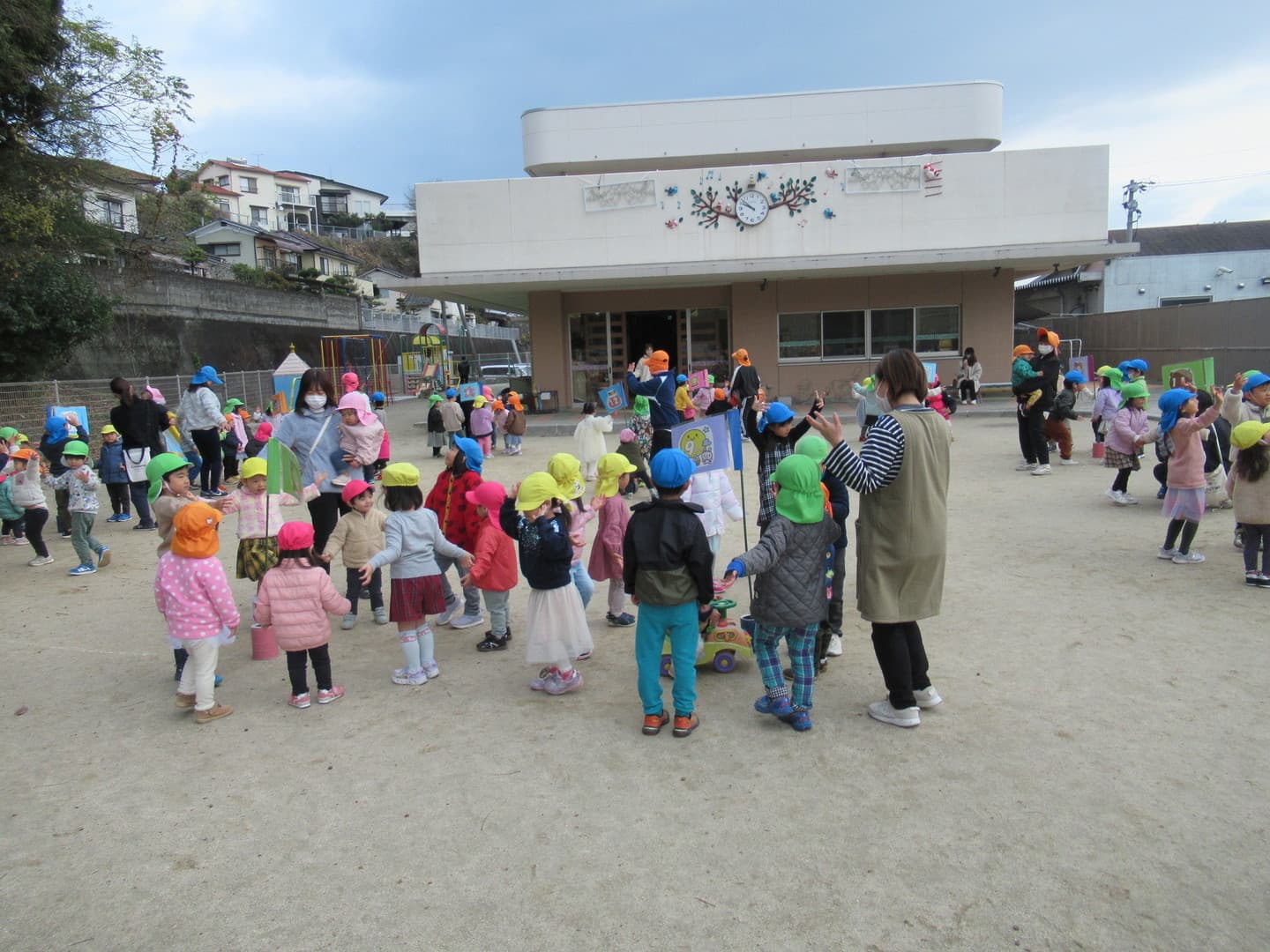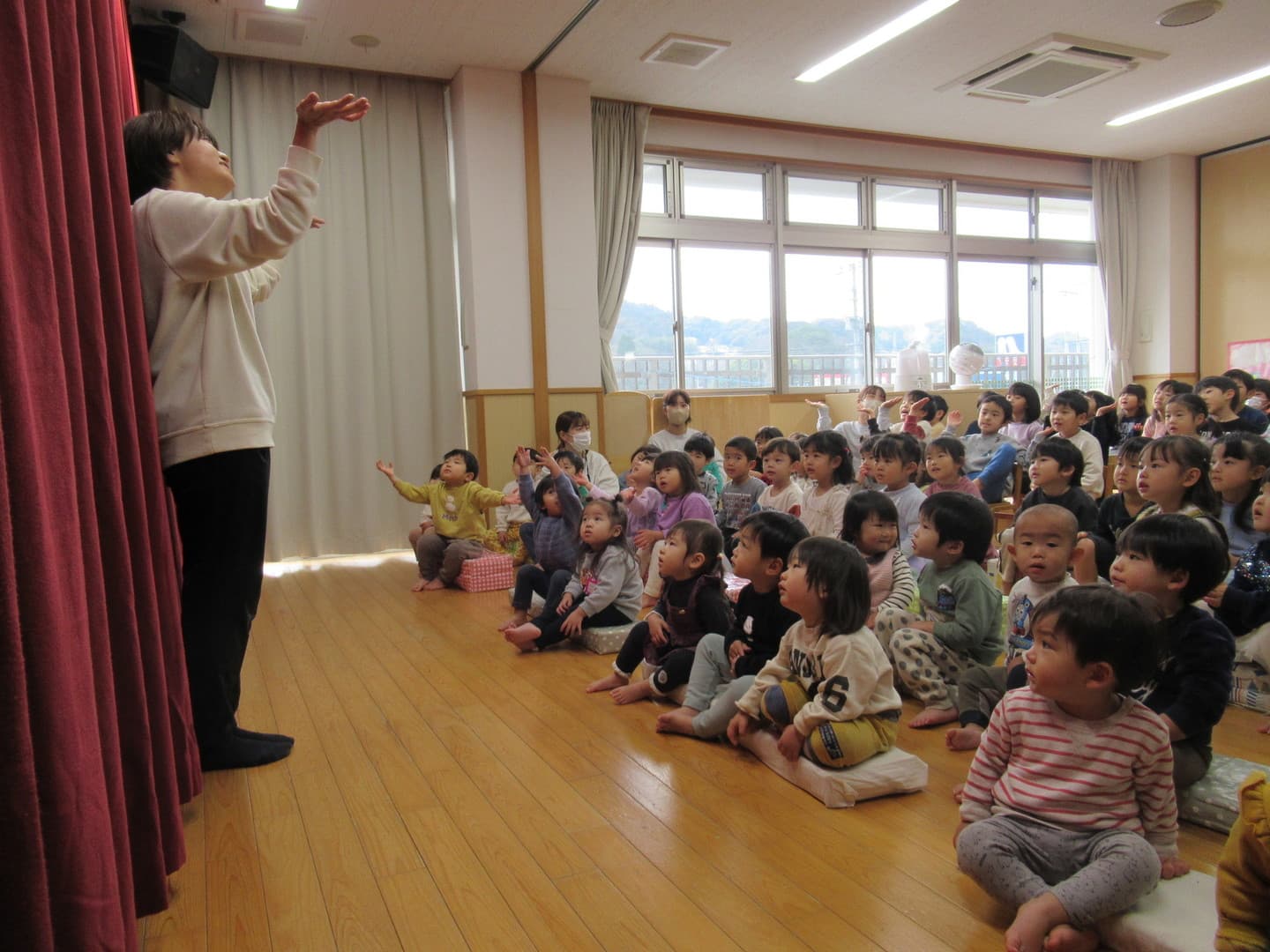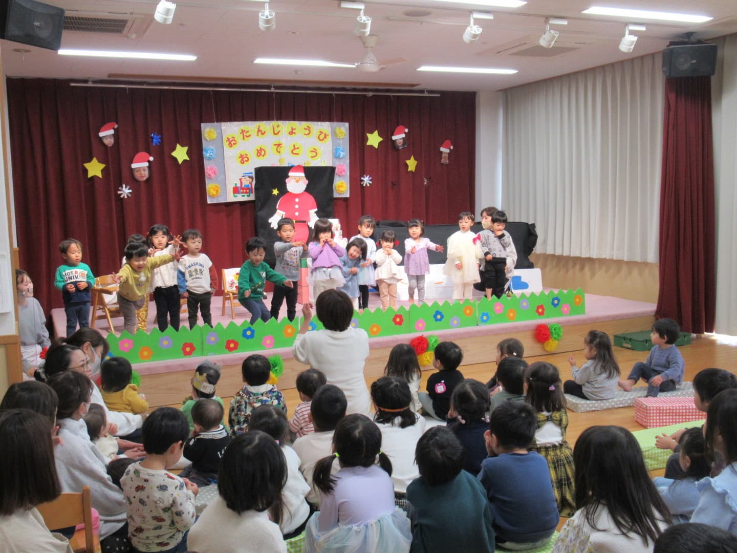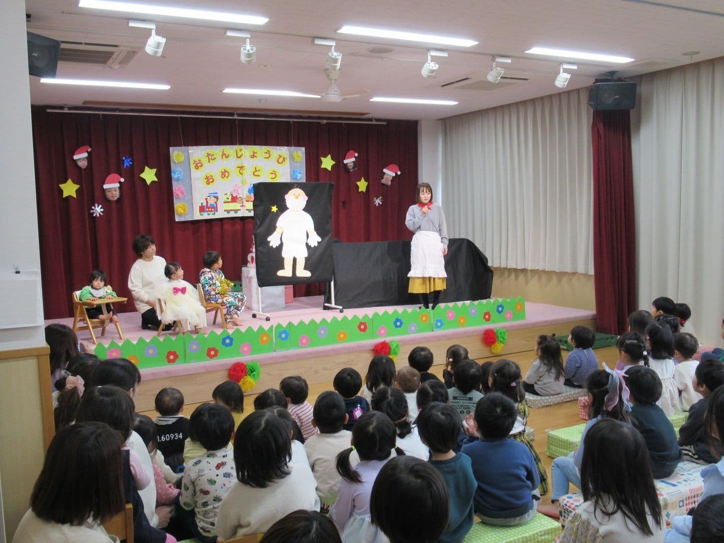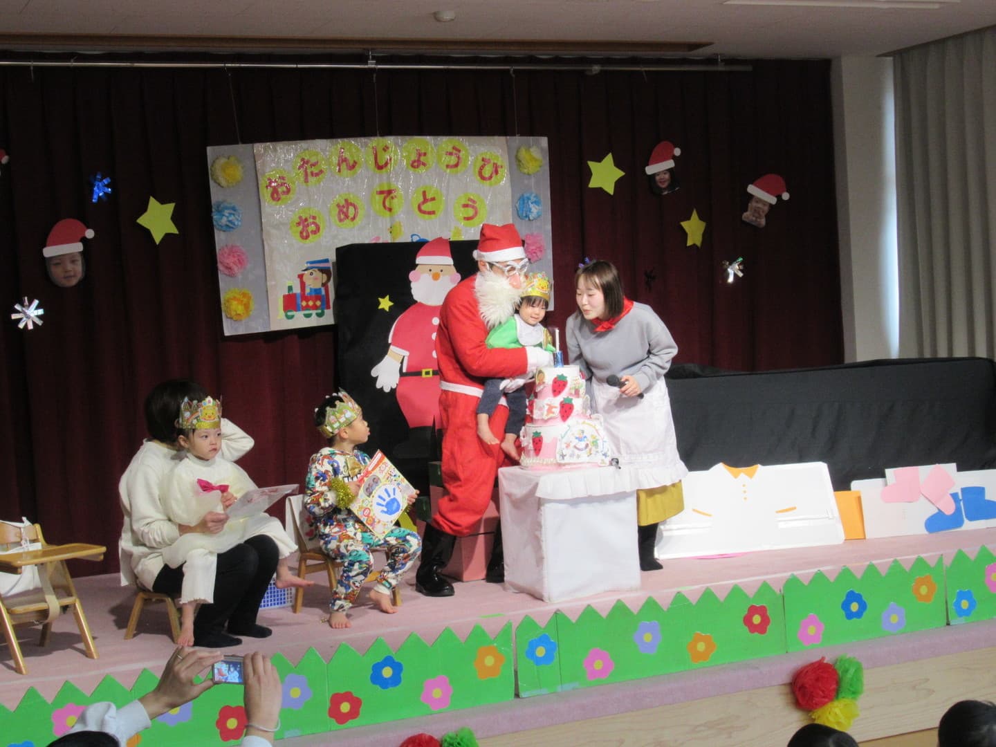 ばばばあちゃんが持ってきた不思議なパネルを開くと、裸のおじいさんが出てきました。寒そうなのでお誕生日のお友だちが服を着せてあげると…サンタさんが出来上がりました。すると鈴の音が聞こえてきて、サンタさんがやって来ました!どうやらクリスマスの日を間違えたようです。せっかくなのでお誕生会に参加してもらい楽しい会になりました。25日のクリスマス会にもう一度来てくれるようです。