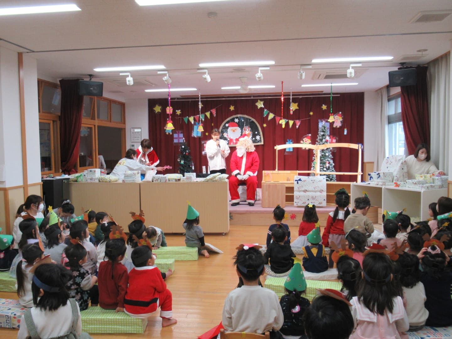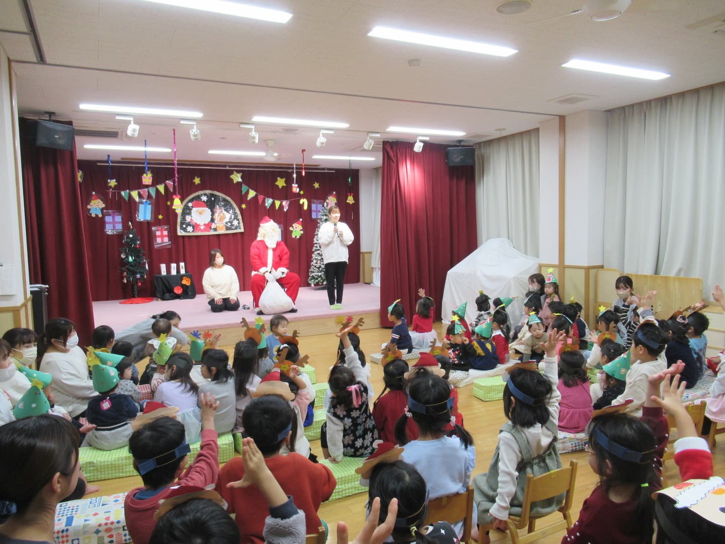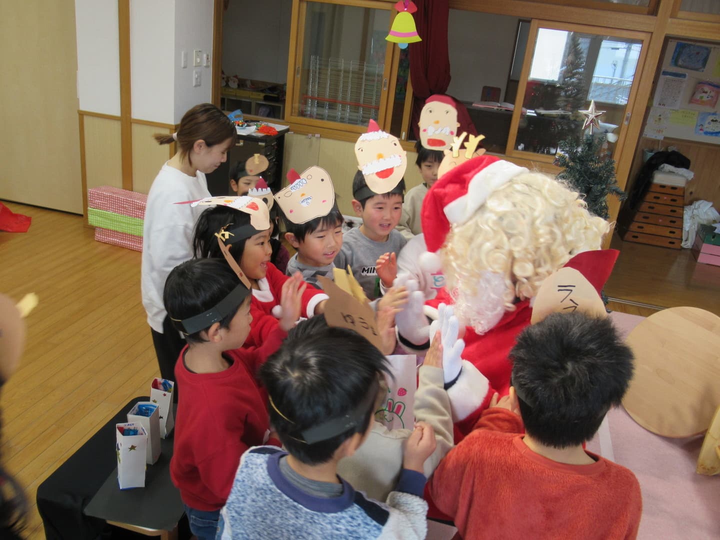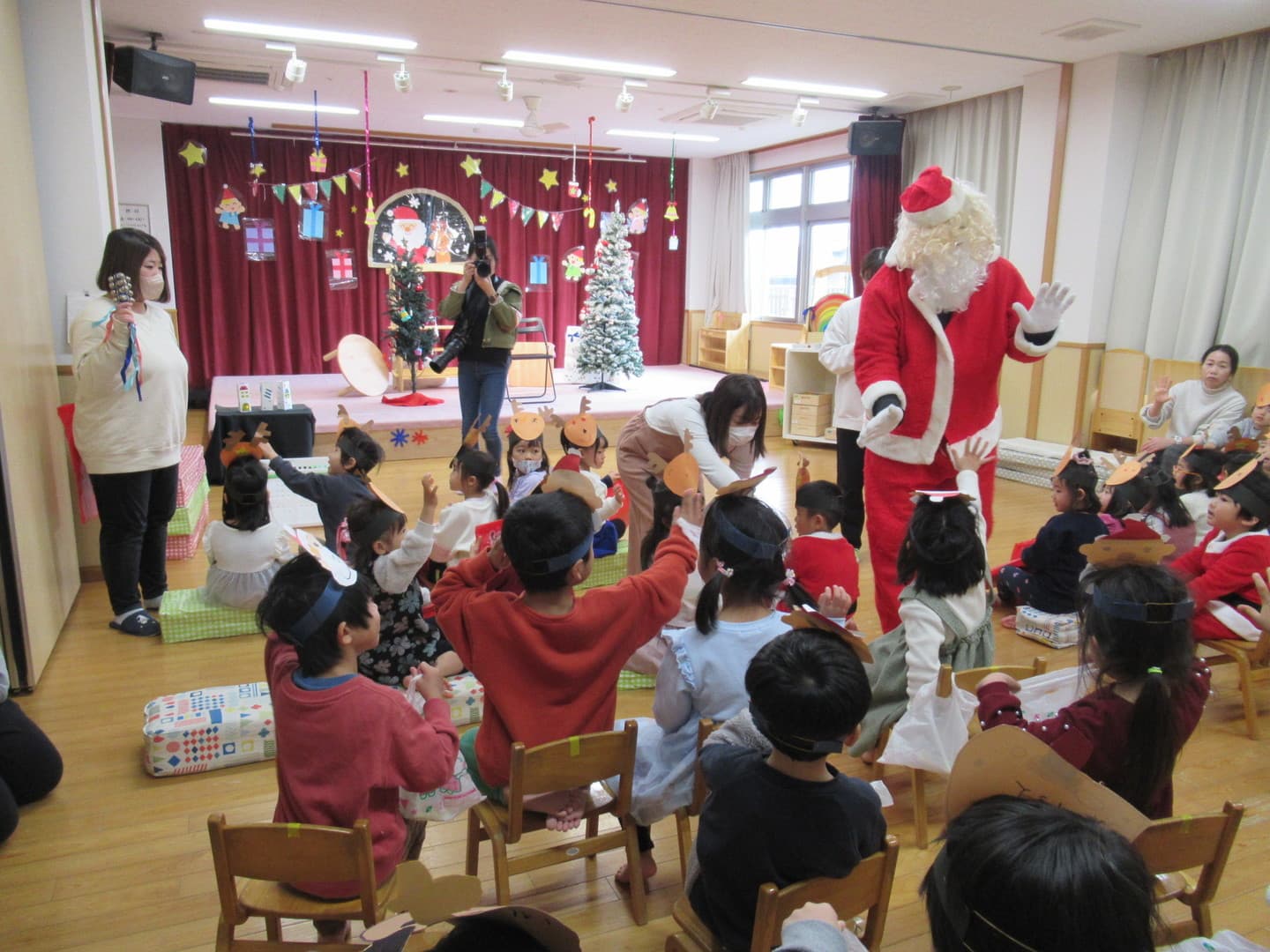 初めに園庭でクリスマスのダンスを踊りました♪ホールでは、そら組さんのキャンドル隊や先生たちによる出し物を見たり、みんなで歌を歌っていると鈴の音が聞こえてきました。園児たちは大興奮!だんだん鈴の音が大きくなりサンタさんの姿が見えると大喜びでした。サンタさんに質問したり、一緒に写真を撮ってもらって楽しいクリスマス会になりました。プレゼントもたくさんもらったので大切に使いたいと思います。
