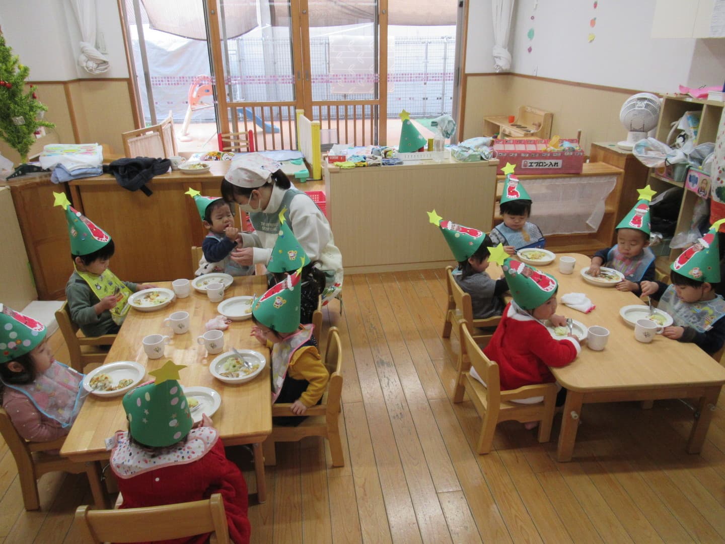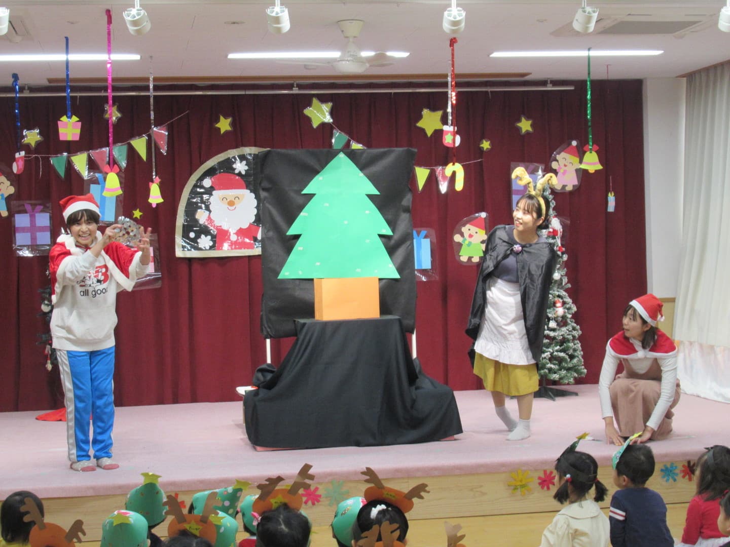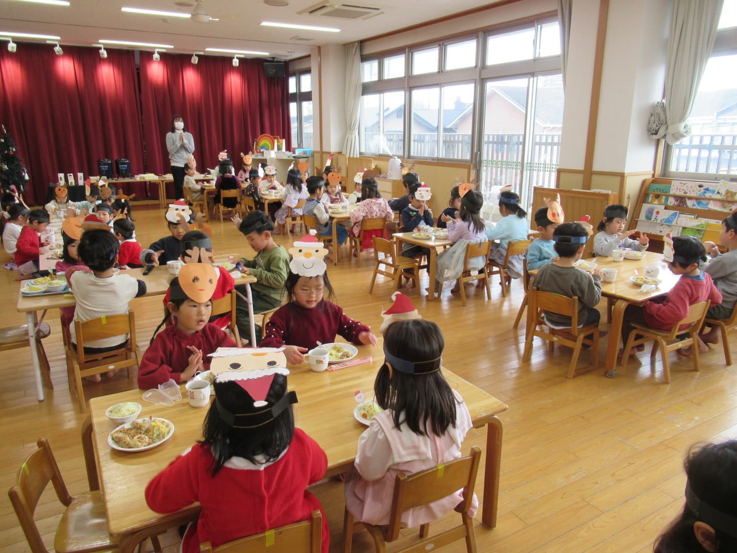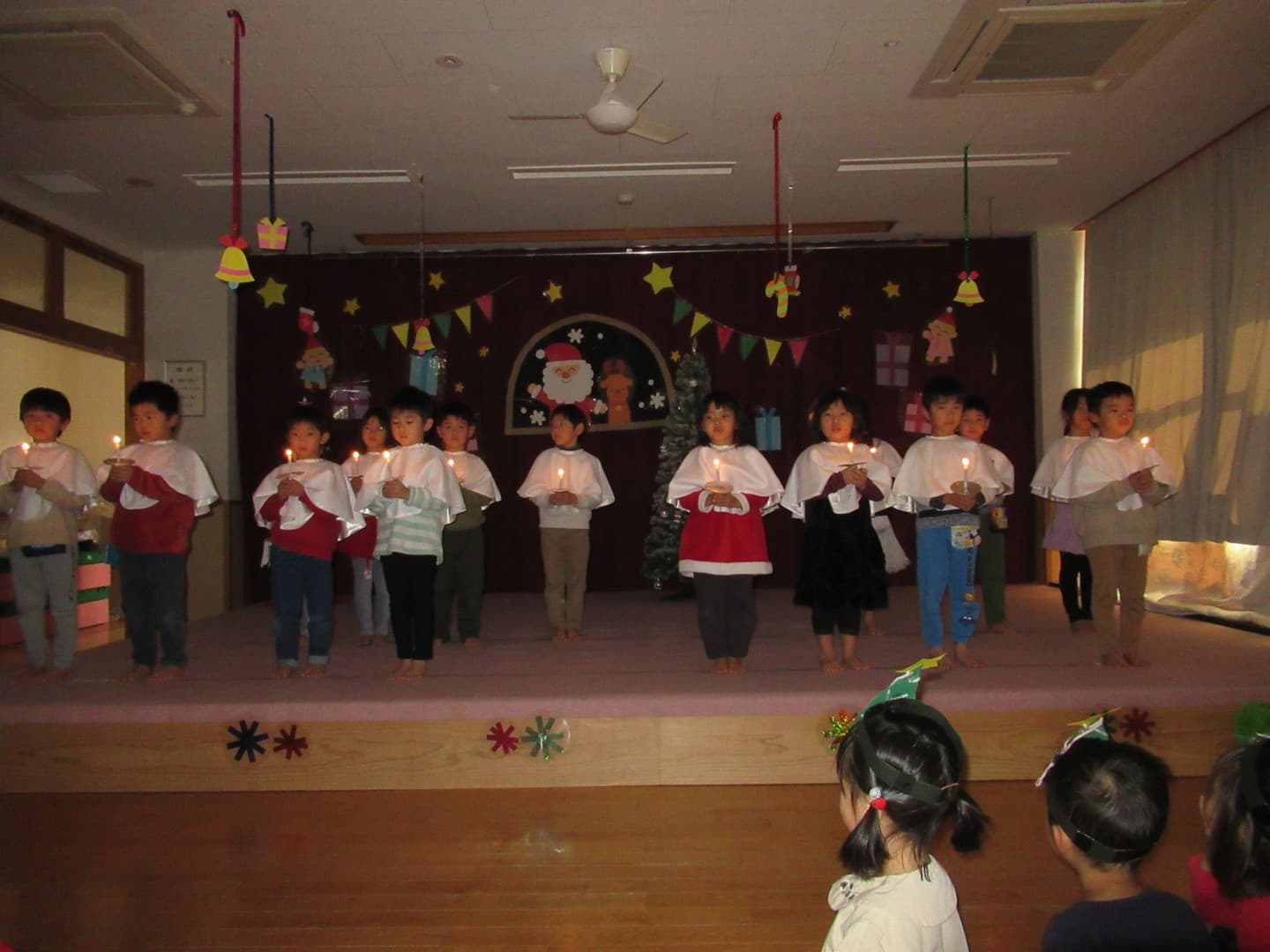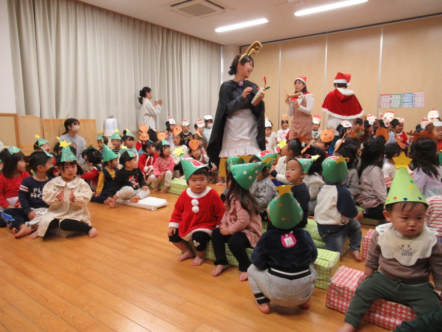 初めに園庭でクリスマスのダンスを踊りました♪ホールでは、そら組さんのキャンドル隊や先生たちによる出し物を見たり、みんなで歌を歌っていると鈴の音が聞こえてきました。園児たちは大興奮!だんだん鈴の音が大きくなりサンタさんの姿が見えると大喜びでした。サンタさんに質問したり、一緒に写真を撮ってもらって楽しいクリスマス会になりました。プレゼントもたくさんもらったので大切に使いたいと思います。