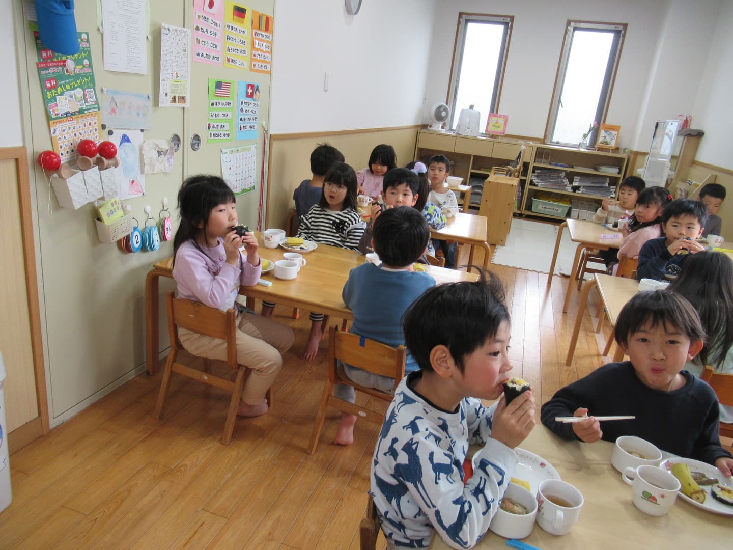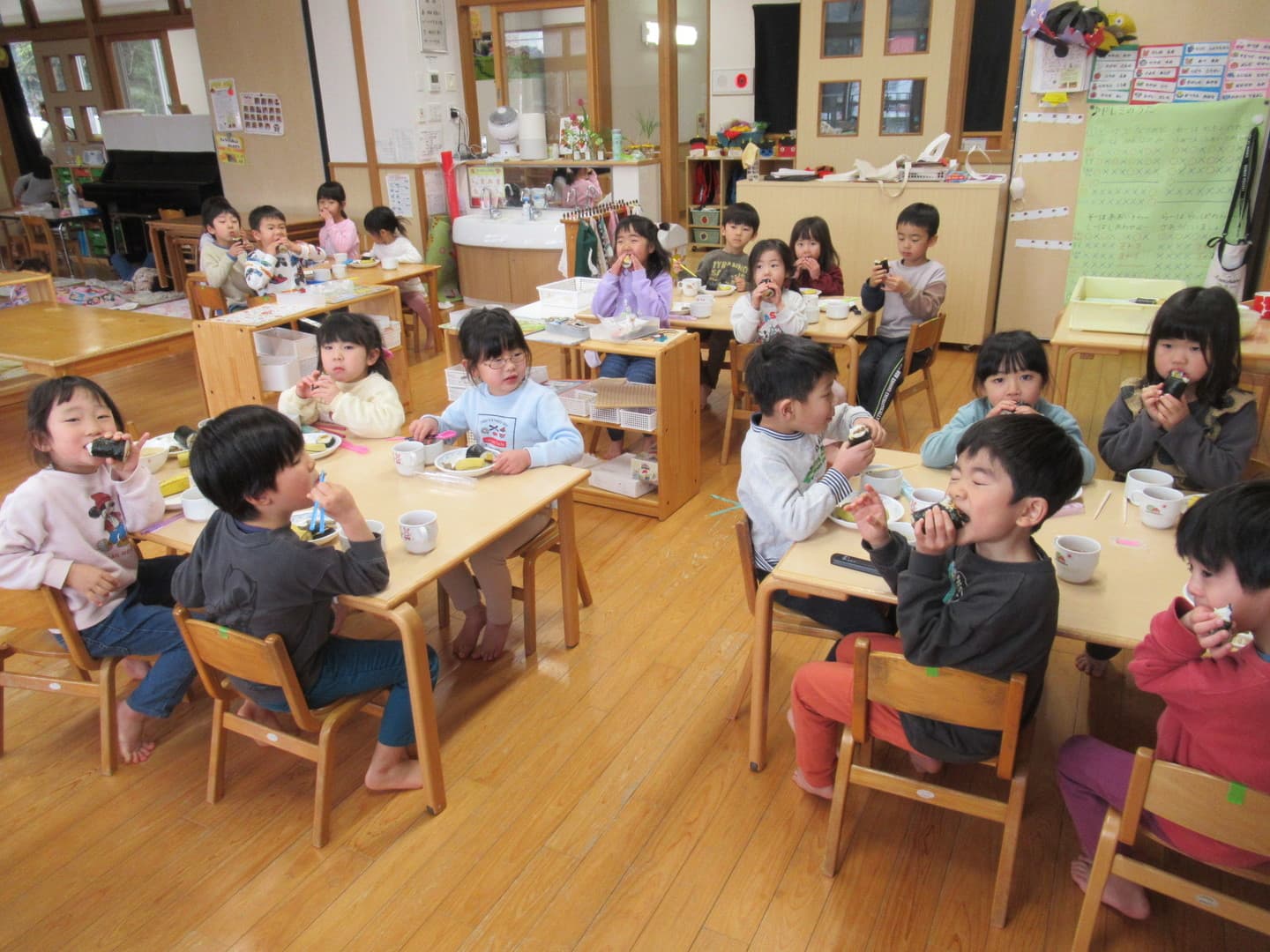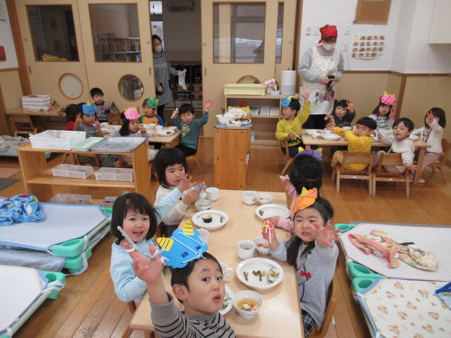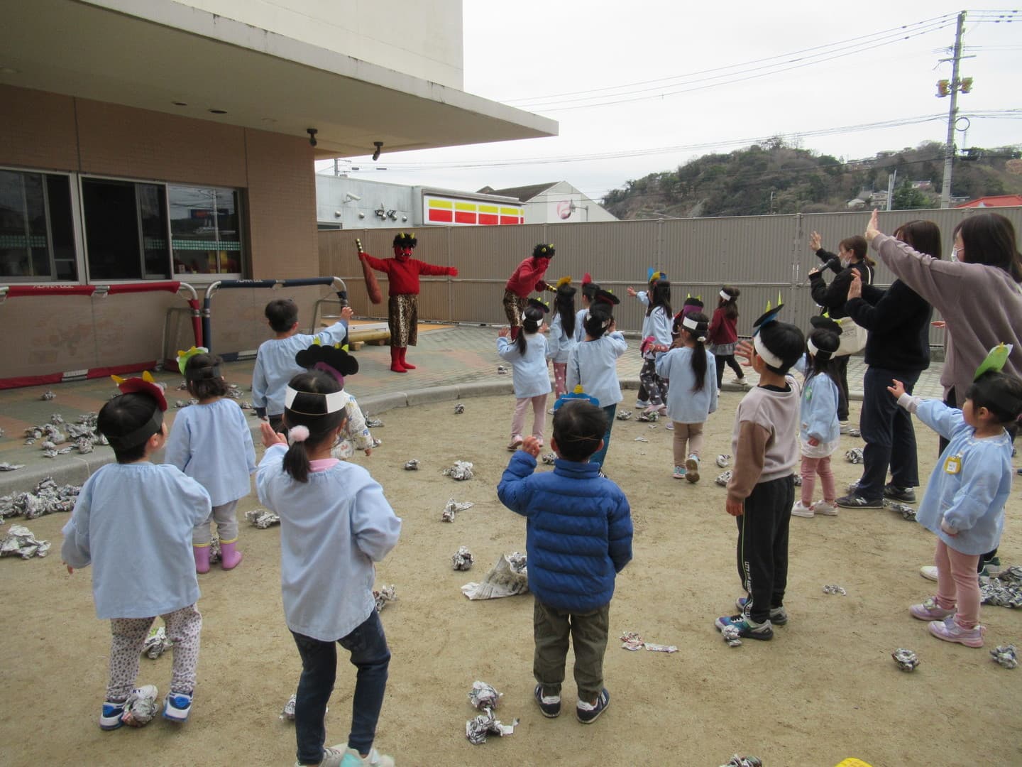 2月3日は節分です。今日は鬼のお面を被り、自分たちで作った新聞紙ボールを豆に見立てて豆まきごっこをしました。するとそこに鬼が登場!!びっくりして泣いてしまう園児もいましたが、勇気を出して豆を投げてみんなで退治しました。心の中にいた鬼は出ていったかな?その後は、給食の先生が作ってくれた恵方巻(キンパ)を嬉しそうに食べていました。