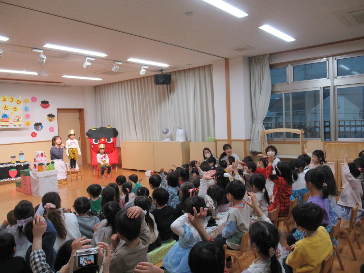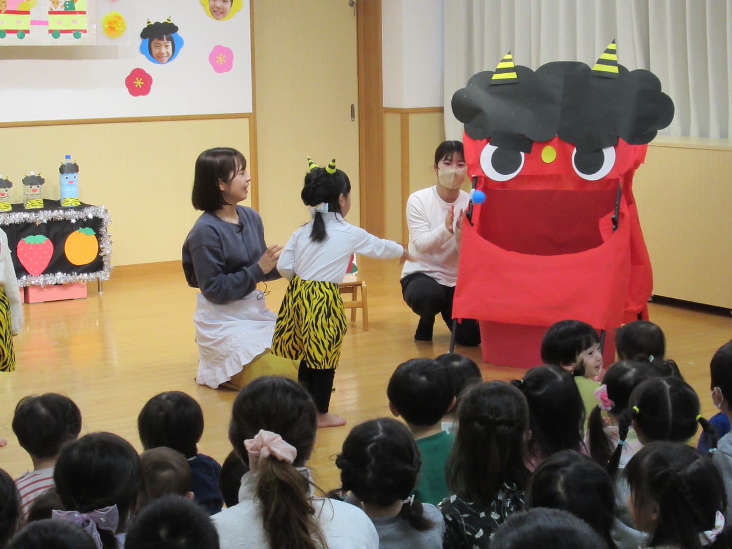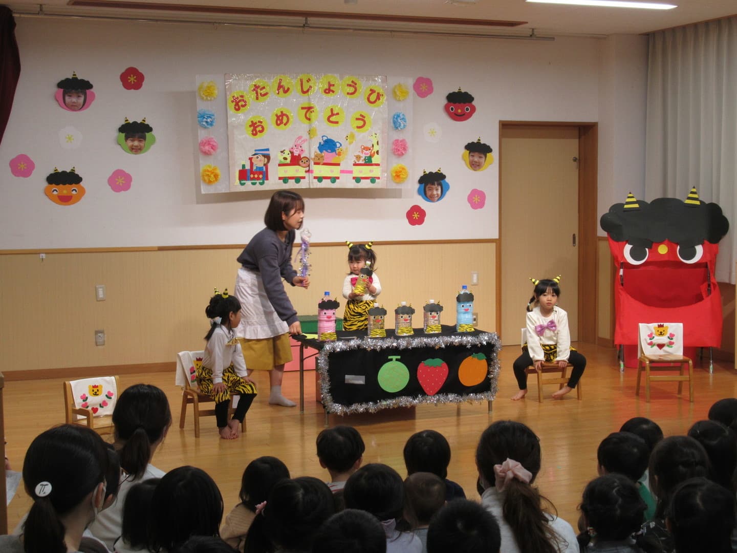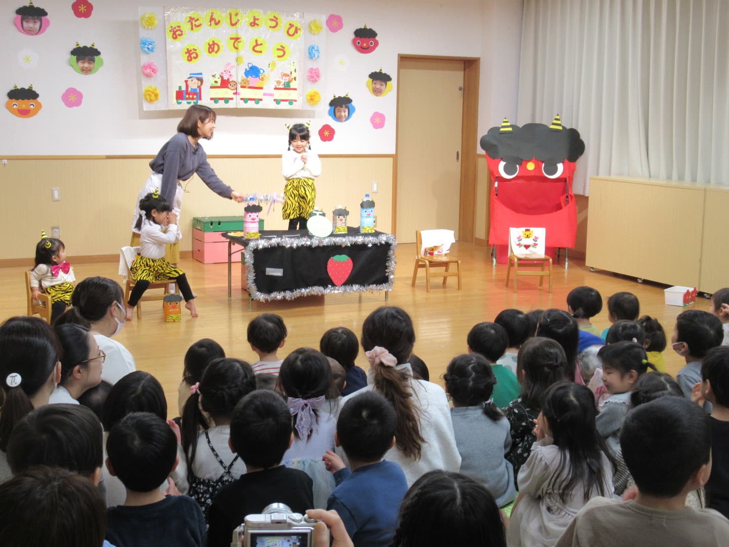 節分の日にやってきた鬼の子どもたちが迷子になっているのを見つけたばばばあちゃんは、一緒に遊んで待つことにしました。大きな鬼の口をめがけてボールを投げたり、ばばばあちゃんに魔法をかけてもらうと透明だった水が好きな果物のジュースになったり・・・みんな楽しそうでしたよ。お母さんが迎えに来て一緒にお誕生会をしました。たいよう組さんから歌のプレゼントもあり楽しい会になりました♪