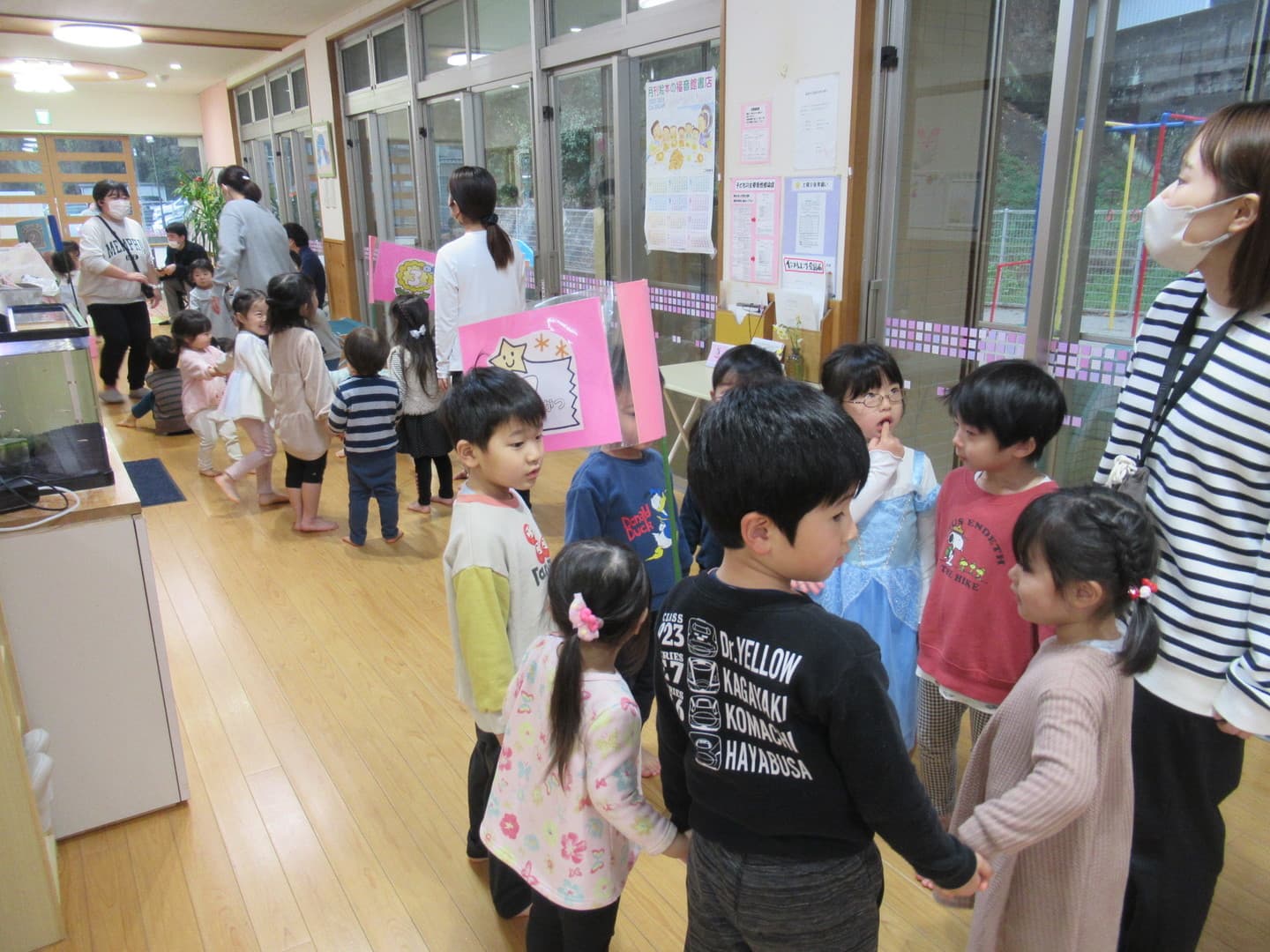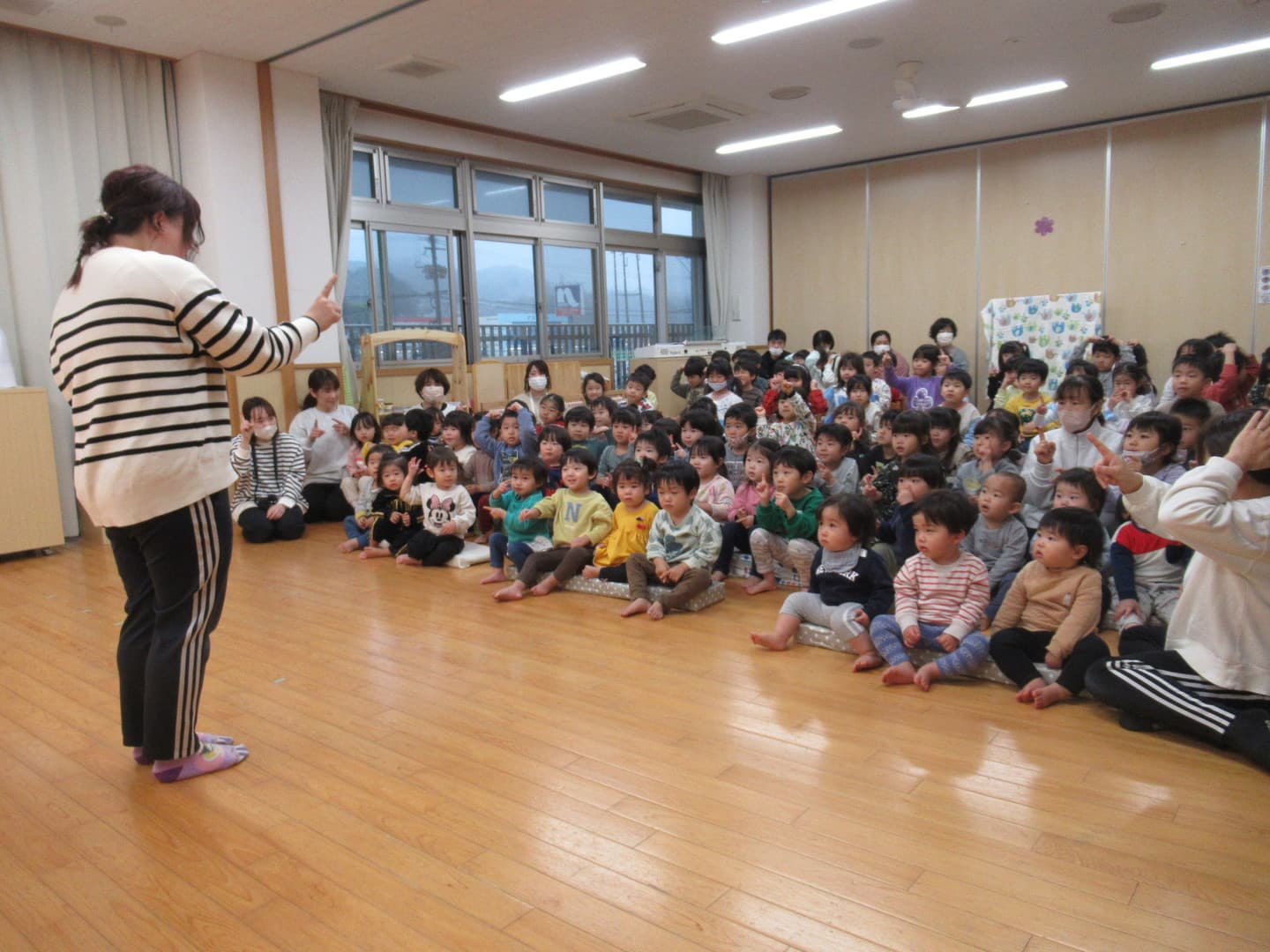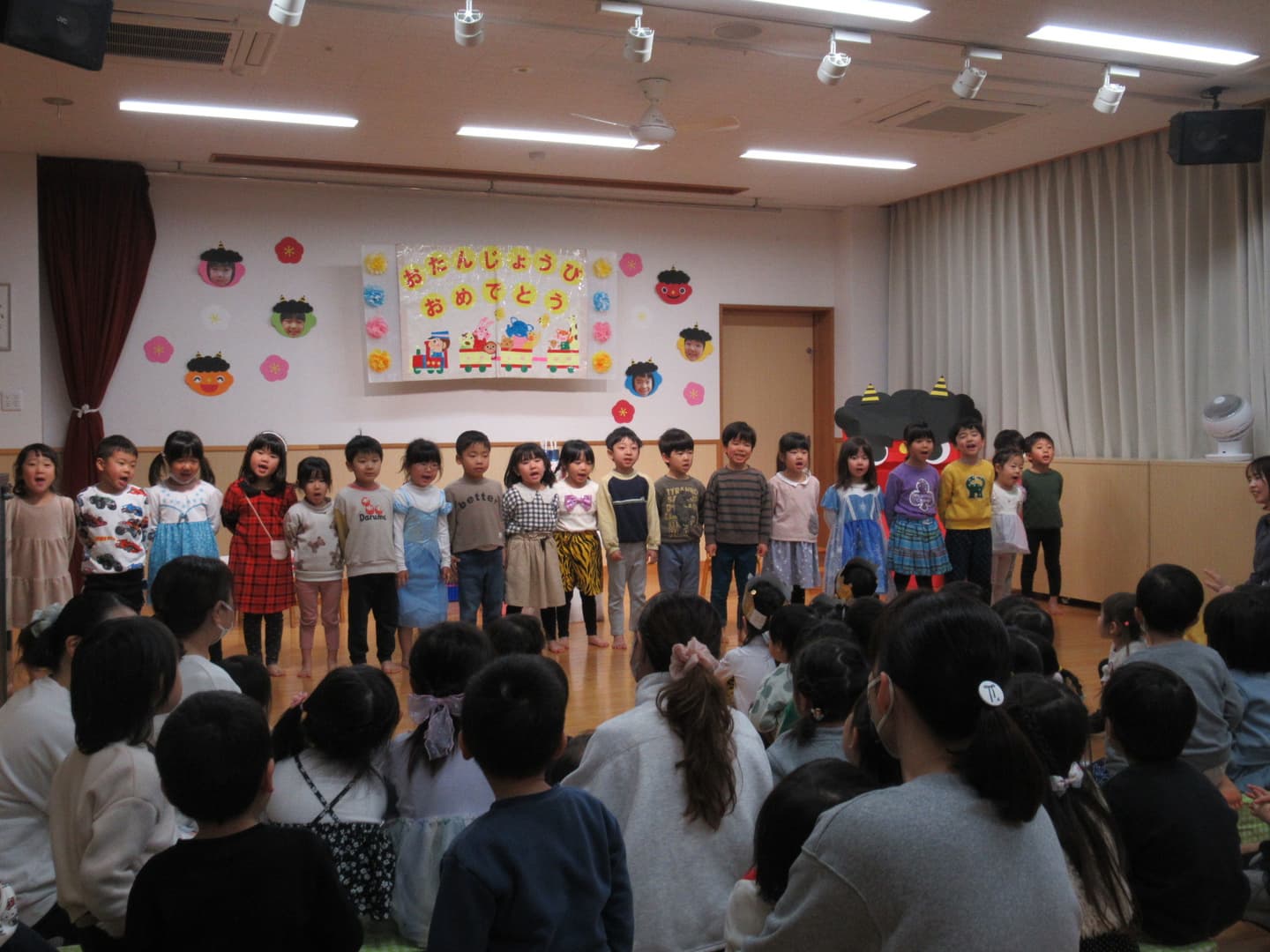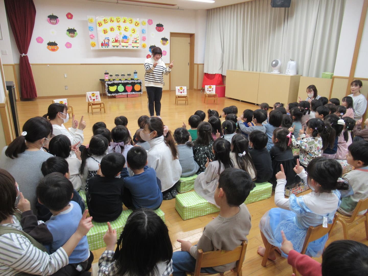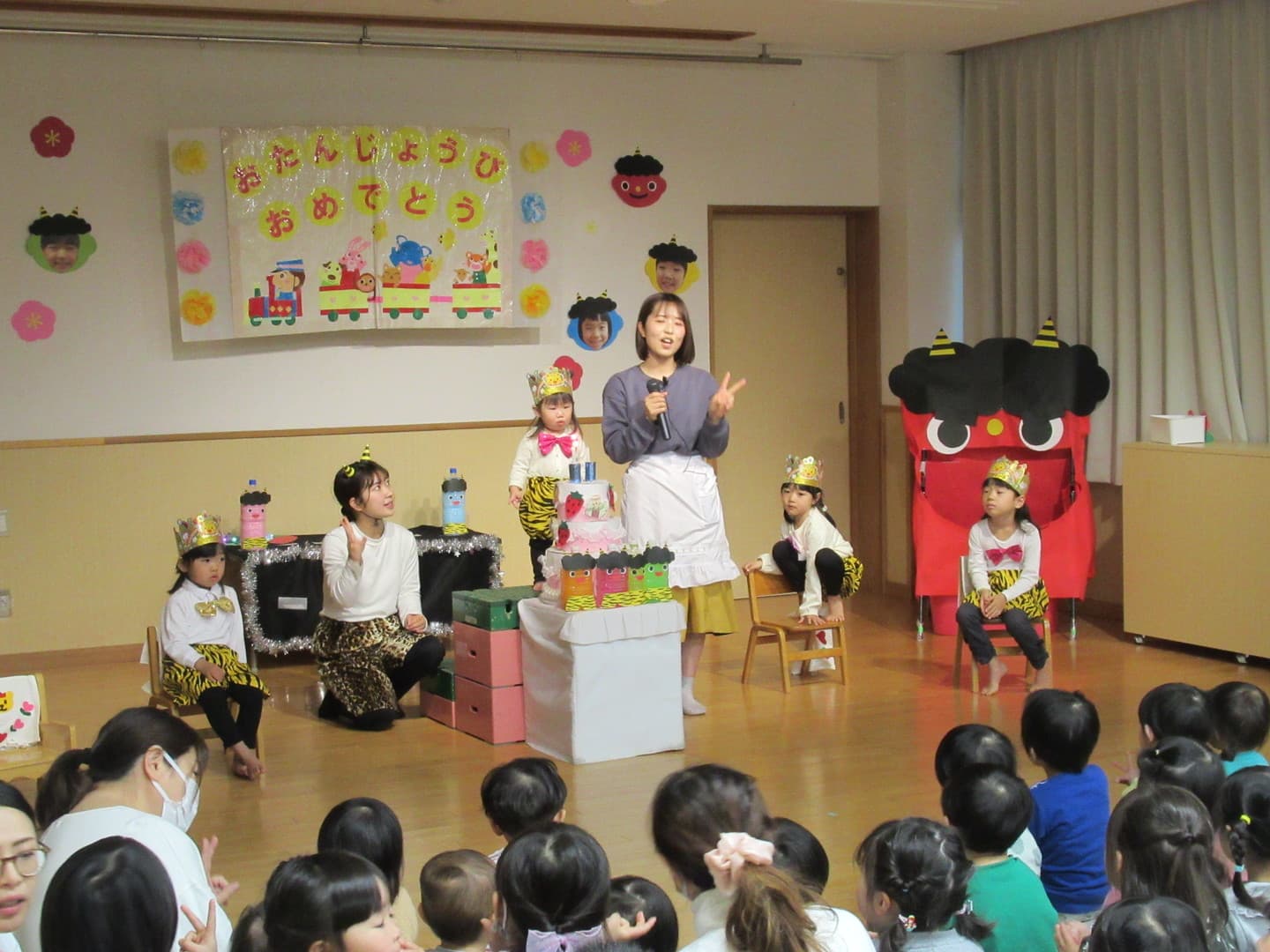 節分の日にやってきた鬼の子どもたちが迷子になっているのを見つけたばばばあちゃんは、一緒に遊んで待つことにしました。大きな鬼の口をめがけてボールを投げたり、ばばばあちゃんに魔法をかけてもらうと透明だった水が好きな果物のジュースになったり・・・みんな楽しそうでしたよ。お母さんが迎えに来て一緒にお誕生会をしました。たいよう組さんから歌のプレゼントもあり楽しい会になりました♪