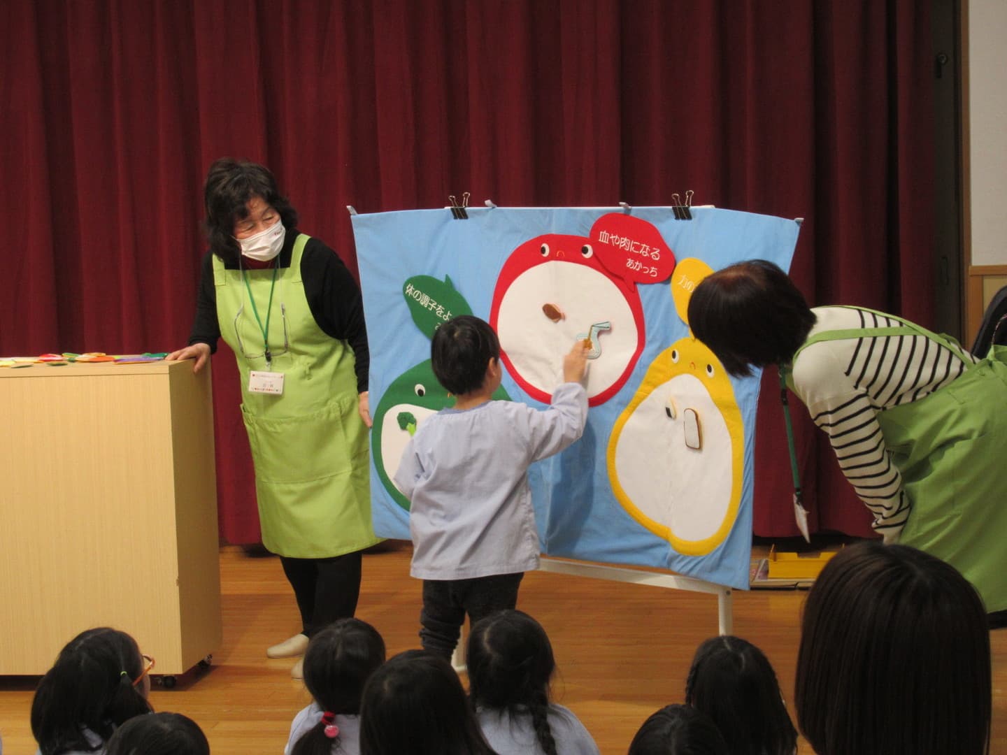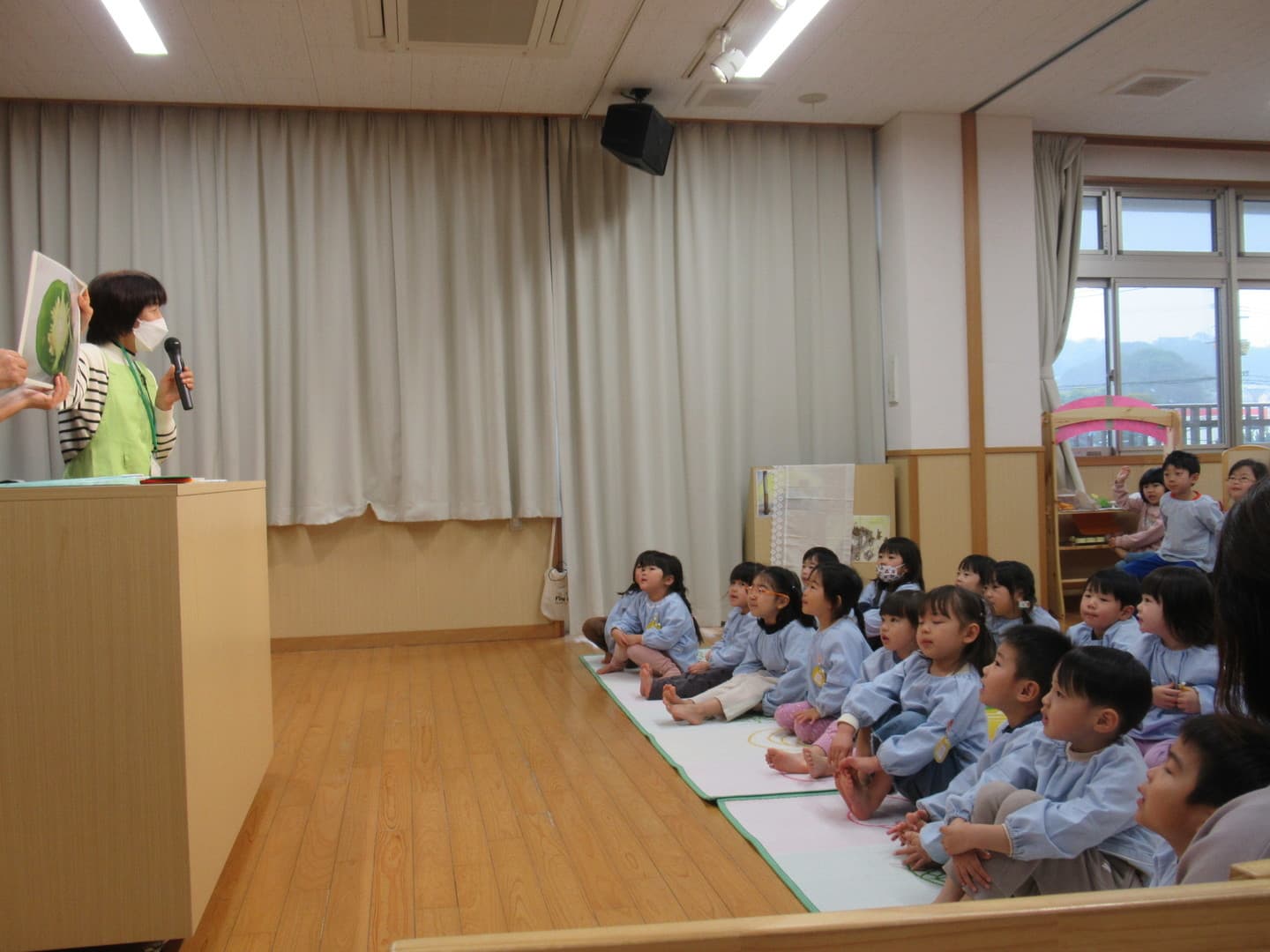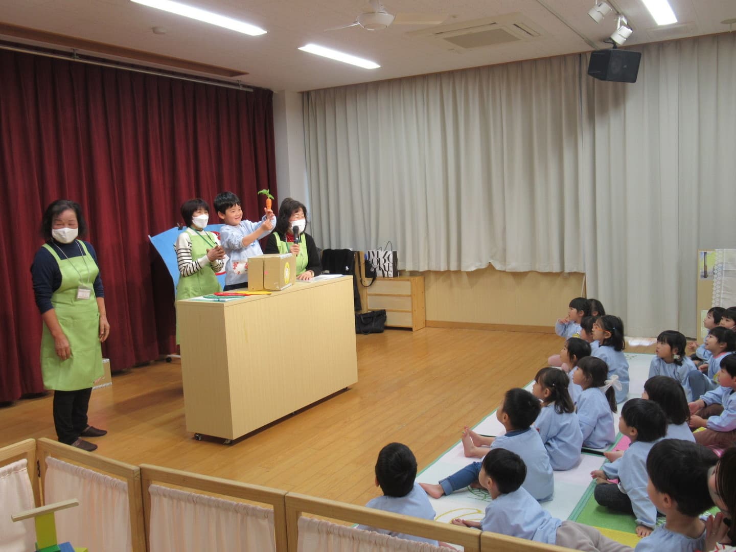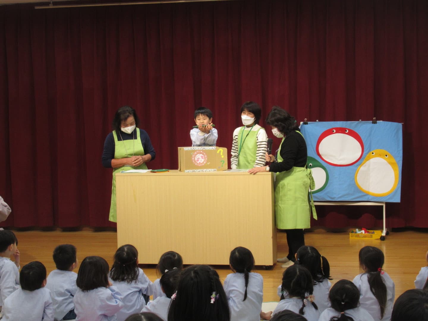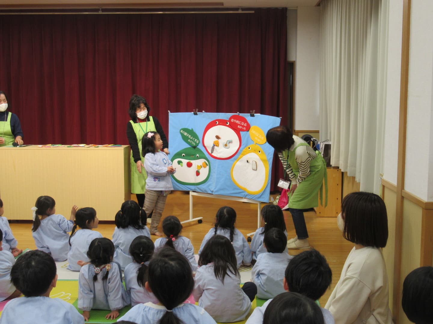 食育サポートチームの方に来ていただき、以上児クラスの園児たちが食べ物について楽しく学びました。断面や花を見て、何の野菜か当てるクイズや、箱の中にある野菜を触って答えるクイズがあり、園児たちも喜んで参加していましたよ。最後は3つの栄養素についての話もあり、いつも食べている食材がどの栄養素に分類されるかなどを教えてもらい、興味を持つことができたようです。