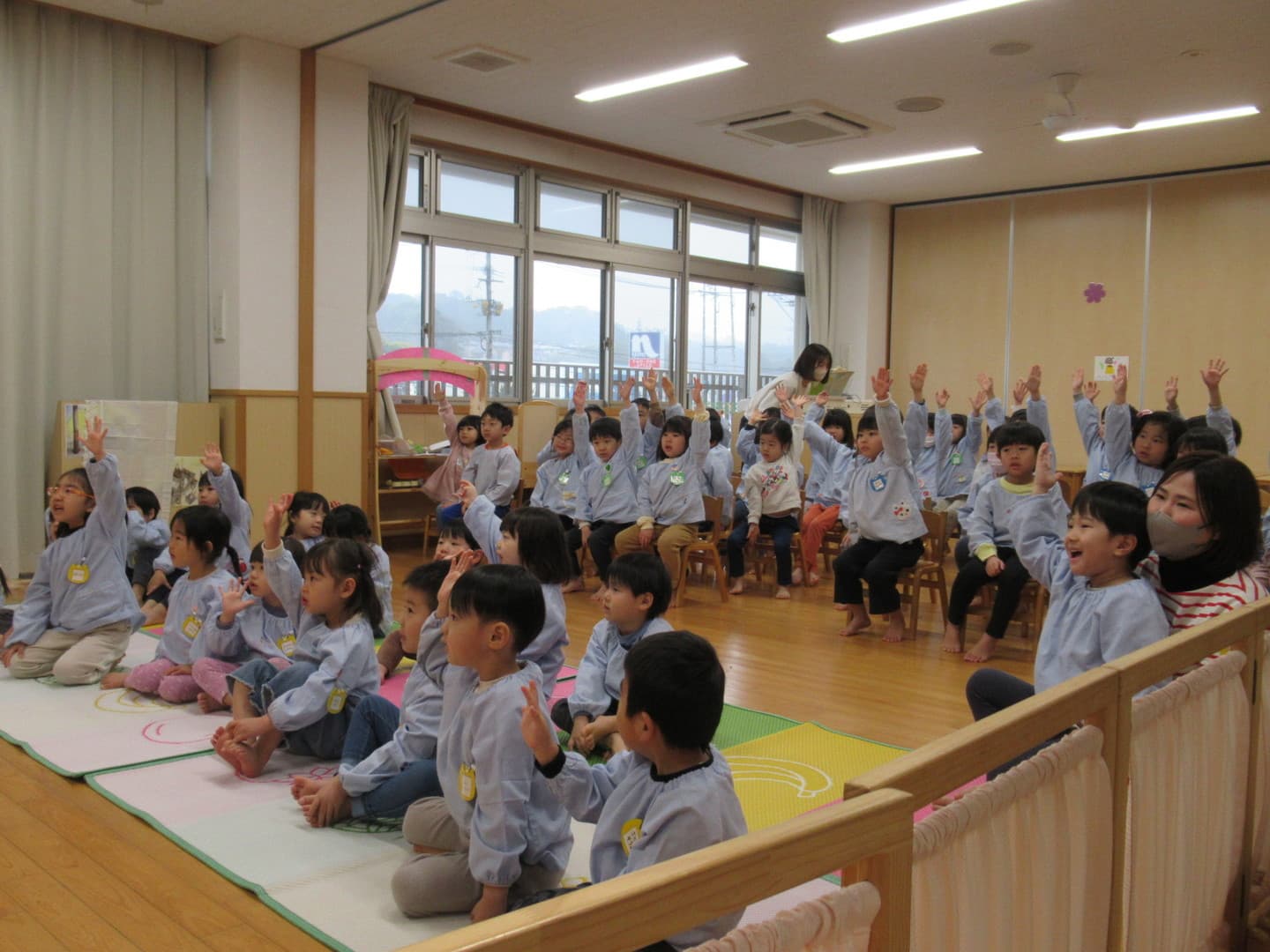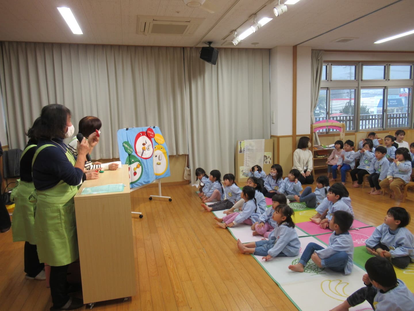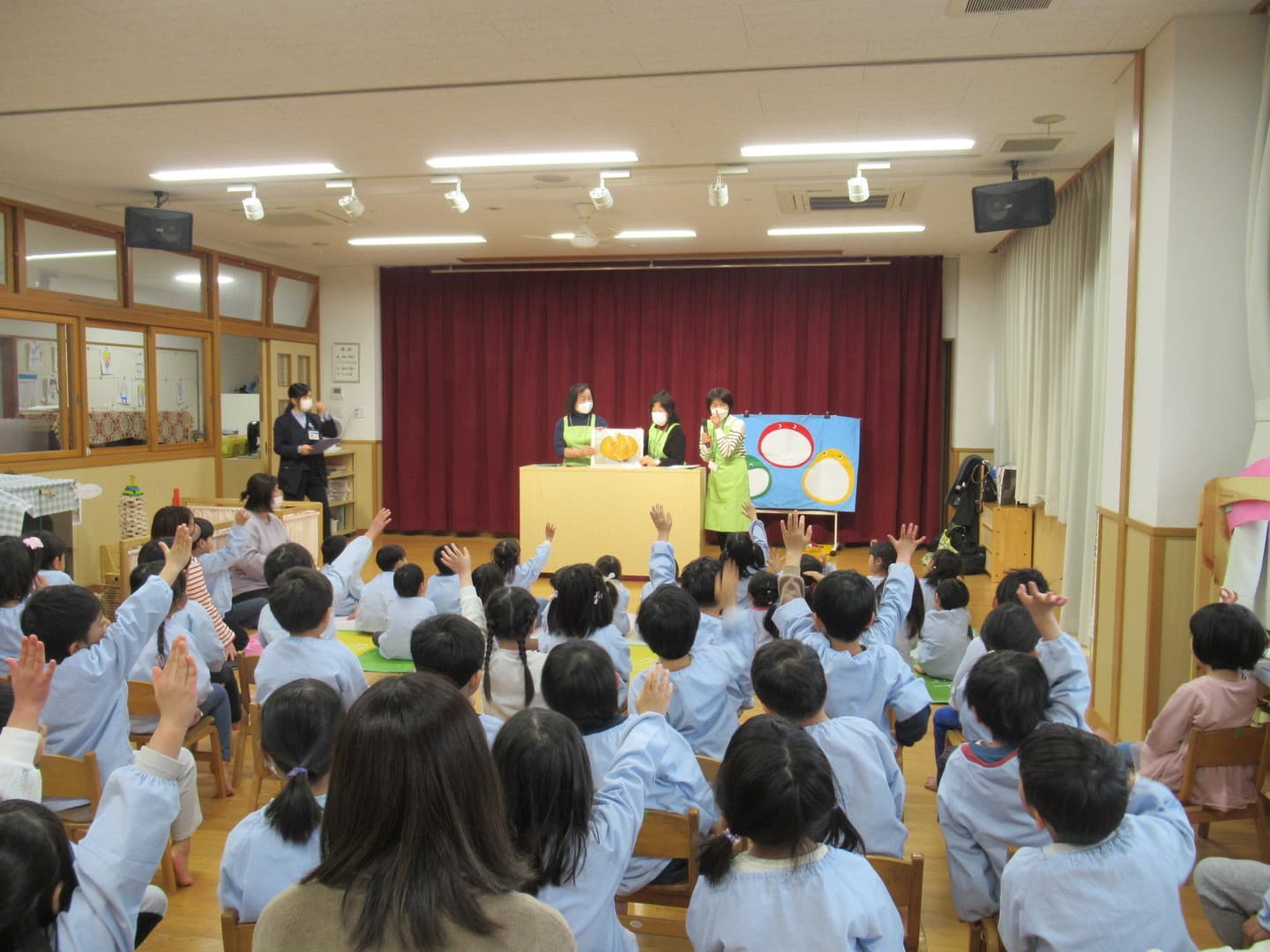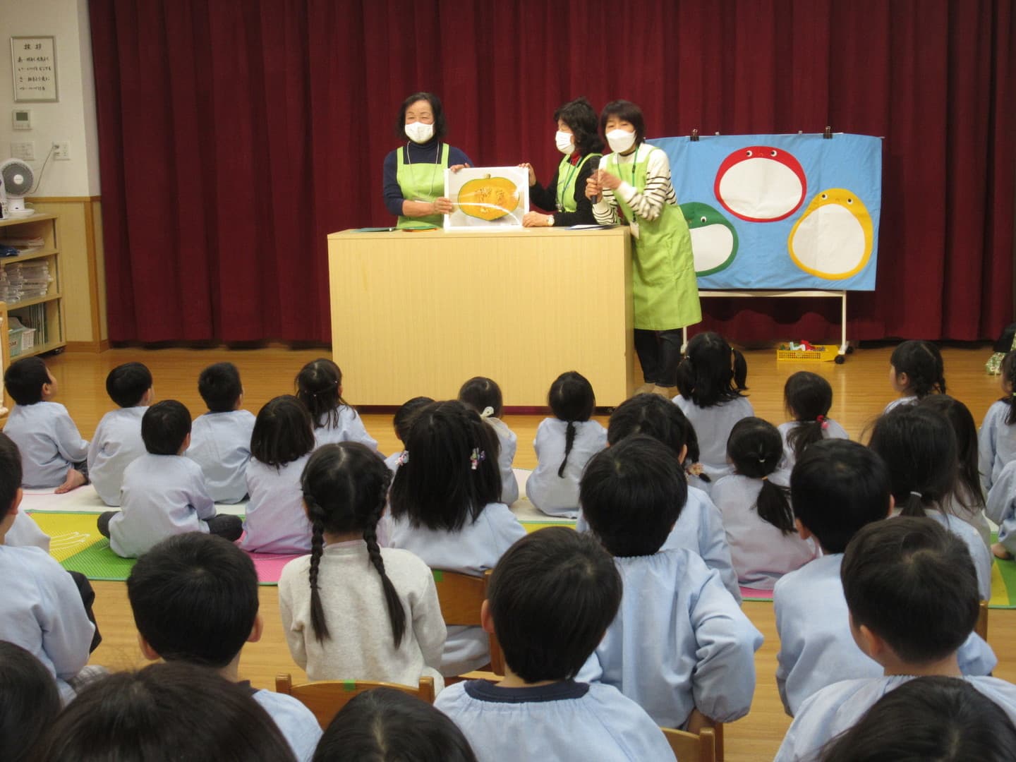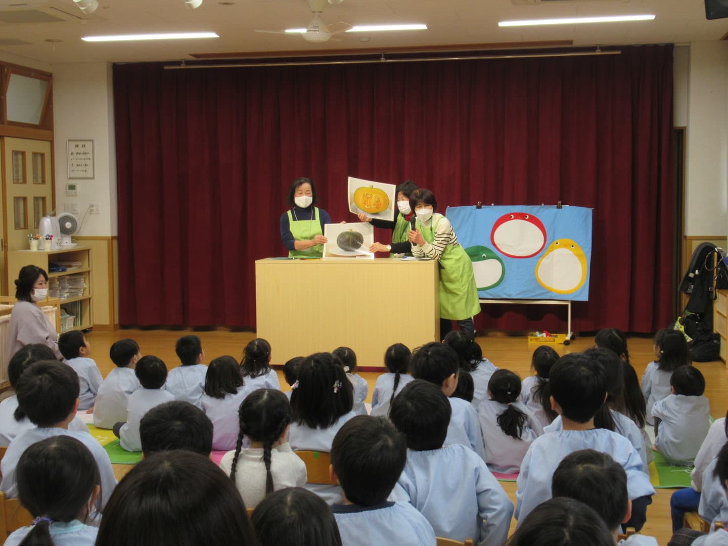 食育サポートチームの方に来ていただき、以上児クラスの園児たちが食べ物について楽しく学びました。断面や花を見て、何の野菜か当てるクイズや、箱の中にある野菜を触って答えるクイズがあり、園児たちも喜んで参加していましたよ。最後は3つの栄養素についての話もあり、いつも食べている食材がどの栄養素に分類されるかなどを教えてもらい、興味を持つことができたようです。