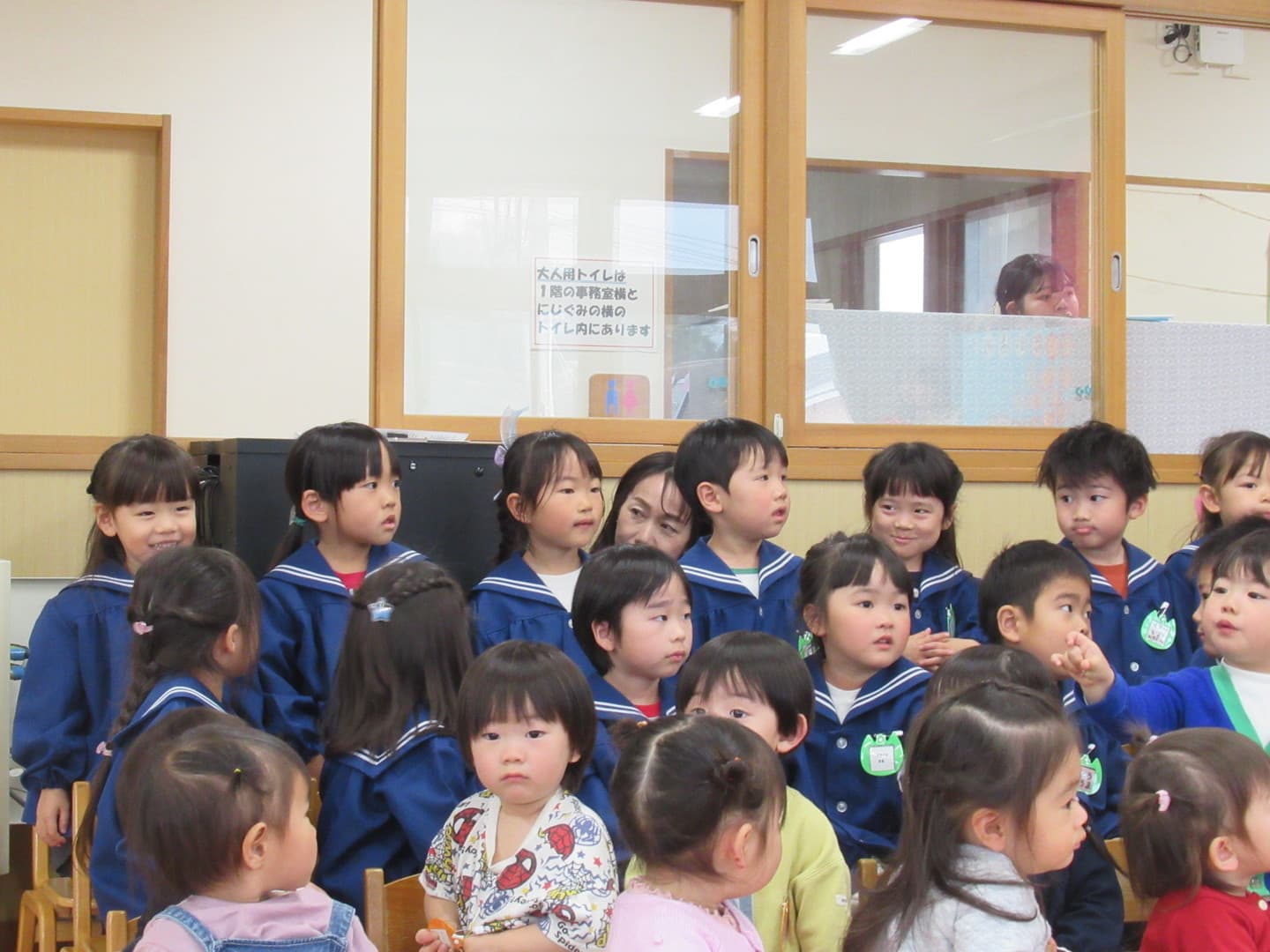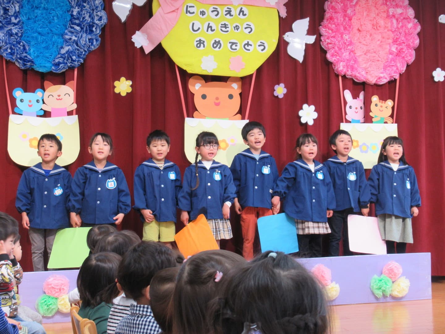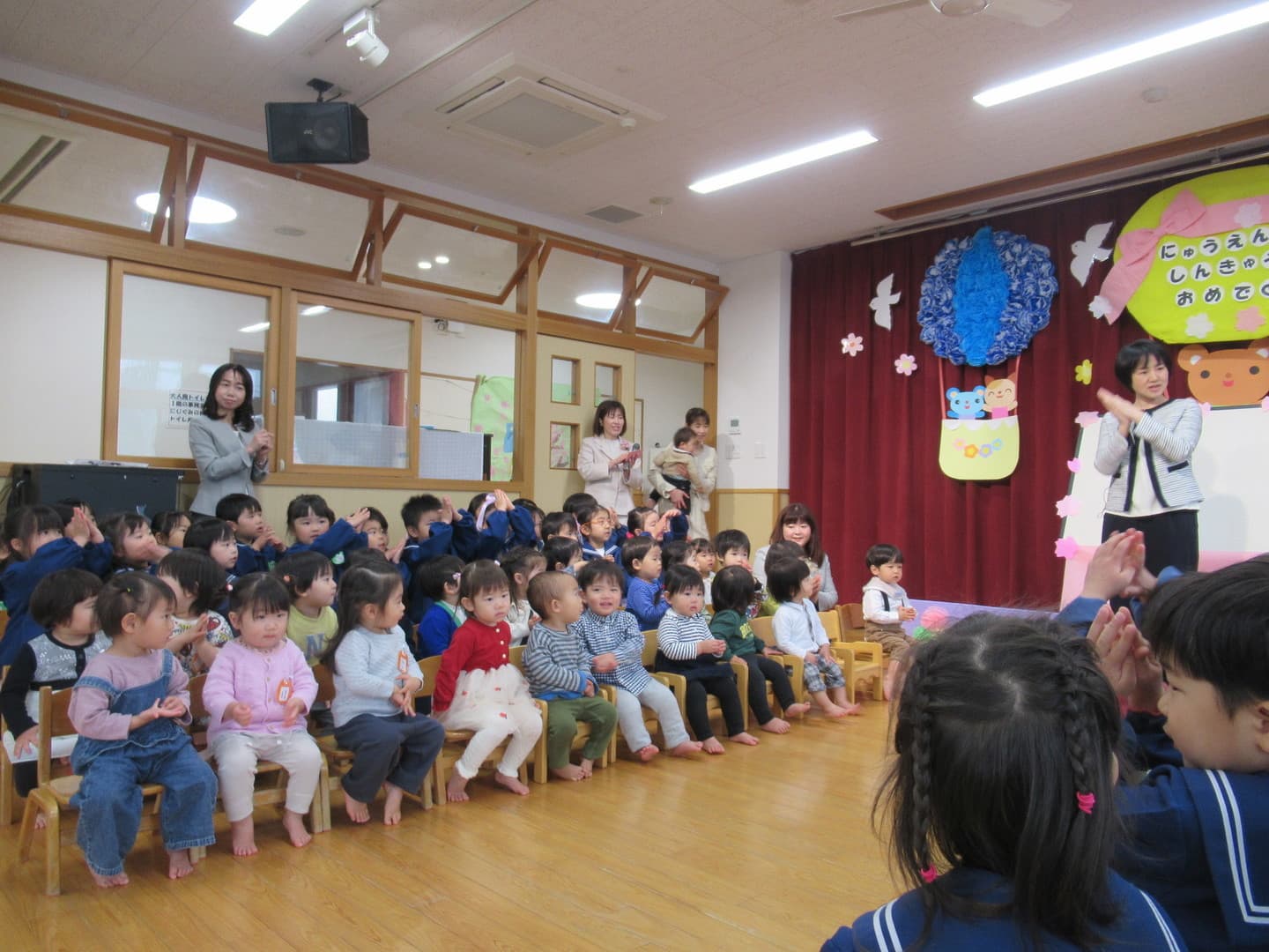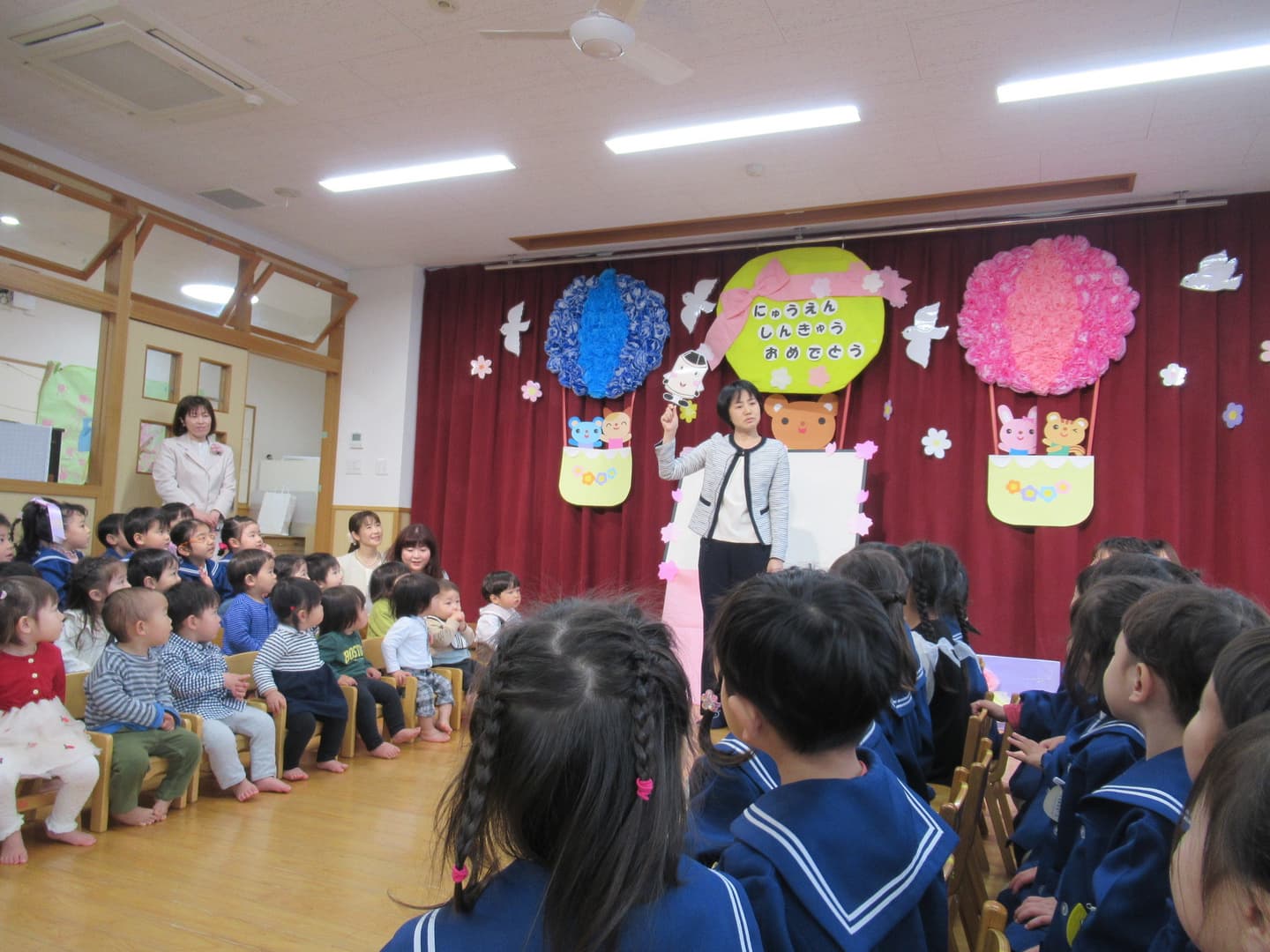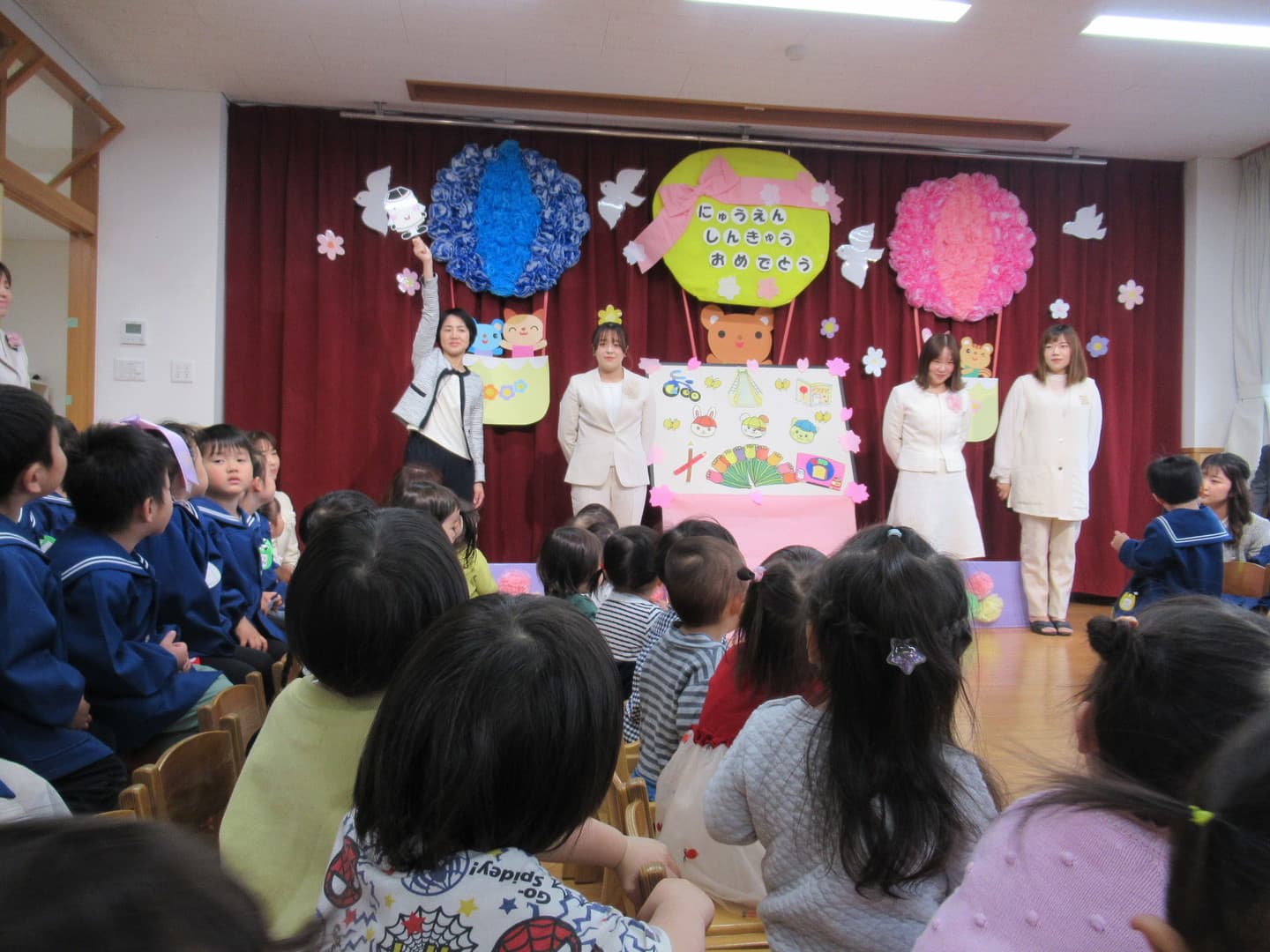 新入園児12名を迎え、今年度は94名でスタートしました。入園・進級式では、お家の方に見守られながら元気よく入場し、みんなで手遊びをしたり、パネルシアターを見て楽しみました。新しい担任から名前を呼んでもらうと、大きな声で返事をしていましたよ。新生活になり不安の多い4月ですが、気持ちに寄り添い安心して園生活を送れるように関わっていきたいと思います。