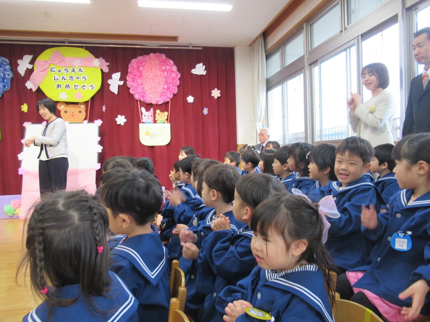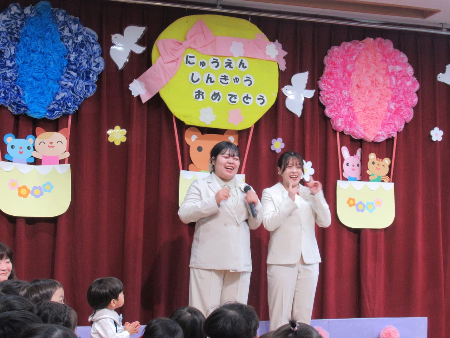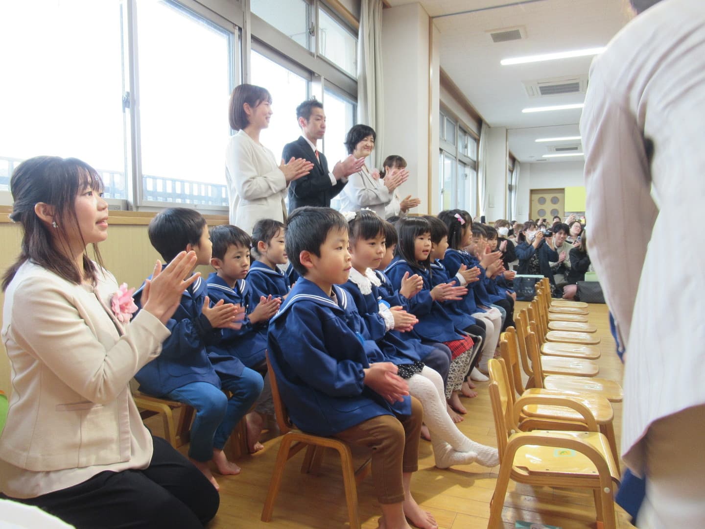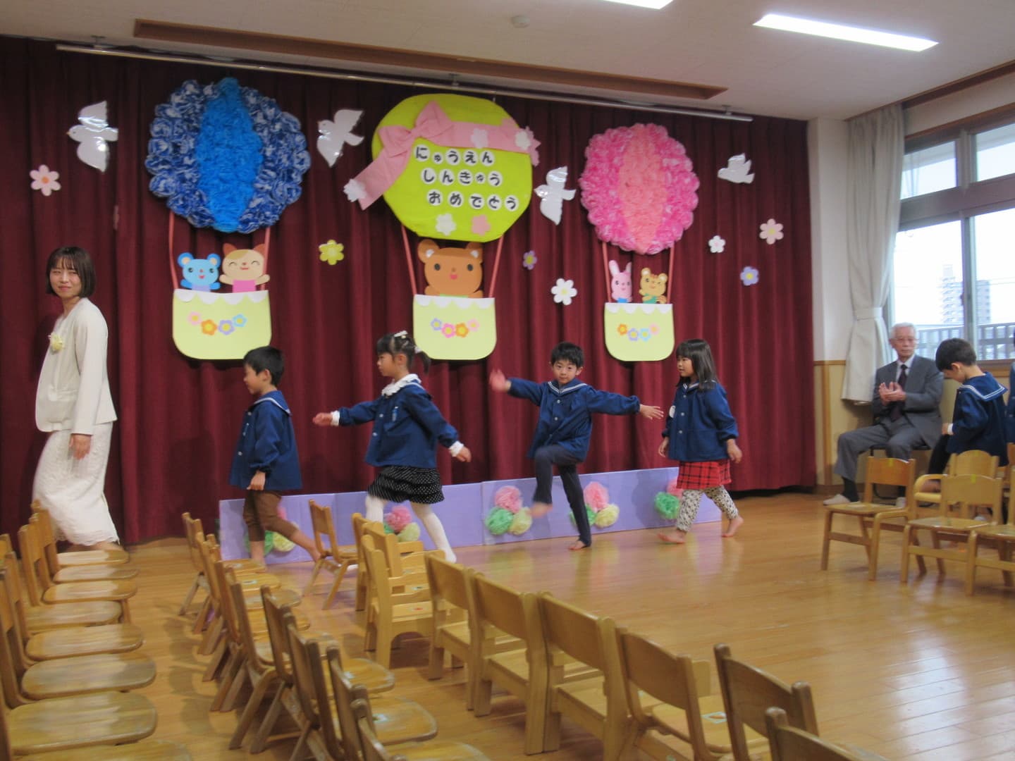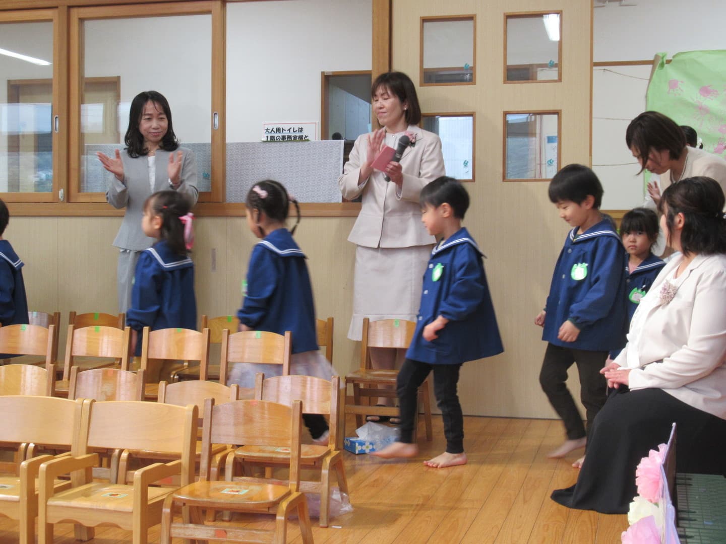 新入園児12名を迎え、今年度は94名でスタートしました。入園・進級式では、お家の方に見守られながら元気よく入場し、みんなで手遊びをしたり、パネルシアターを見て楽しみました。新しい担任から名前を呼んでもらうと、大きな声で返事をしていましたよ。新生活になり不安の多い4月ですが、気持ちに寄り添い安心して園生活を送れるように関わっていきたいと思います。