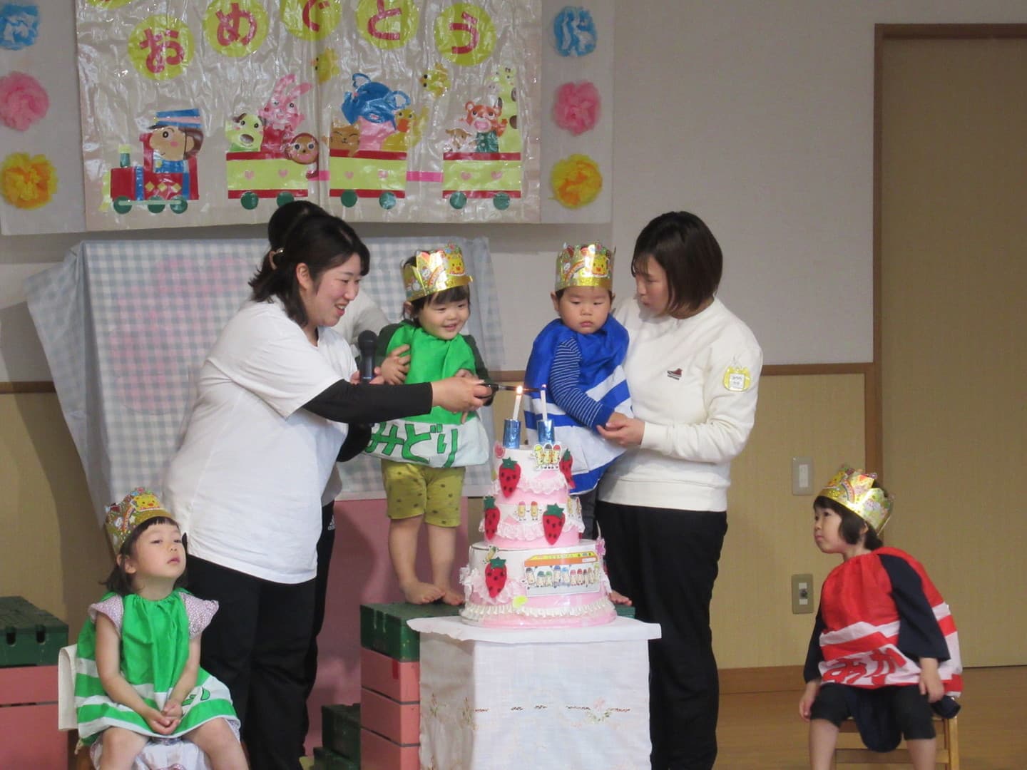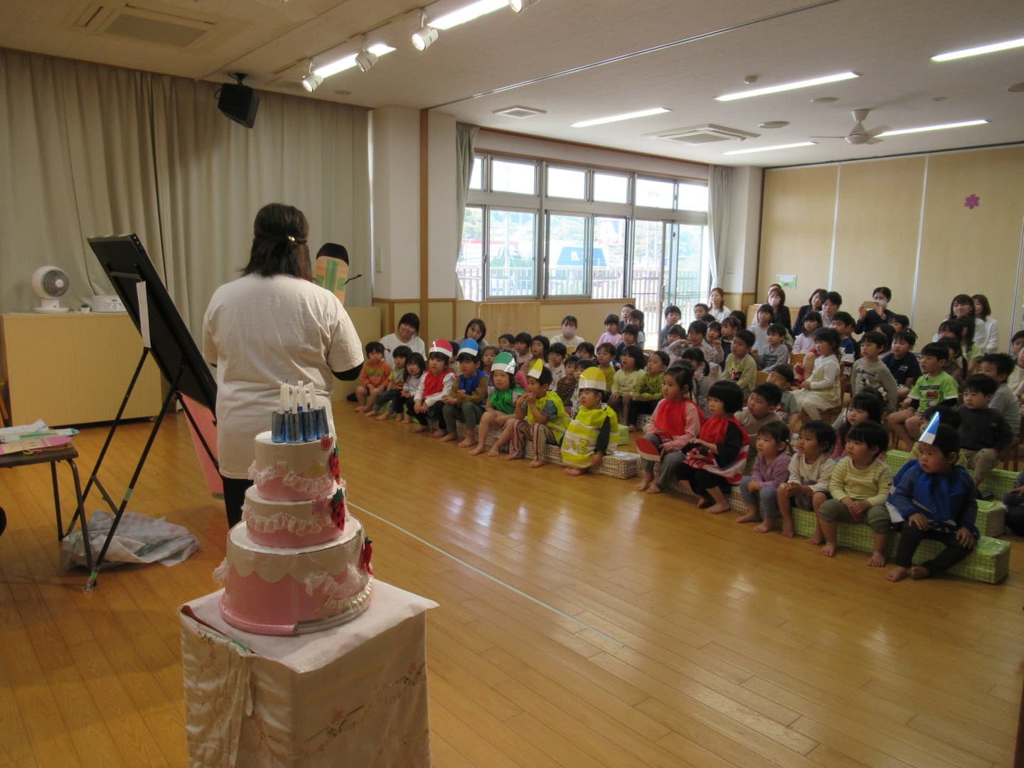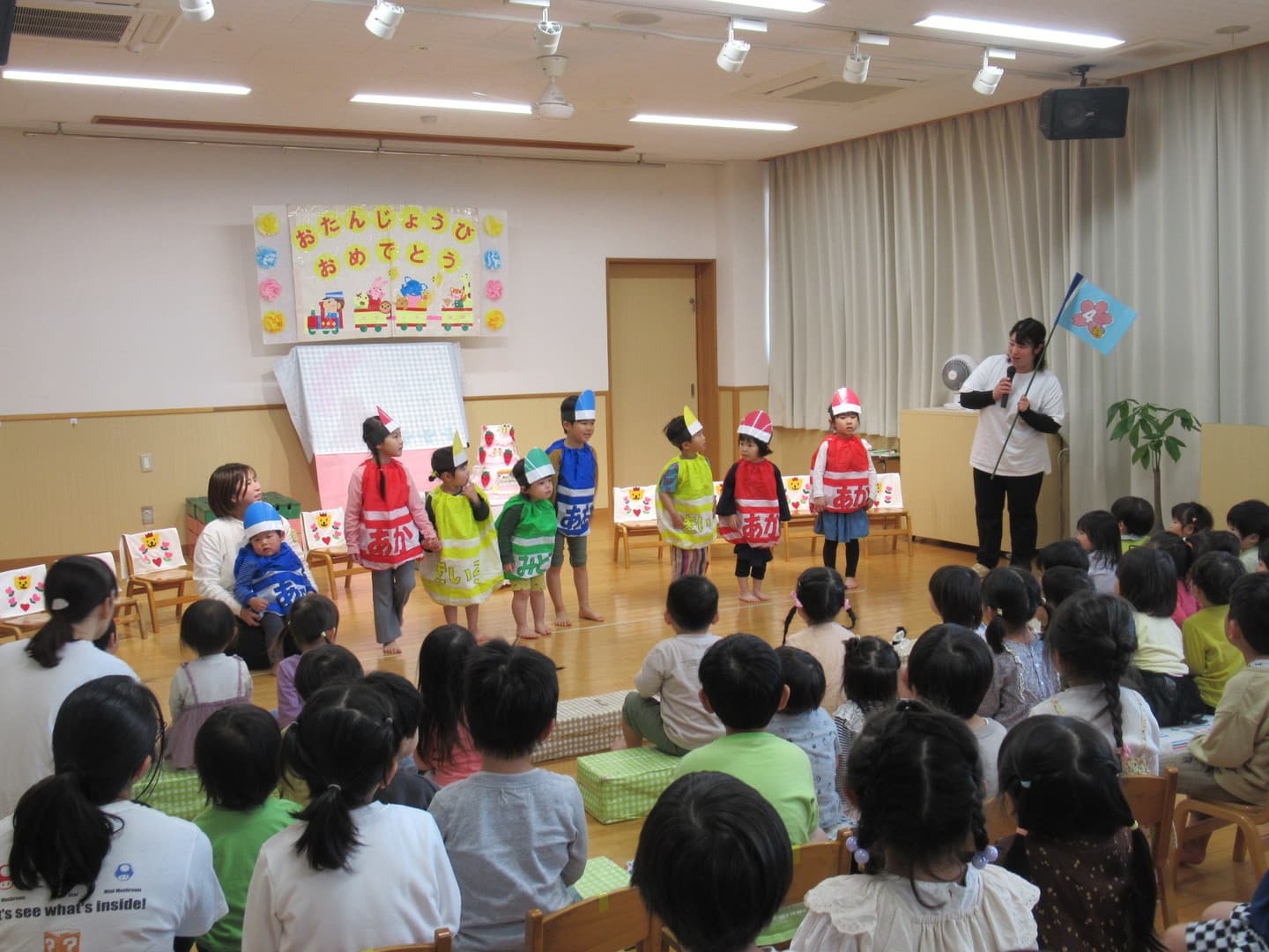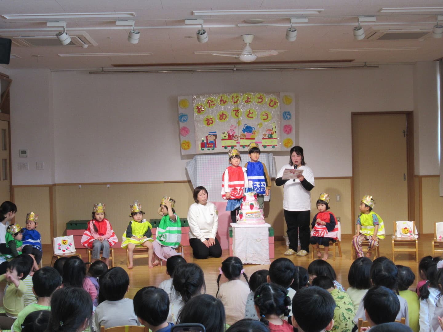 今年度は「くれよんのくろくん」の絵本をテーマに、誕生児さんは色々な色のクレヨンに変身して登場しました。みんなでダンスをしたり、“ちょうちょ”と“チューリップ”の歌を披露してくれましたよ♪最後はくろくんがお友達を連れて遊びに来てくれました。塗りかけだった絵を完成させてくれ、春らしい誕生会になりました。