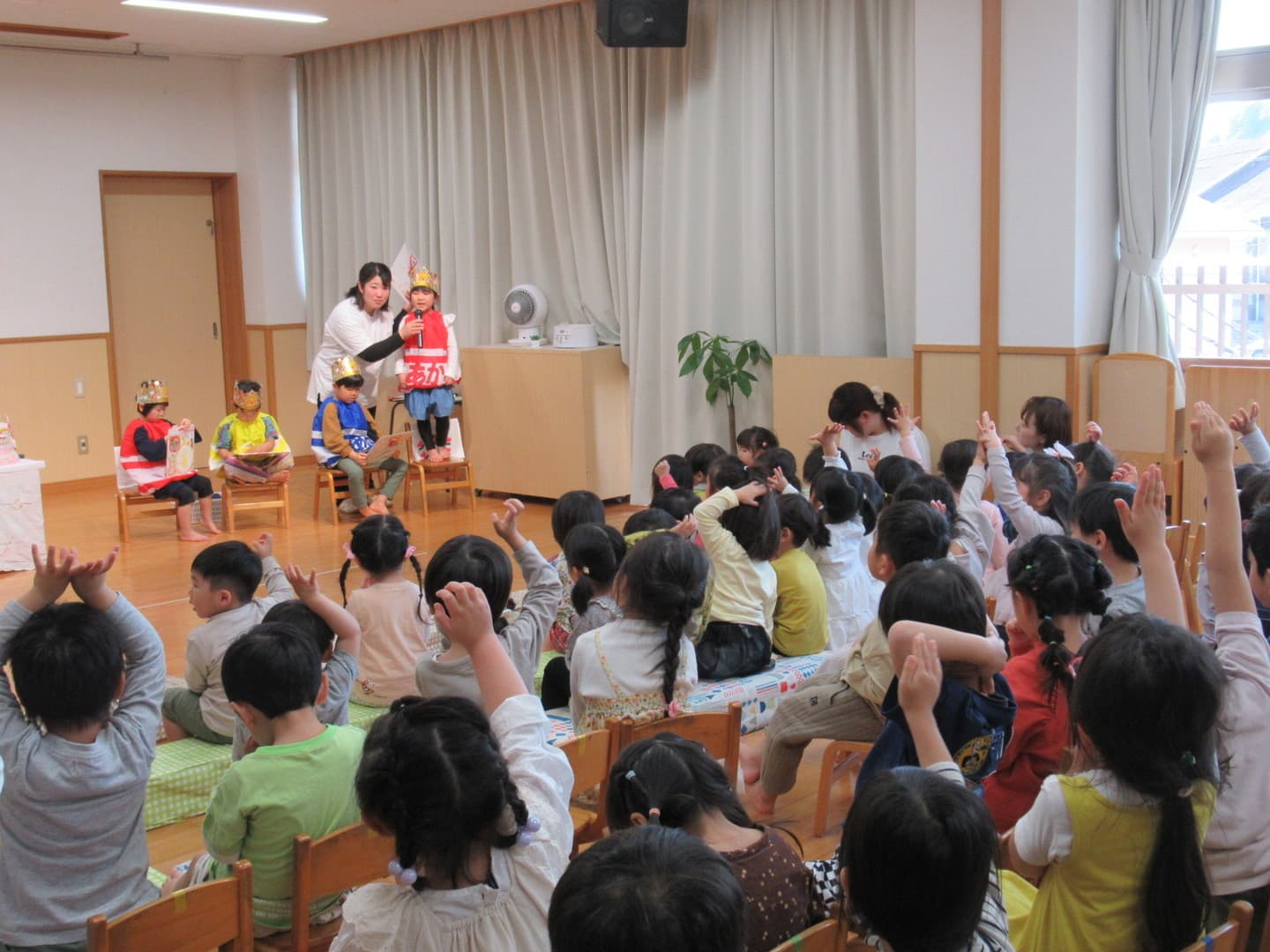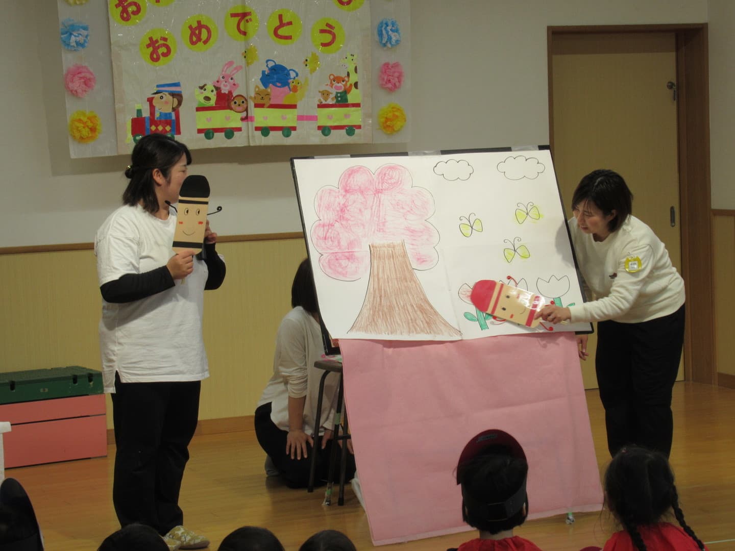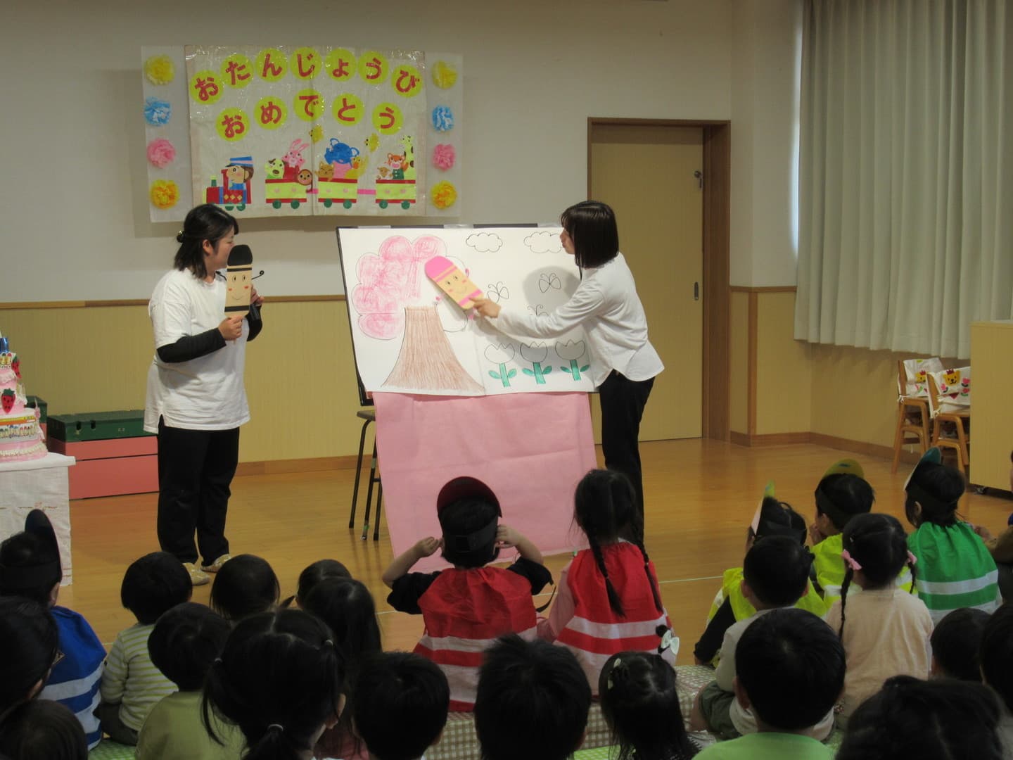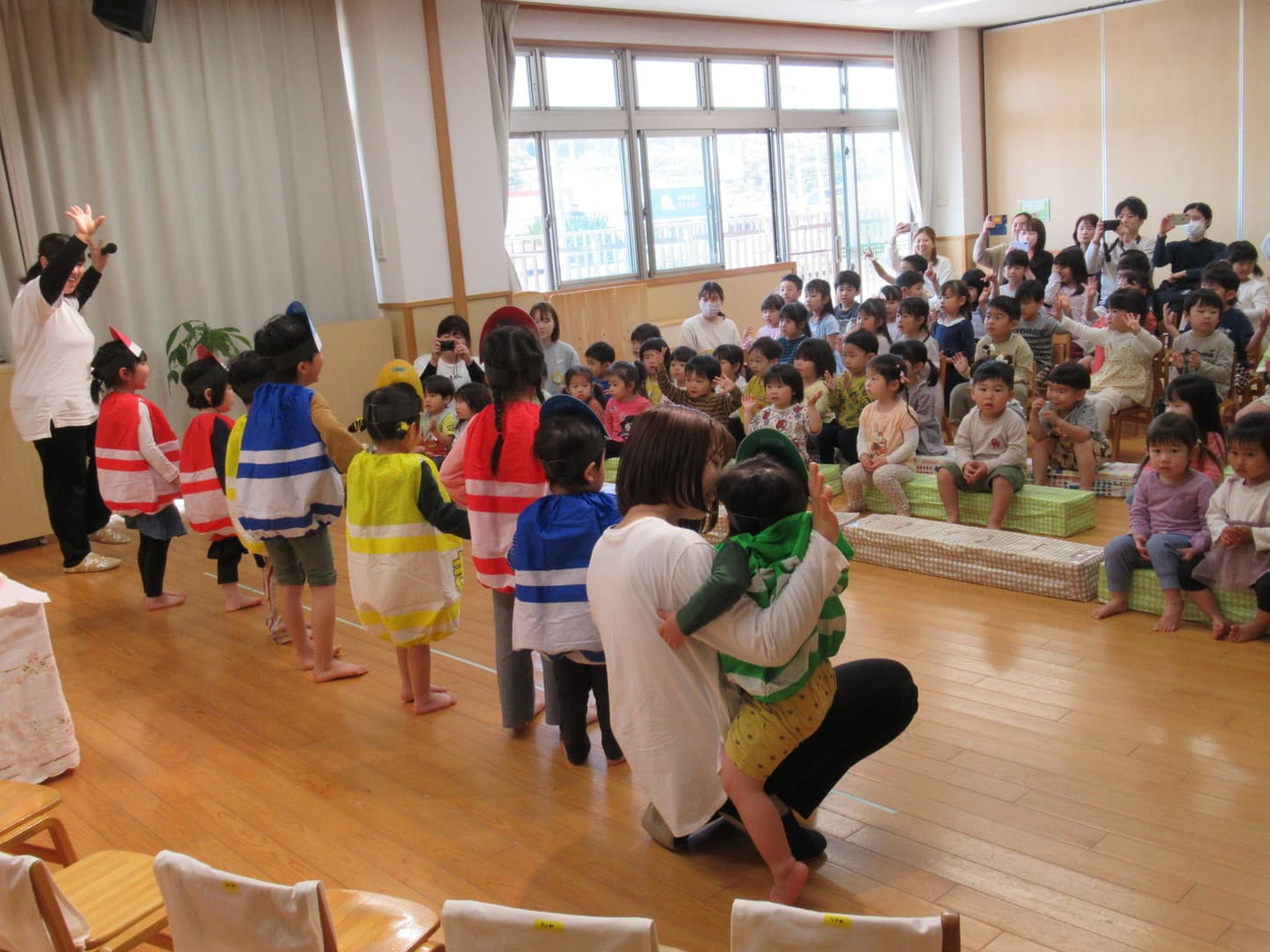 今年度は「くれよんのくろくん」の絵本をテーマに、誕生児さんは色々な色のクレヨンに変身して登場しました。みんなでダンスをしたり、“ちょうちょ”と“チューリップ”の歌を披露してくれましたよ♪最後はくろくんがお友達を連れて遊びに来てくれました。塗りかけだった絵を完成させてくれ、春らしい誕生会になりました。