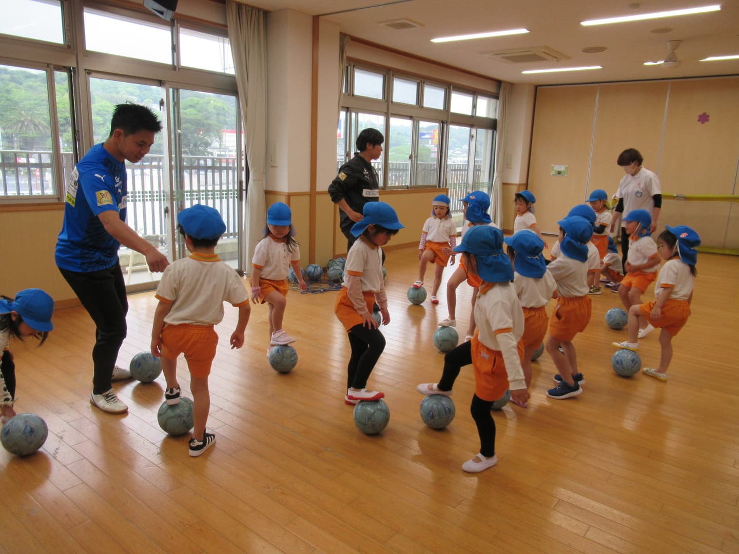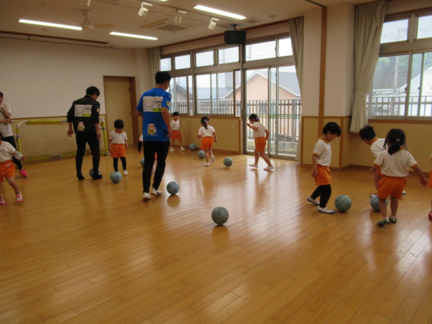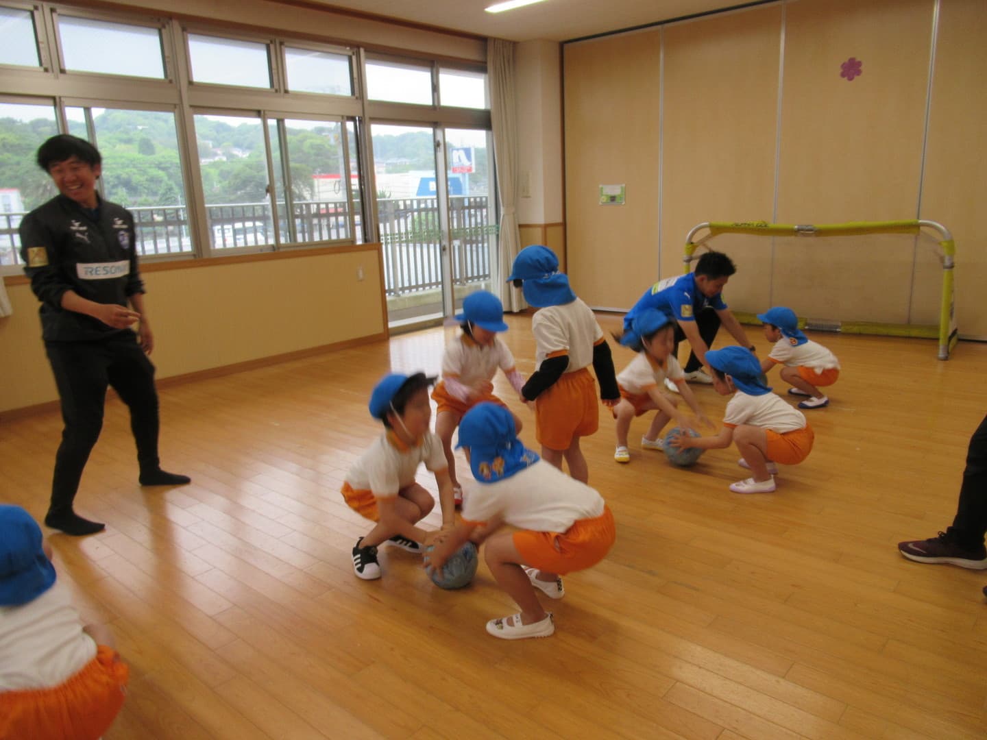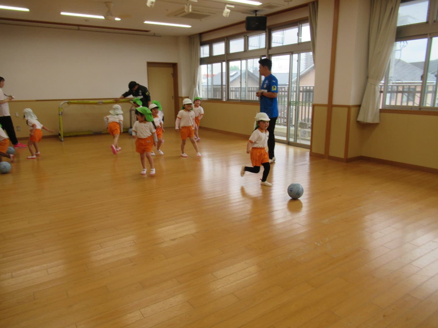 大分トリニータから2人のコーチが来てくれました。たいよう組さんは初めてのサッカー教室でしたが、意欲的に参加し最後のミニゲームでは、ボールを追いかけて元気に走り回っていましたよ。そら組さんは2人組になってコーチが言った体の部位を触り、“ボール”と言ったら二人の間にあるボールを取る瞬発的なゲームを喜んでいました。雨で室内での活動になりましたが、みんな楽しんでいましたよ。