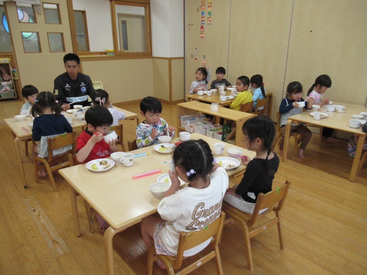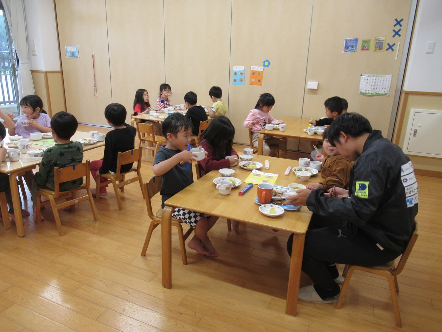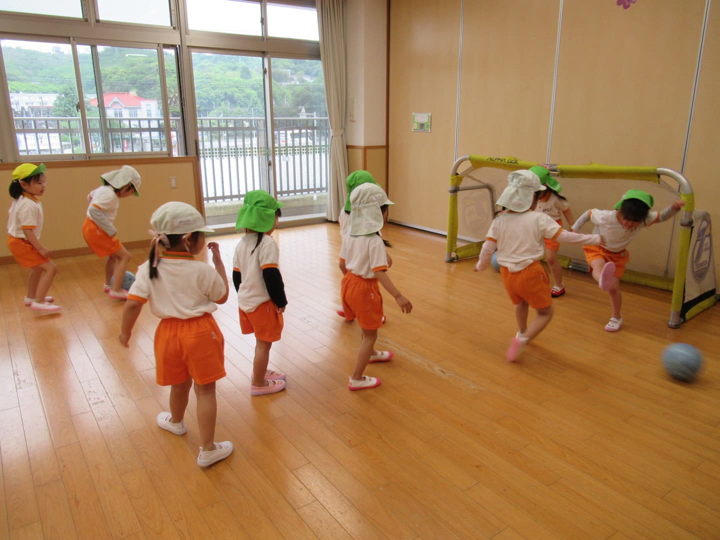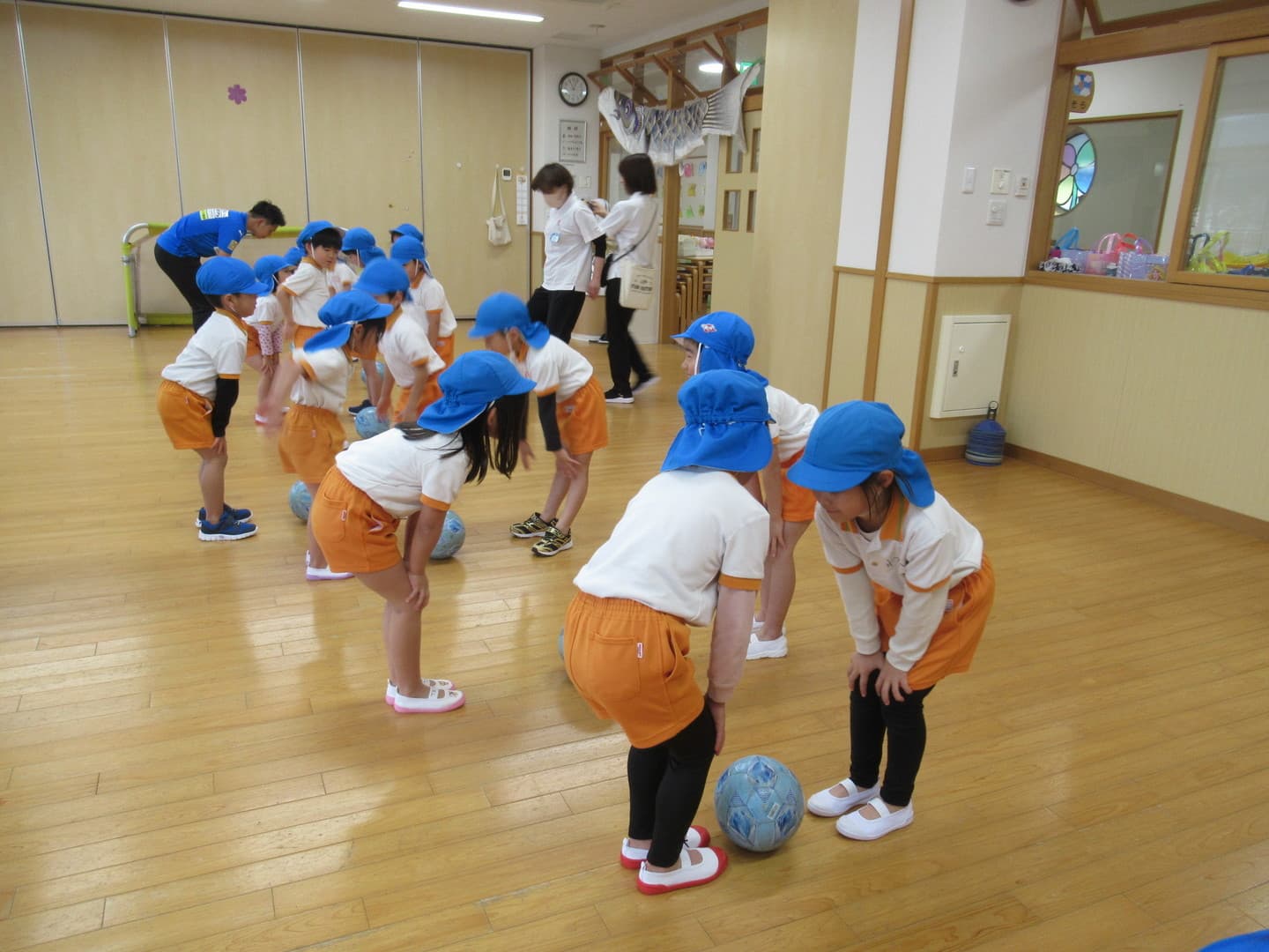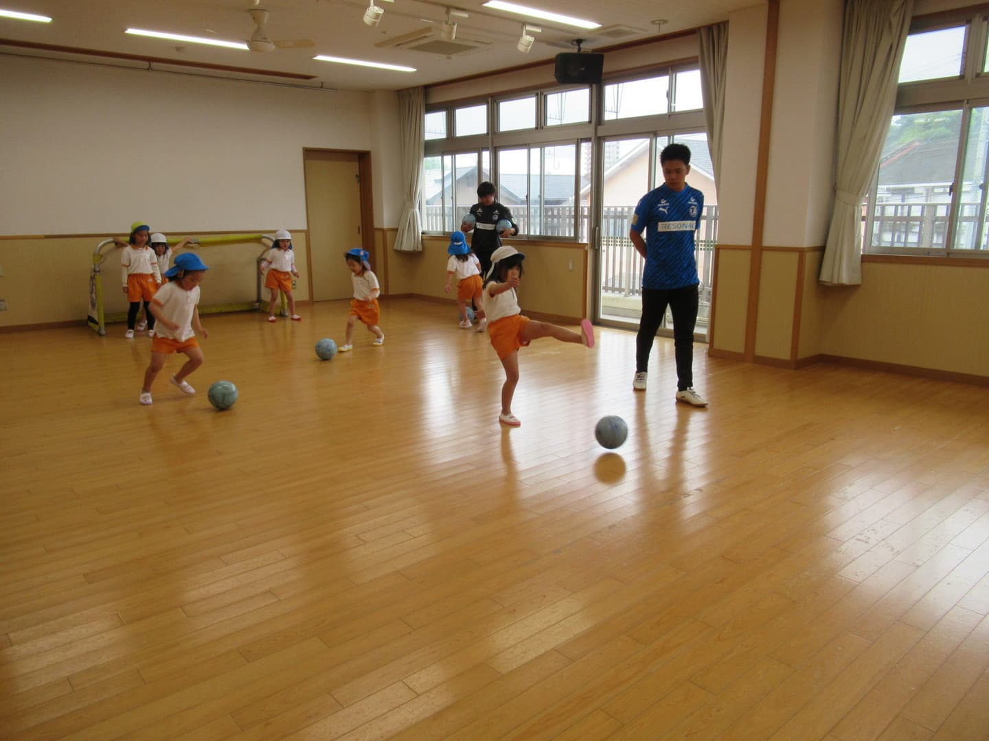 大分トリニータから2人のコーチが来てくれました。たいよう組さんは初めてのサッカー教室でしたが、意欲的に参加し最後のミニゲームでは、ボールを追いかけて元気に走り回っていましたよ。そら組さんは2人組になってコーチが言った体の部位を触り、“ボール”と言ったら二人の間にあるボールを取る瞬発的なゲームを喜んでいました。雨で室内での活動になりましたが、みんな楽しんでいましたよ。