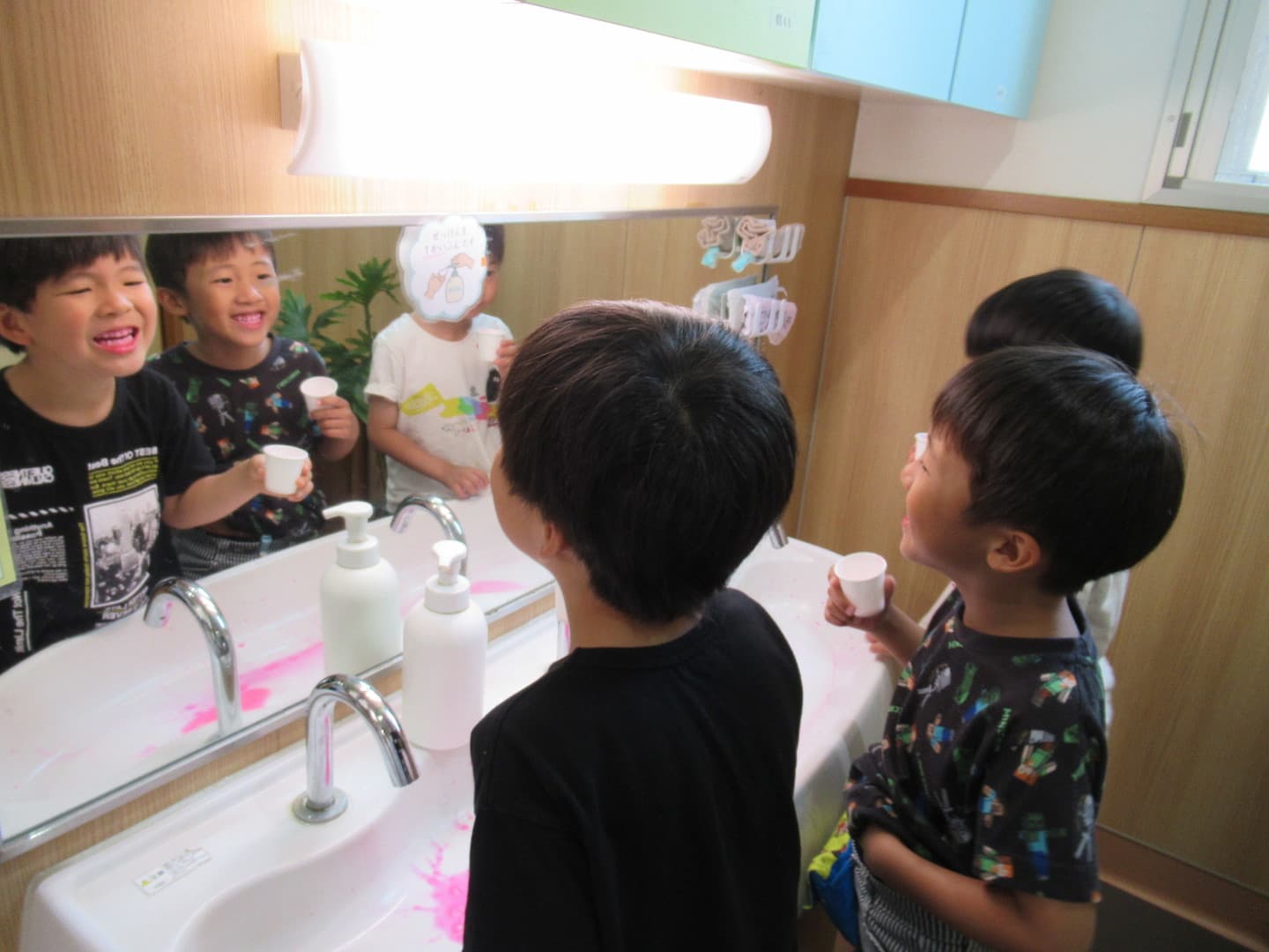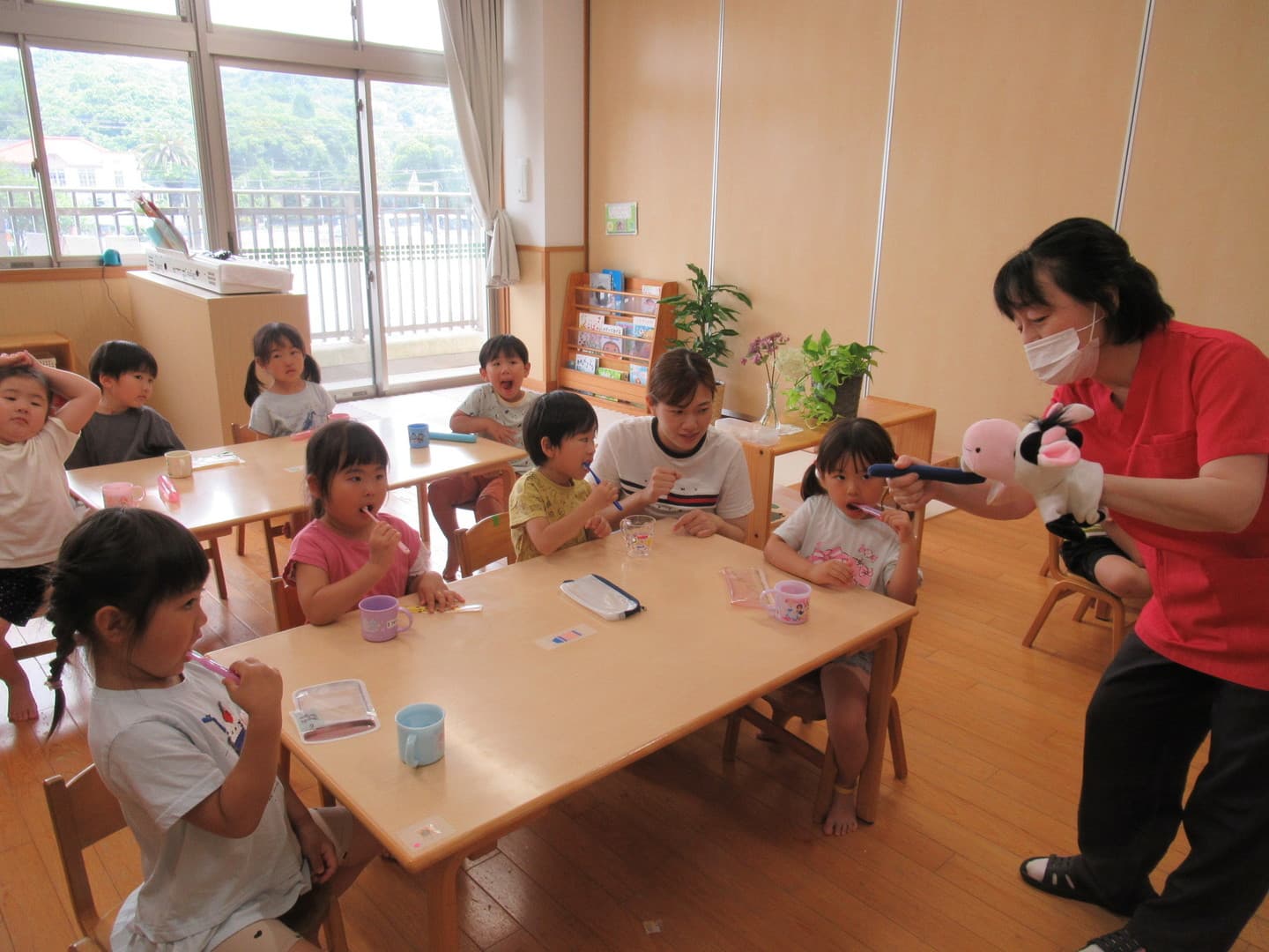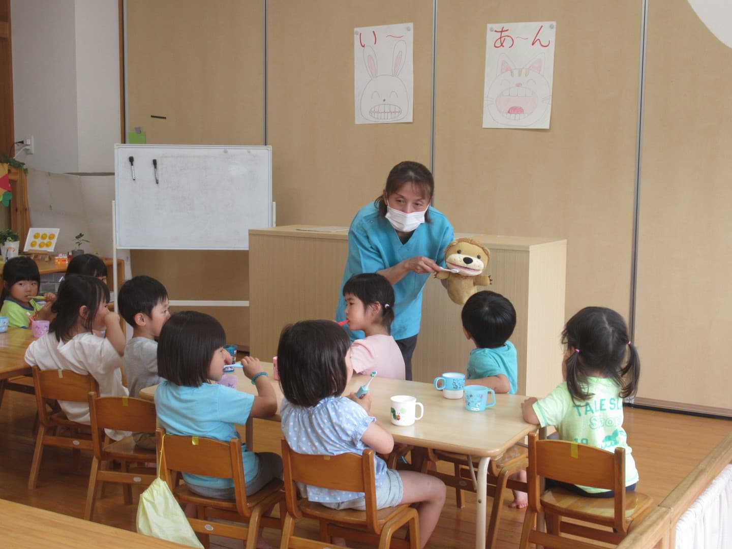 歯科衛生士さんに来ていただき、以上児クラスの園児たちが歯磨き指導を受けました。イラストやパペットで分かりやすく口の開け方や、歯の磨き方を教えてもらうとみんな上手に真似をしていましたよ。年長児は染め出し液を使って、鏡を見ながら磨き残しを確認し、きれいに汚れを落としていました。今日教えてもらったことをこれからも続けて欲しいと思います。