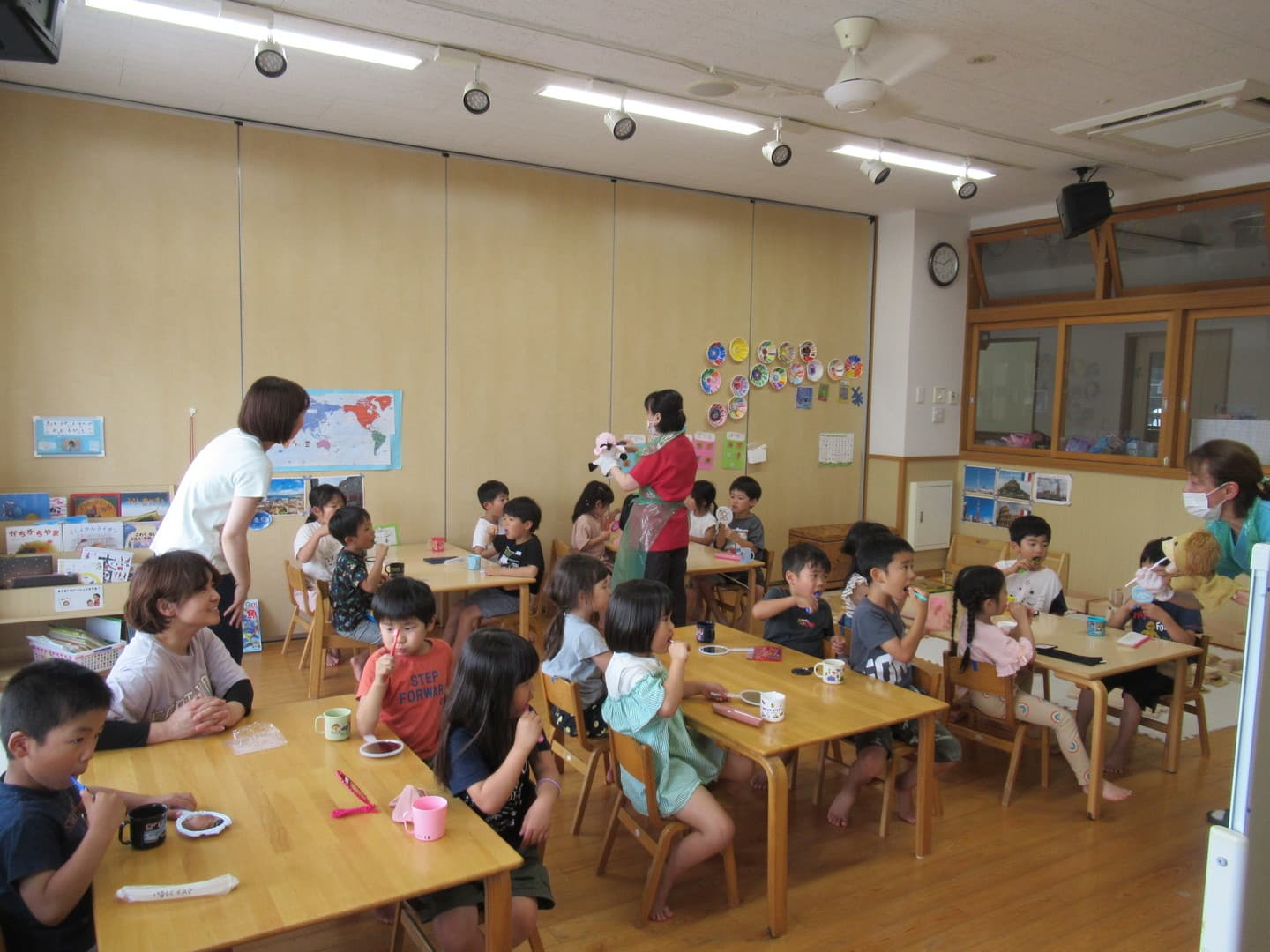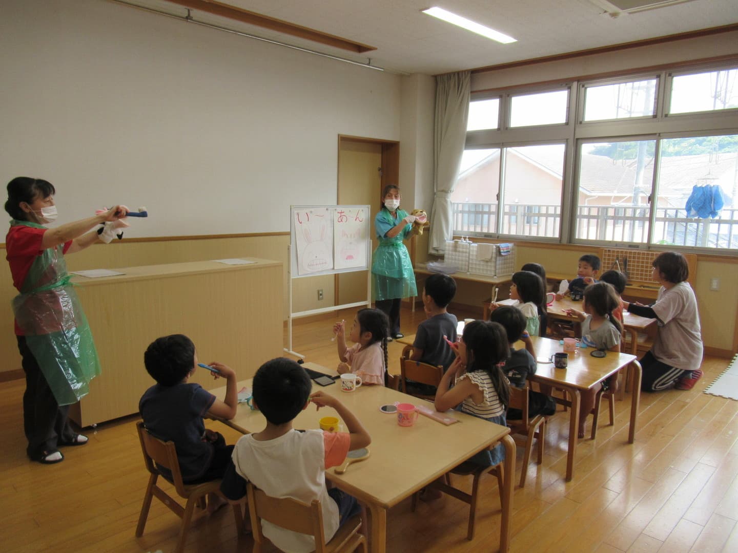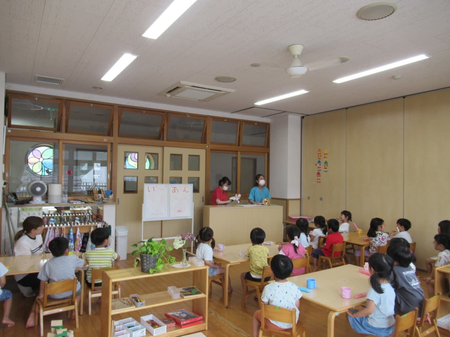 歯科衛生士さんに来ていただき、以上児クラスの園児たちが歯磨き指導を受けました。イラストやパペットで分かりやすく口の開け方や、歯の磨き方を教えてもらうとみんな上手に真似をしていましたよ。年長児は染め出し液を使って、鏡を見ながら磨き残しを確認し、きれいに汚れを落としていました。今日教えてもらったことをこれからも続けて欲しいと思います。