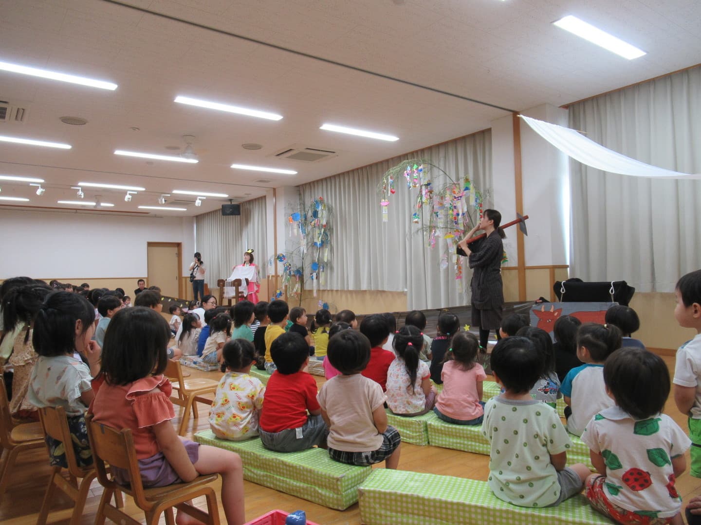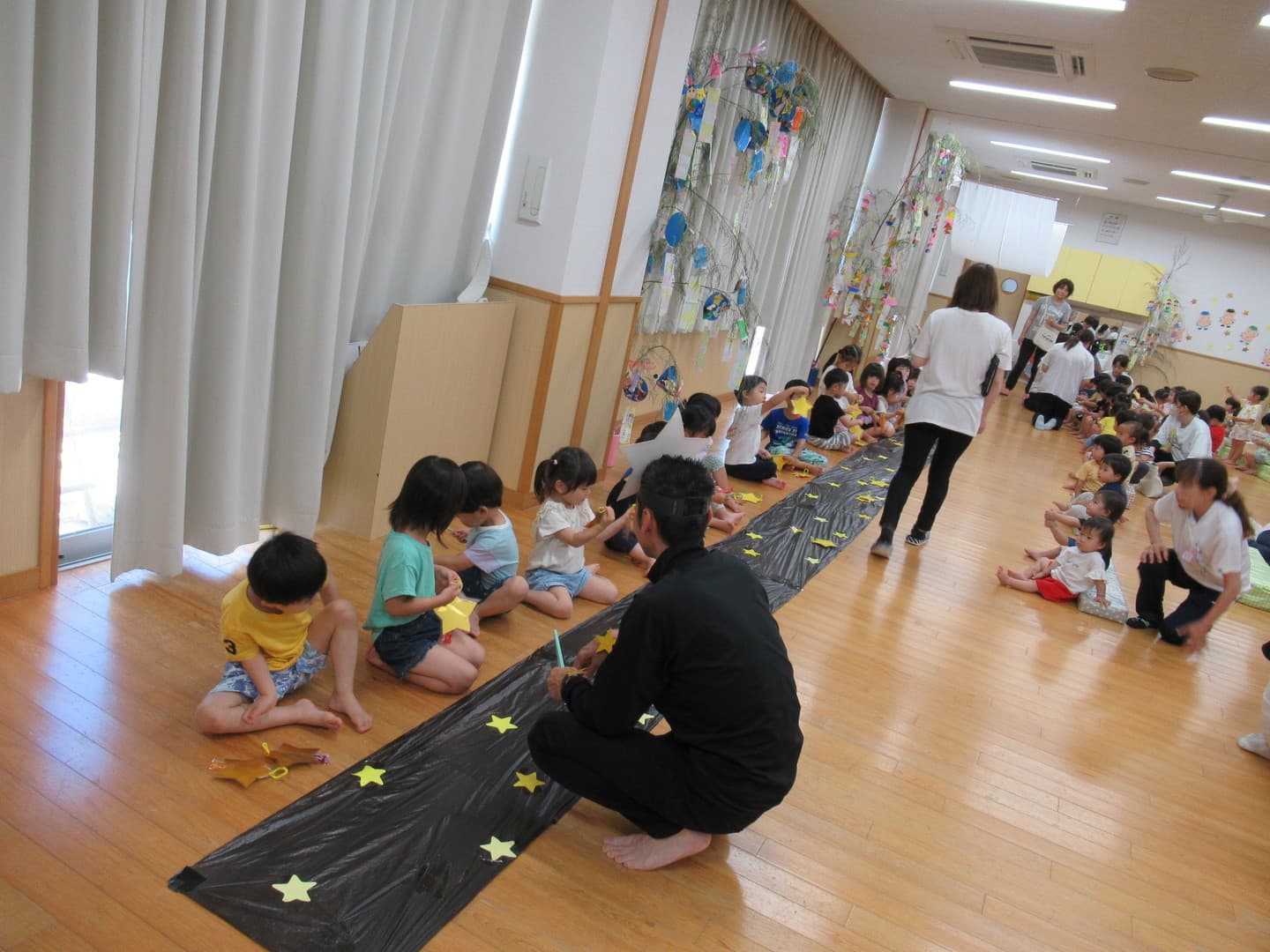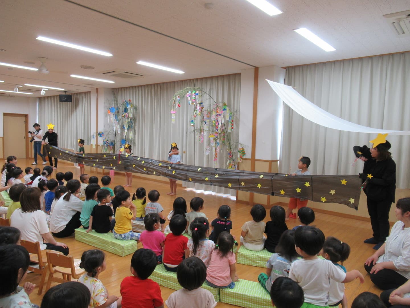 もうすぐ七夕ですね。こども園でも、笹に手作りの飾りや短冊を飾ったり、“たなばたさま”の歌を歌って7月7日の七夕の日を楽しみにしています♪今日は、一足早く七夕会がありました。みんなで七夕の手遊びをしたり、織姫と彦星の劇を見たり、願い事を発表したり・・・最後は、お星さまたちが天の川と一緒にやって来て、ゼリーのプレゼントをしてくれました。みんな大喜びでしたよ!