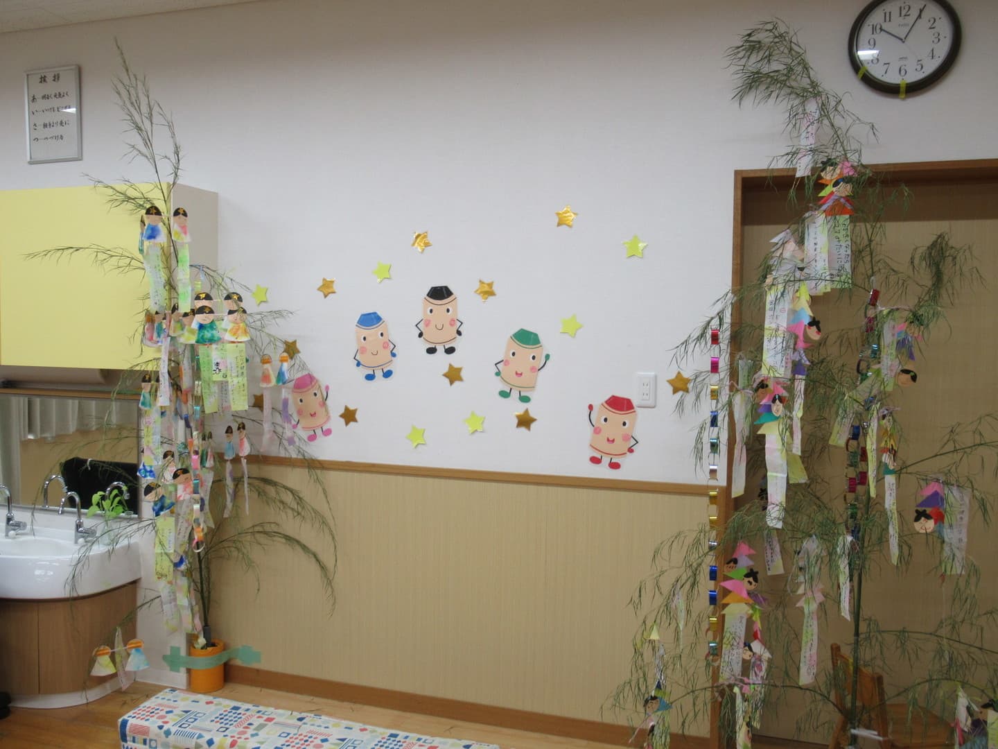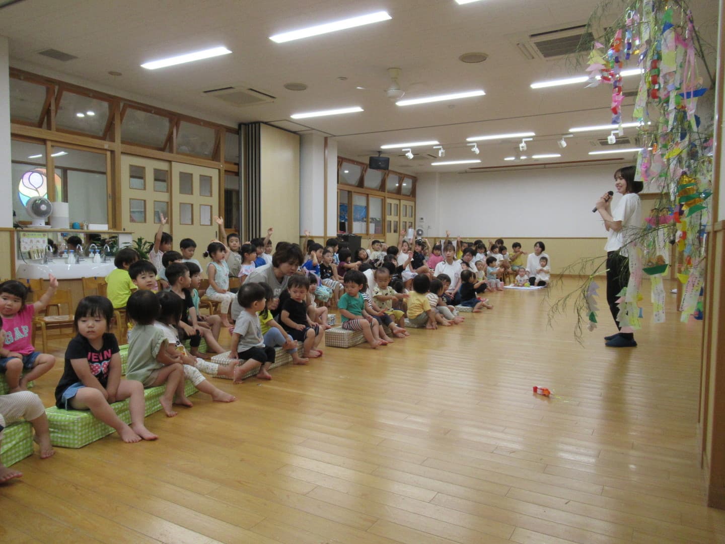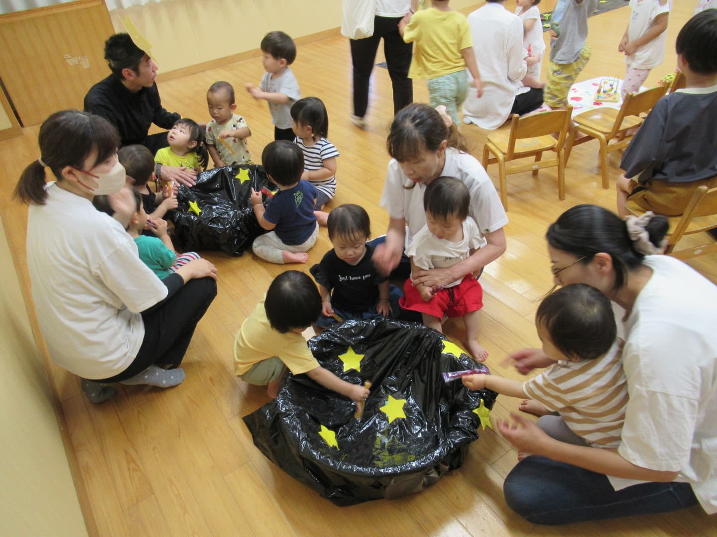 もうすぐ七夕ですね。こども園でも、笹に手作りの飾りや短冊を飾ったり、“たなばたさま”の歌を歌って7月7日の七夕の日を楽しみにしています♪今日は、一足早く七夕会がありました。みんなで七夕の手遊びをしたり、織姫と彦星の劇を見たり、願い事を発表したり・・・最後は、お星さまたちが天の川と一緒にやって来て、ゼリーのプレゼントをしてくれました。みんな大喜びでしたよ!
