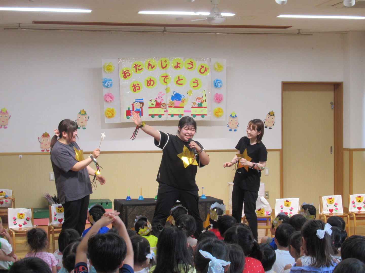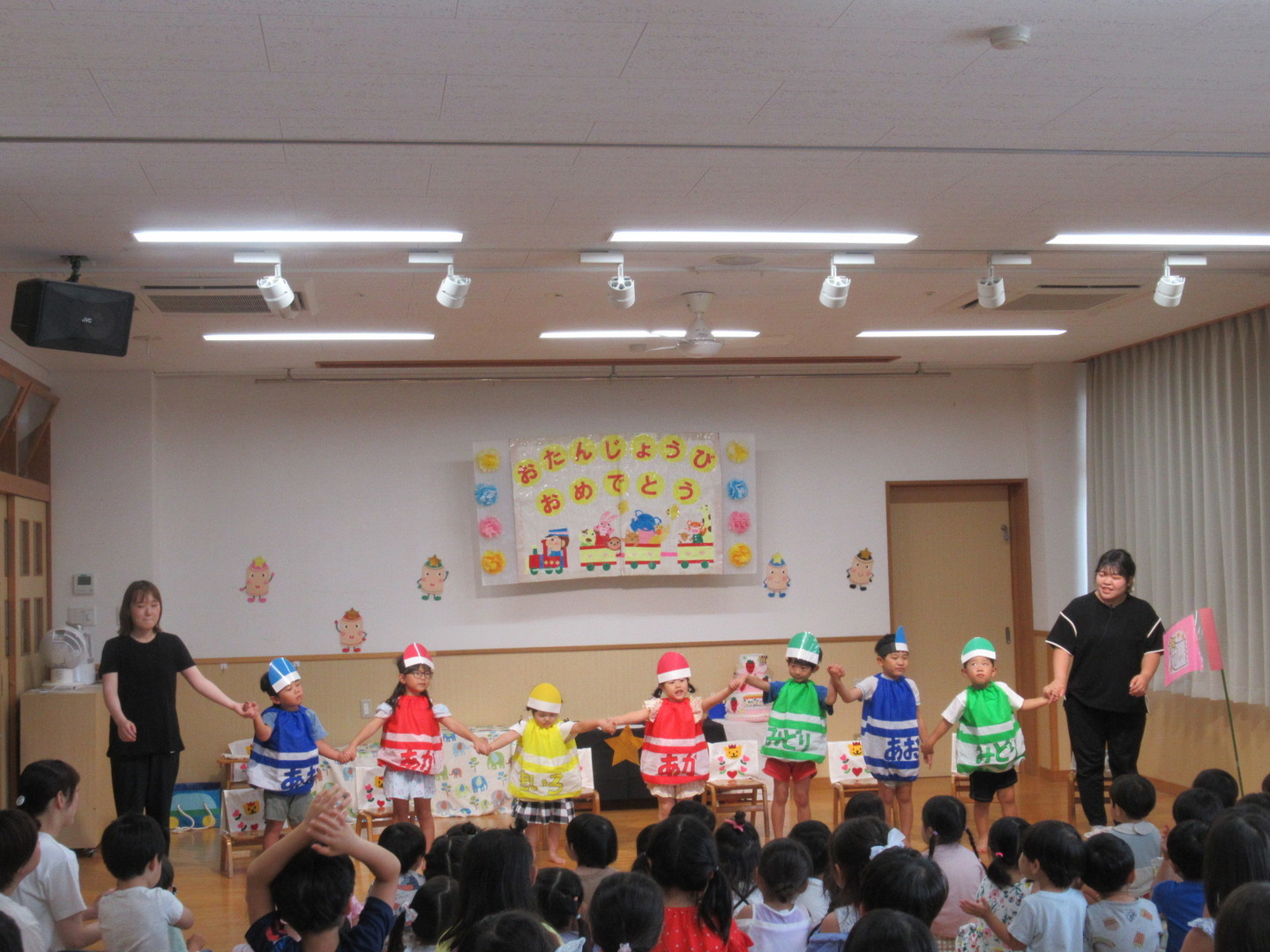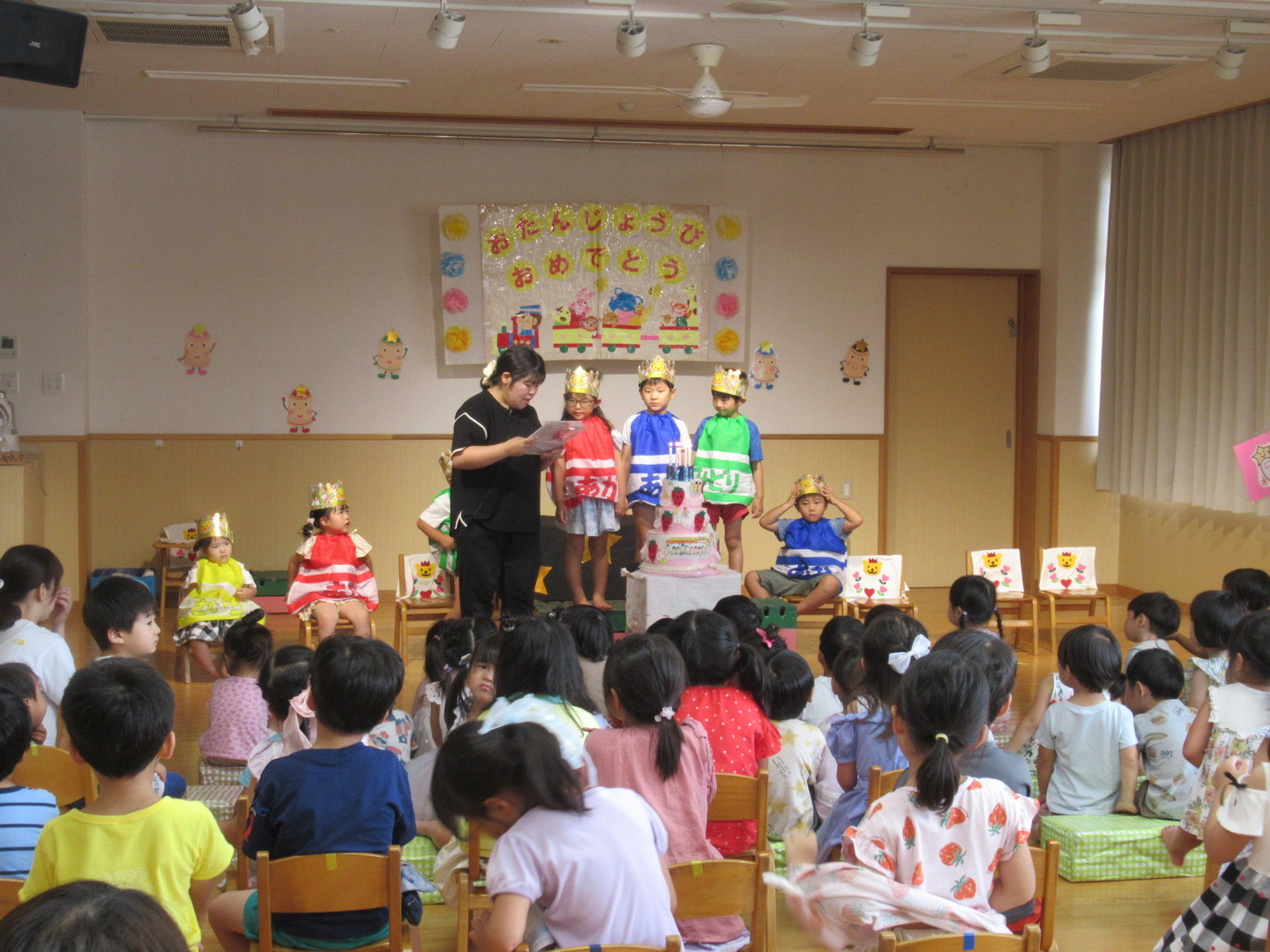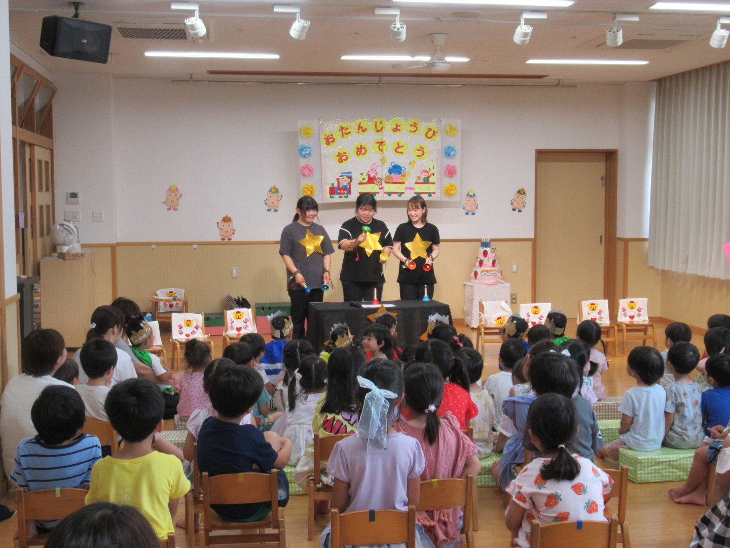 今月も色々なクレヨンに変身した誕生児さんが元気に入場し、ダンスや手遊び歌を披露してくれました。夏らしい“みずあそび”と“きらきらぼし”の手遊び歌は、みんな楽しそうでしたよ♪最後に、お空からお星さまたちが遊びに来てくれ、ハンドベルできらきらぼしを演奏してくれました。きれいな音色が響き、みんな聞き入っていました✨