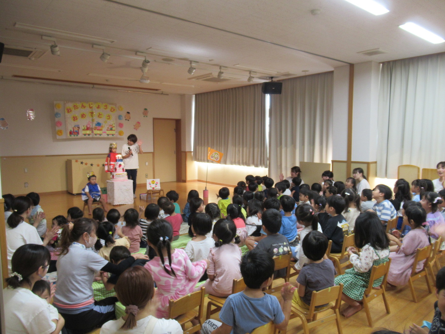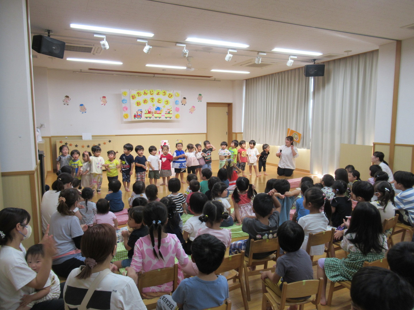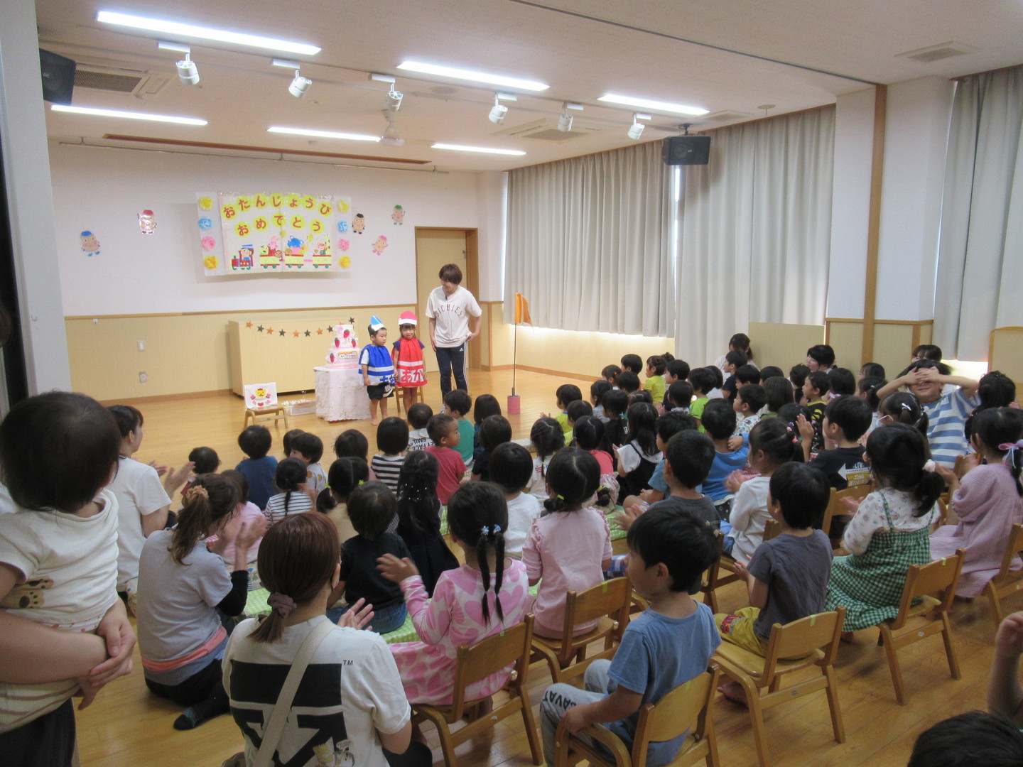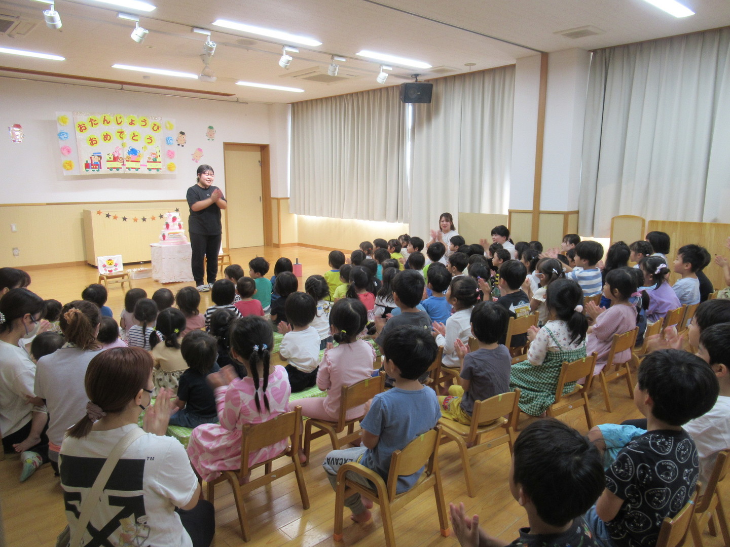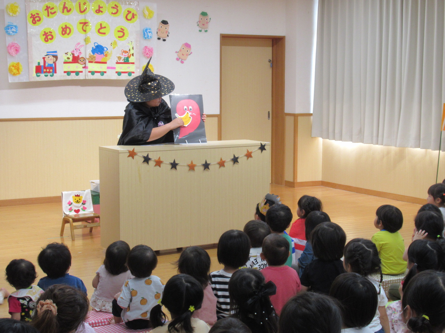 今月は、赤と青のクレヨンに変身した誕生児さんがお祝いしてもらいました。10月の誕生児は2人しかいないので、ちょっと恥ずかしそうにする様子もありましたが、みんなと一緒に“おいもごろごろ”と“どんぐりころころ”の手遊び歌を披露してくれましたよ♪最後は、魔女がお友だちのオバケと一緒にやって来ました。初めは白だったオバケですが、果物を食べるとあら不思議・・・果物と同じ色にどんどんん変身して、見ていた園児たちもびっくりしていました!にじ組さんから歌のプレゼントもあり、楽しい誕生会になりました。