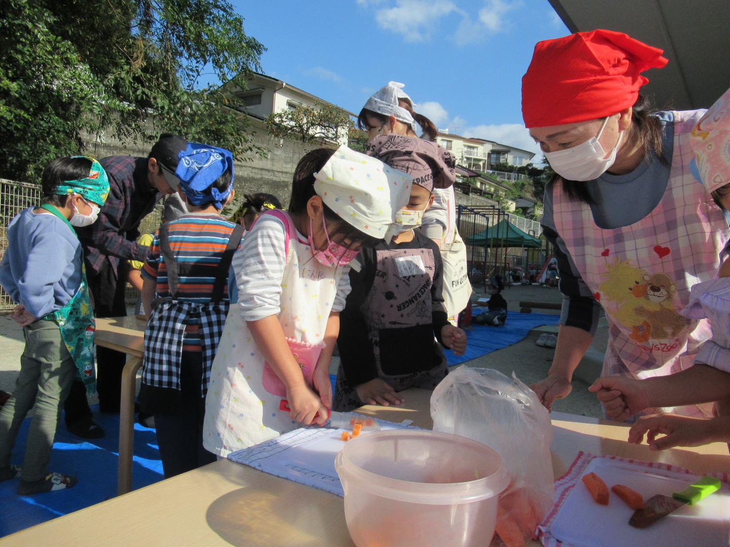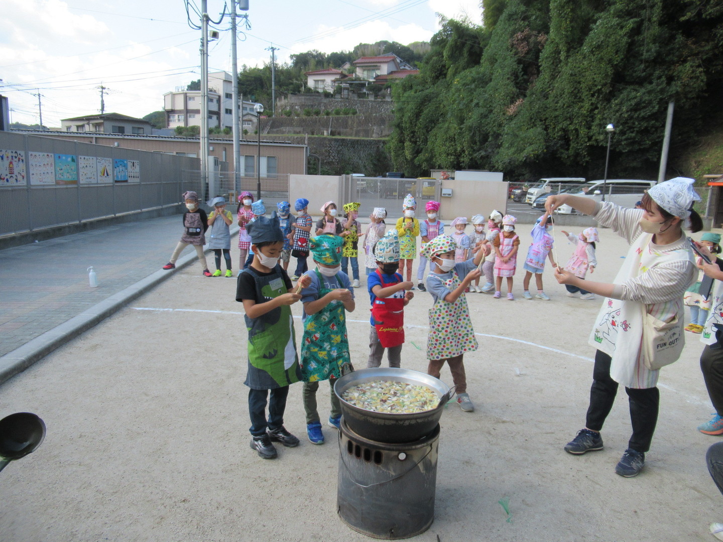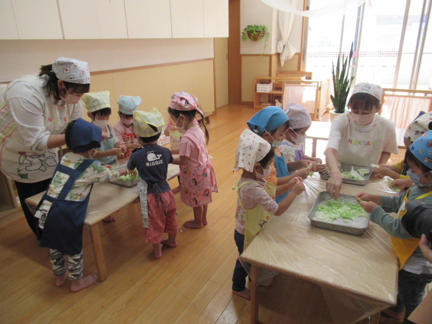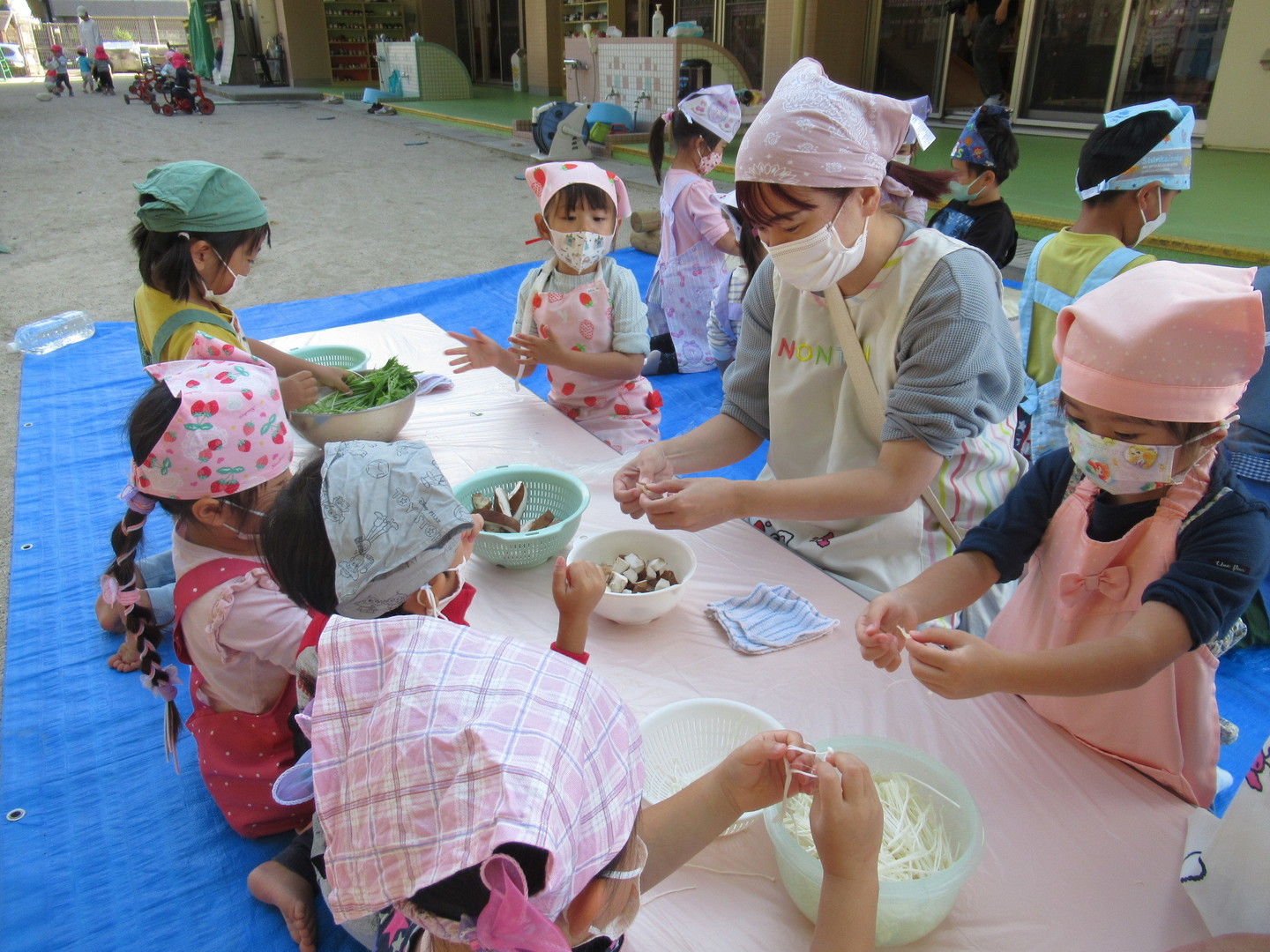にじ~そら組さんがだんご汁クッキングをしました。野菜を切ったり、ちぎったり、だんごを丸めたり・・・準備が出来たら大きなお鍋に入れていきました。だんごを伸ばすのは難しかったようですが、みんな真剣にしていましたよ。にじ組さんは初めてのクッキングでしたが、みんな楽しそうでした。自分たちで作っただんご汁はとても美味しかったようです。