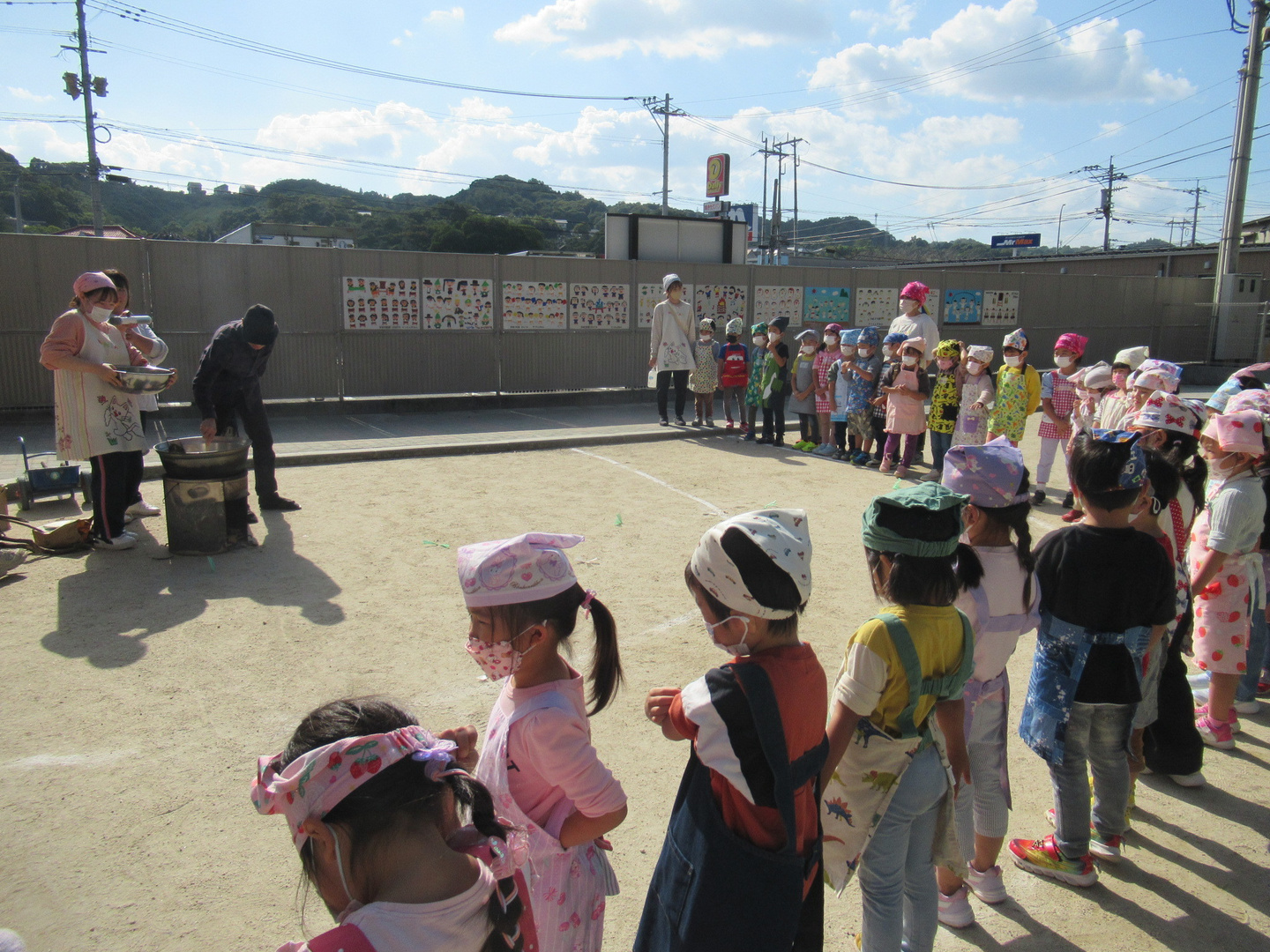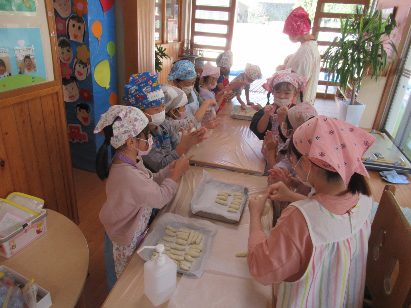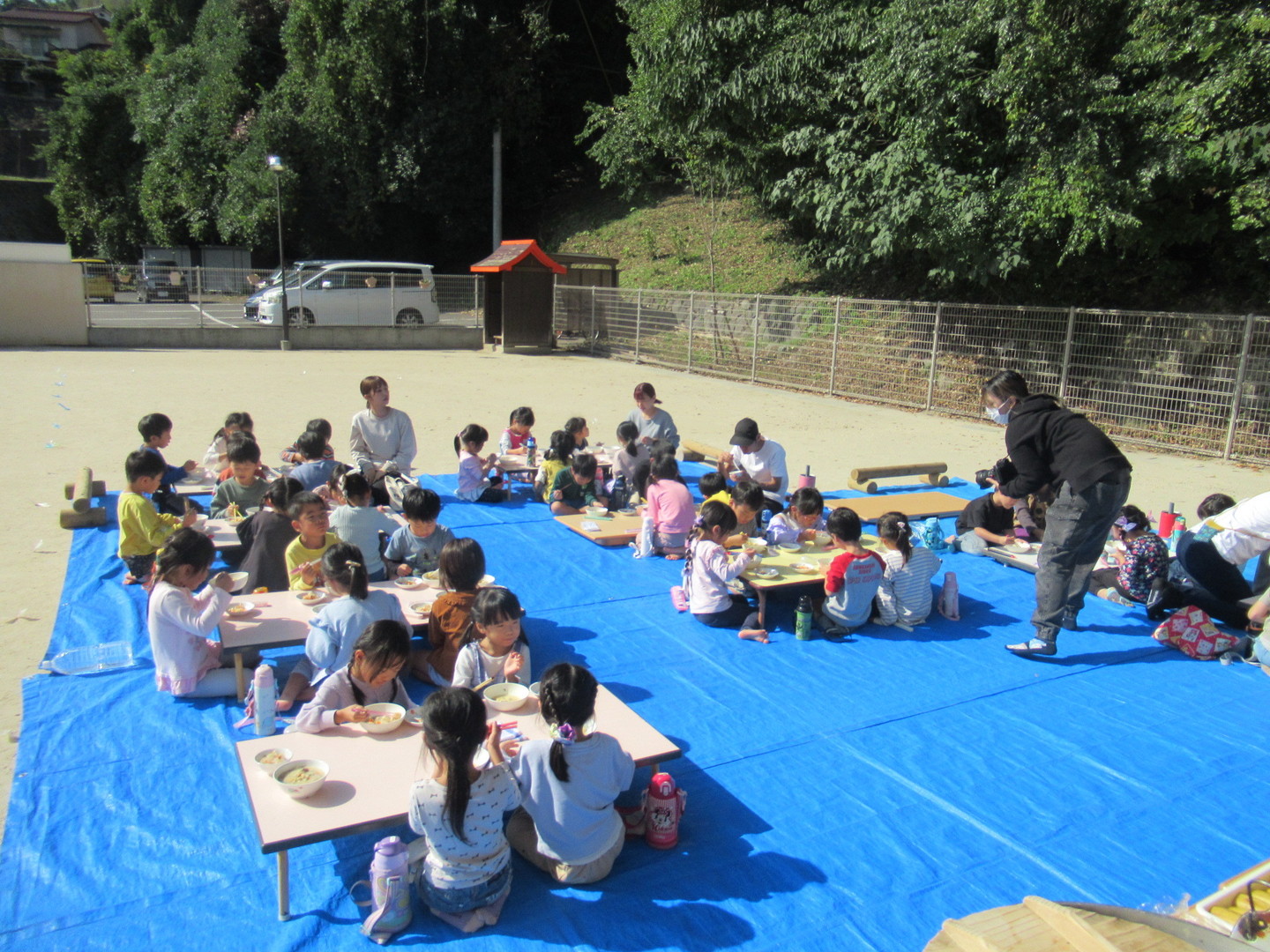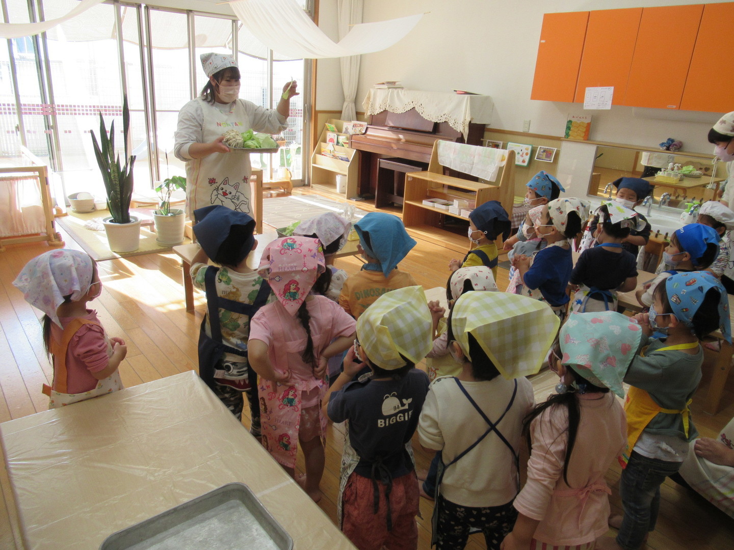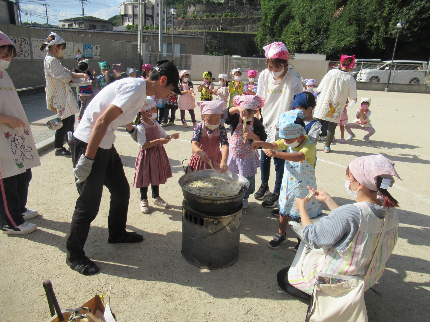 にじ~そら組さんがだんご汁クッキングをしました。野菜を切ったり、ちぎったり、だんごを丸めたり・・・準備が出来たら大きなお鍋に入れていきました。だんごを伸ばすのは難しかったようですが、みんな真剣にしていましたよ。にじ組さんは初めてのクッキングでしたが、みんな楽しそうでした。自分たちで作っただんご汁はとても美味しかったようです。