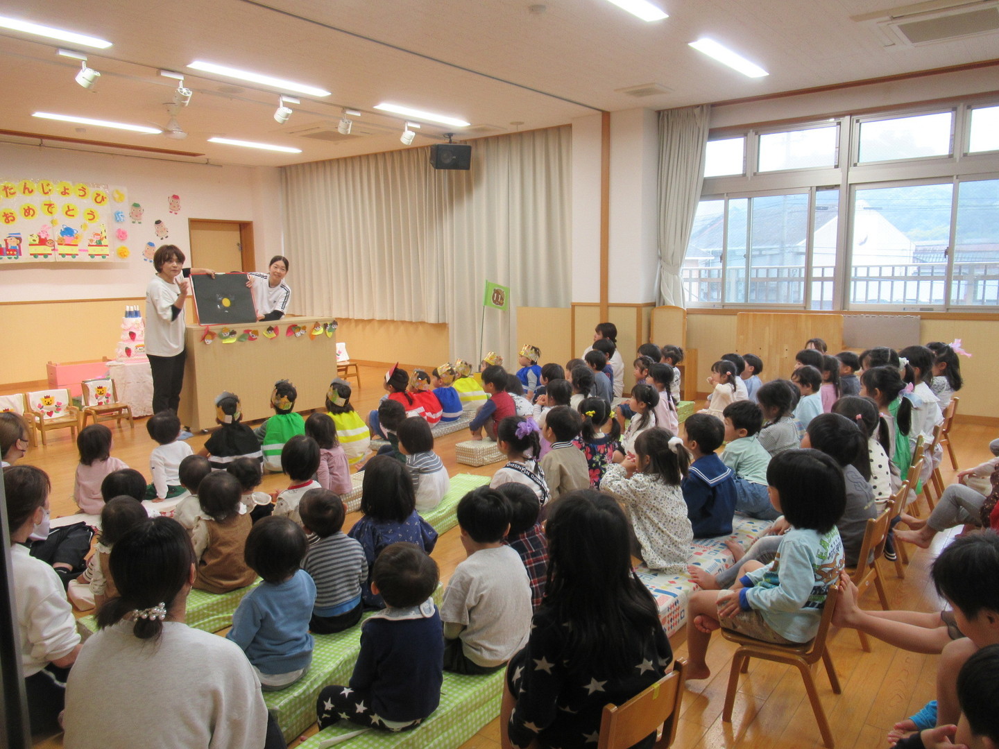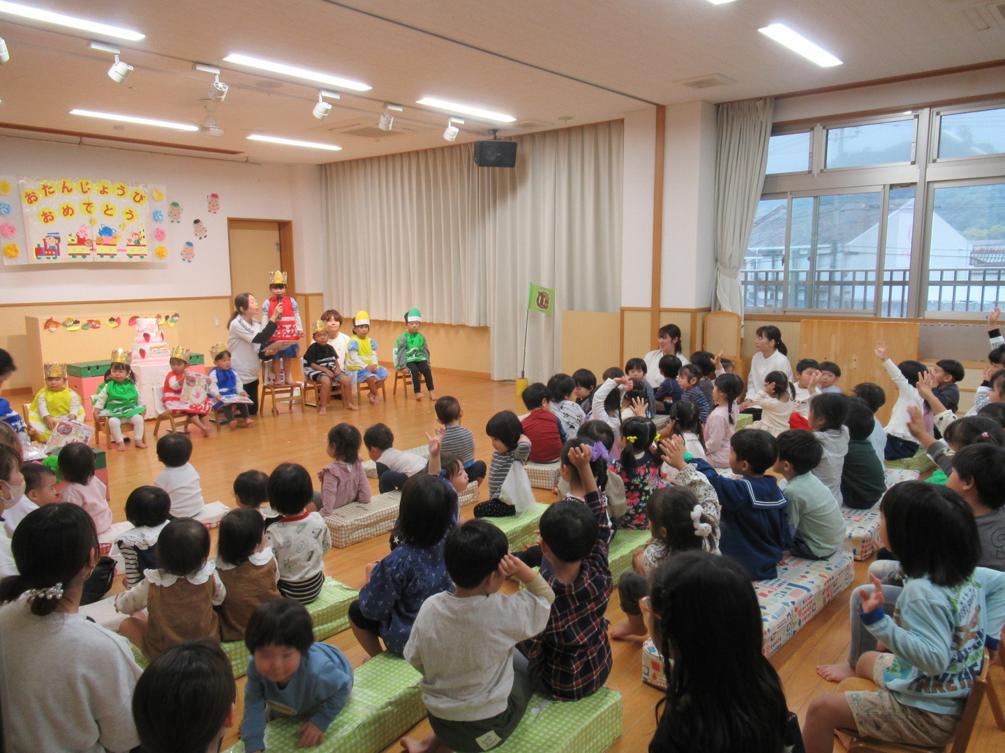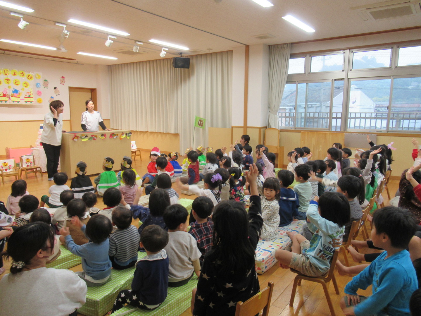 今月は10名のお友だちが好きな色のクレヨンに変身して登場しました。ダンスの後は、歌を歌いましたが、“やきいもグーチーパー”は、見ている園児たちも一緒にじゃんけんをして楽しんでいましたよ♪最後は、小さな穴から見える色や形を頼りに、何が隠れているのかを当てるクイズをしました。動物や秋らしい食べ物が隠れていて、正解すると嬉しそうな園児たちでした!