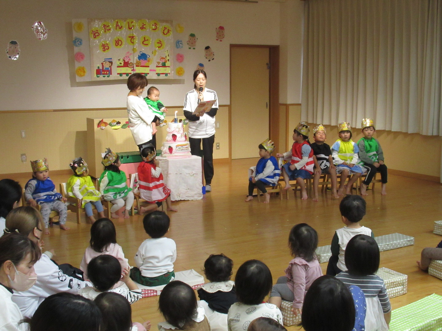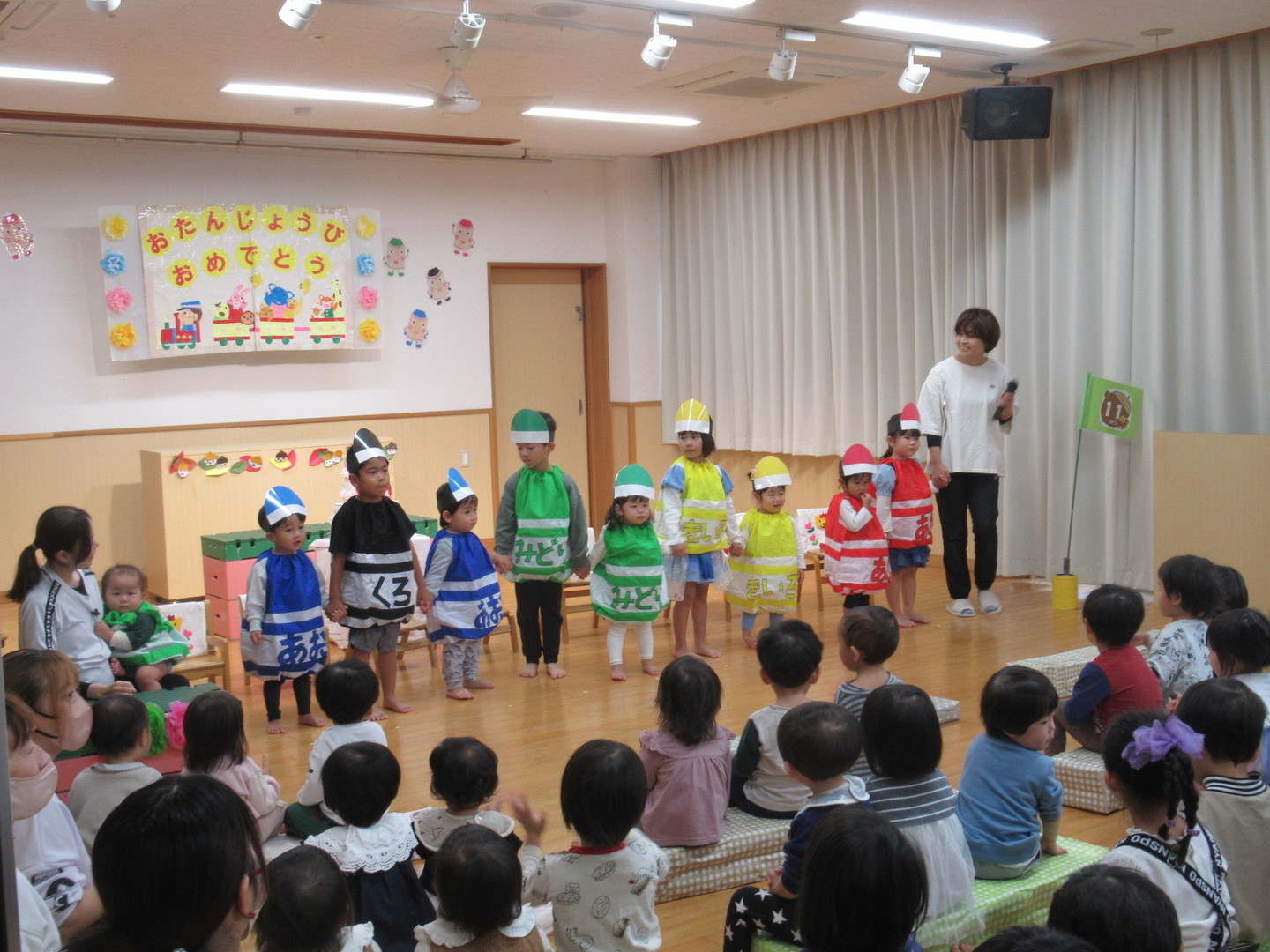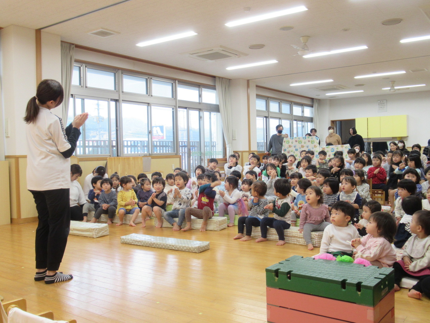 今月は10名のお友だちが好きな色のクレヨンに変身して登場しました。ダンスの後は、歌を歌いましたが、“やきいもグーチーパー”は、見ている園児たちも一緒にじゃんけんをして楽しんでいましたよ♪最後は、小さな穴から見える色や形を頼りに、何が隠れているのかを当てるクイズをしました。動物や秋らしい食べ物が隠れていて、正解すると嬉しそうな園児たちでした!