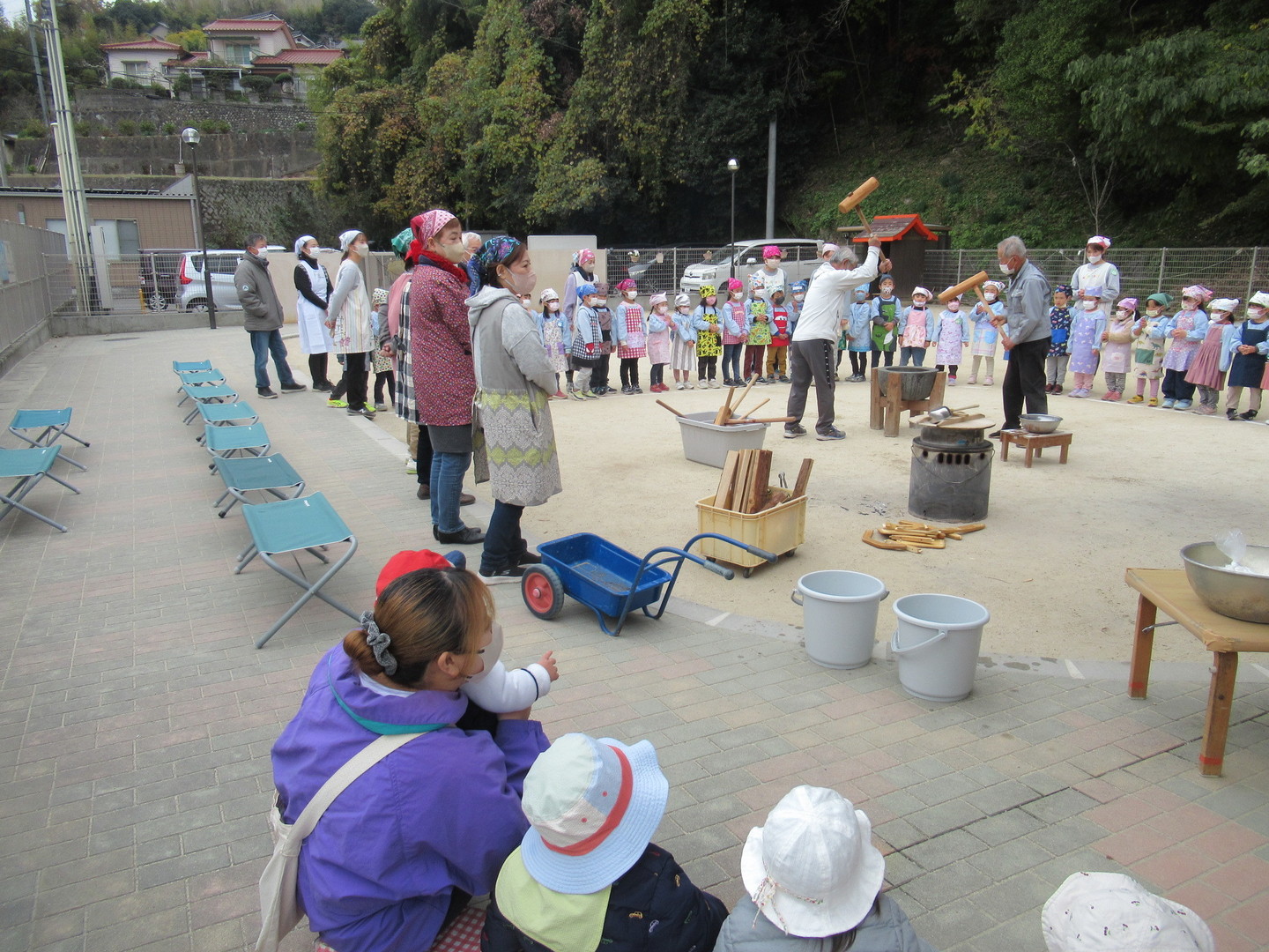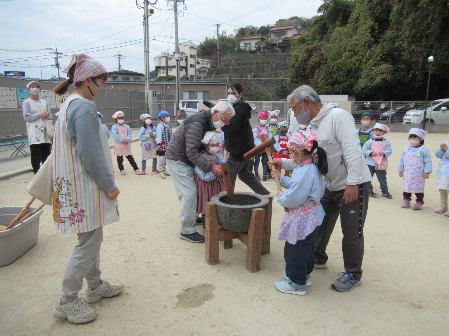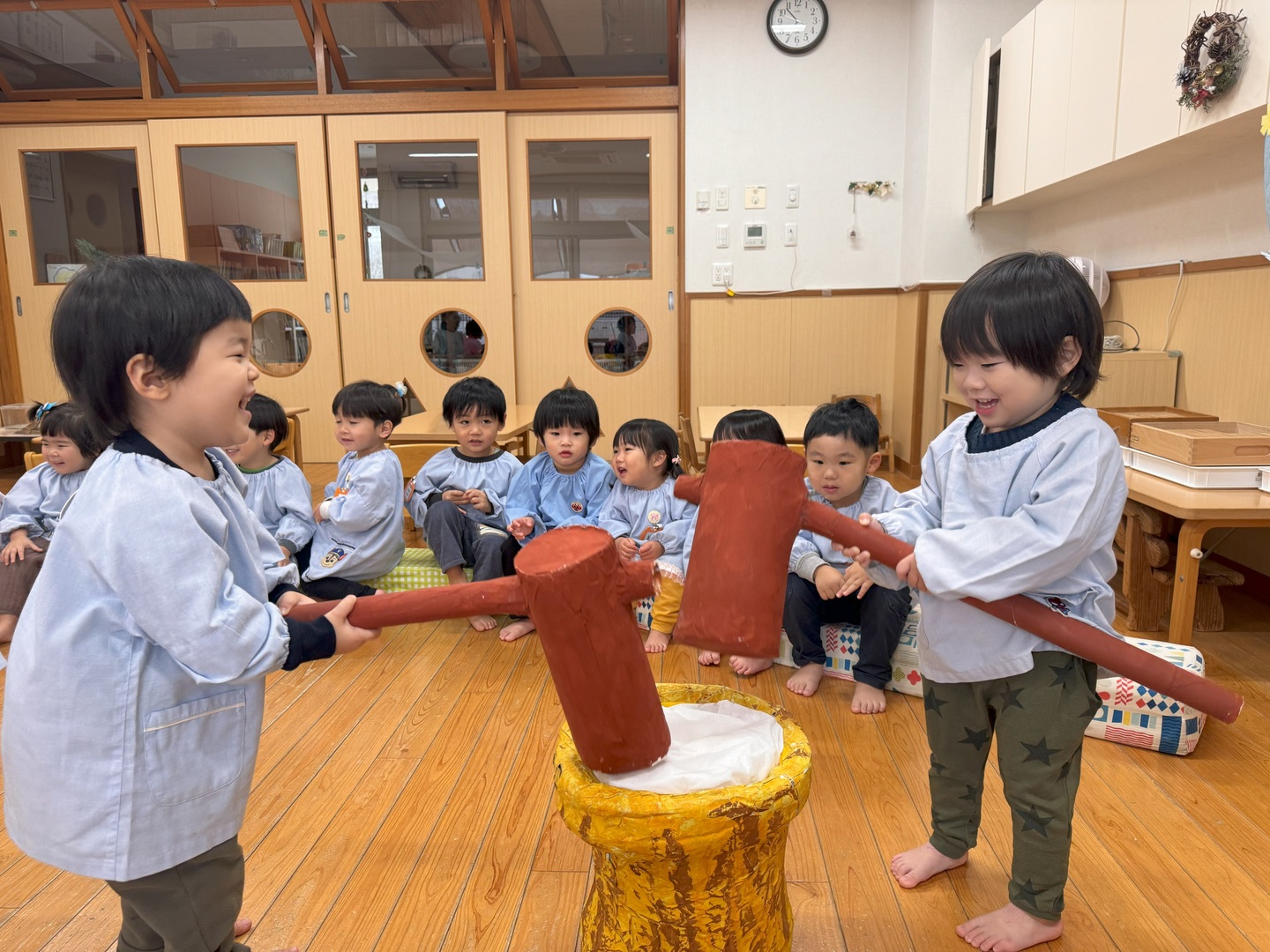 以上児クラスの園児たちが、おじいちゃんおばあちゃんとおもちつきをしました。初めにもち米を食べ、このお米がおもちになっていくことを知らせ、杵で順番についていきました。白餅やあんこ餅を作りましたが、おばあちゃんたちに教えてもらいながら、上手に丸めていましたよ。最後は楽しみにしていた試食タイム!自分で作ったおもちはおいしかったようです。小さいクラスのお友だちも様子を見に来たり、ごっこ遊びをして楽しみました。