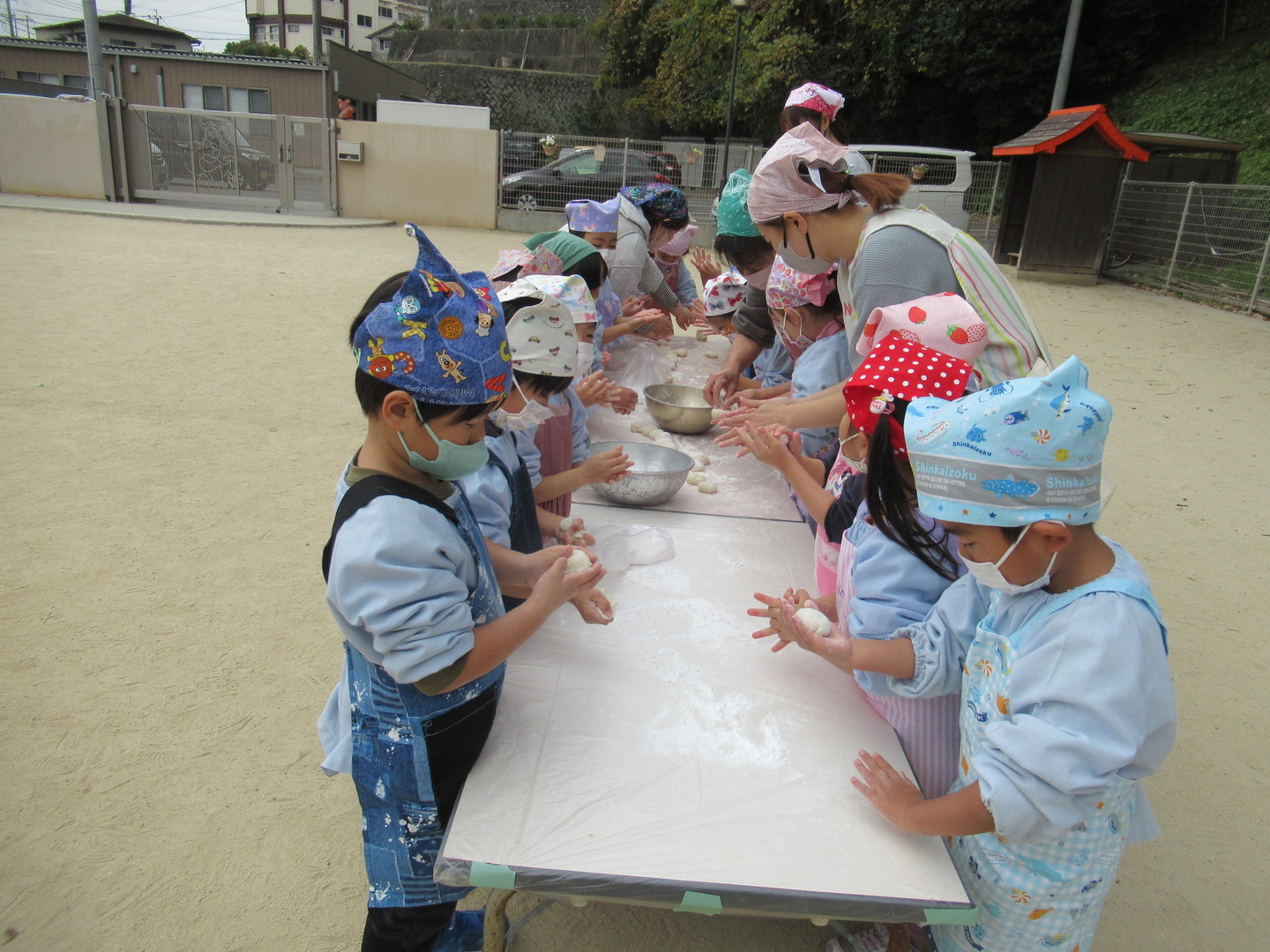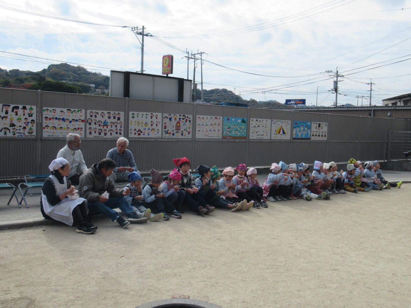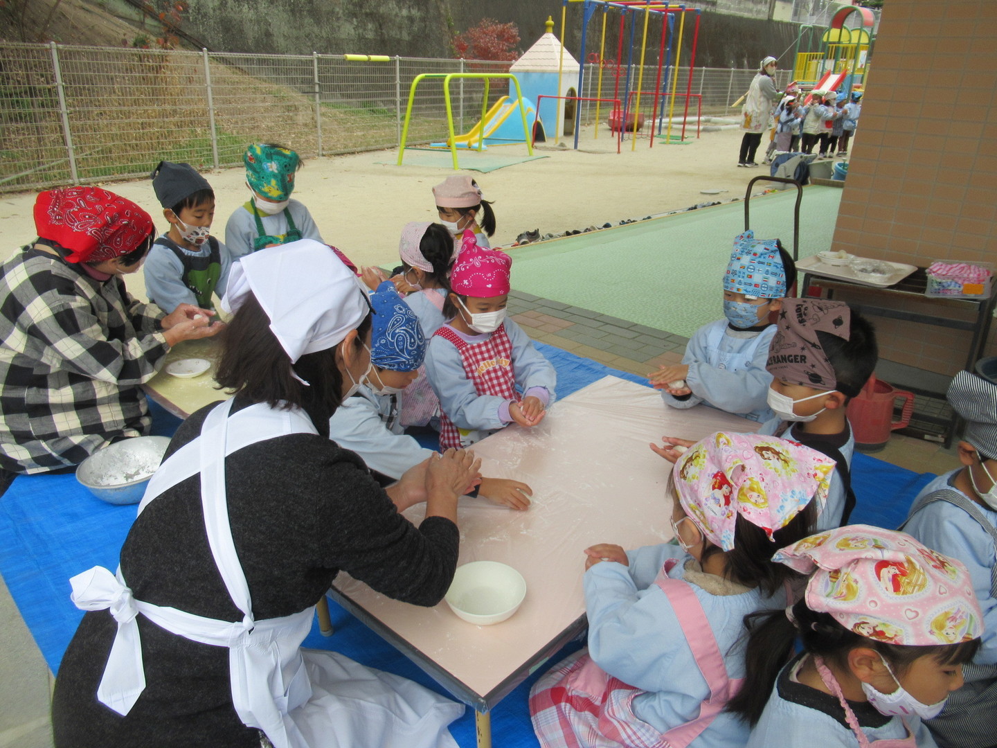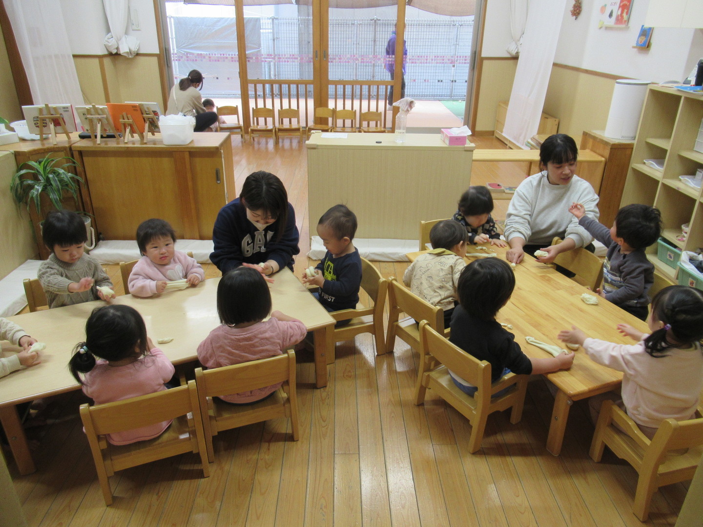 以上児クラスの園児たちが、おじいちゃんおばあちゃんとおもちつきをしました。初めにもち米を食べ、このお米がおもちになっていくことを知らせ、杵で順番についていきました。白餅やあんこ餅を作りましたが、おばあちゃんたちに教えてもらいながら、上手に丸めていましたよ。最後は楽しみにしていた試食タイム!自分で作ったおもちはおいしかったようです。小さいクラスのお友だちも様子を見に来たり、ごっこ遊びをして楽しみました。