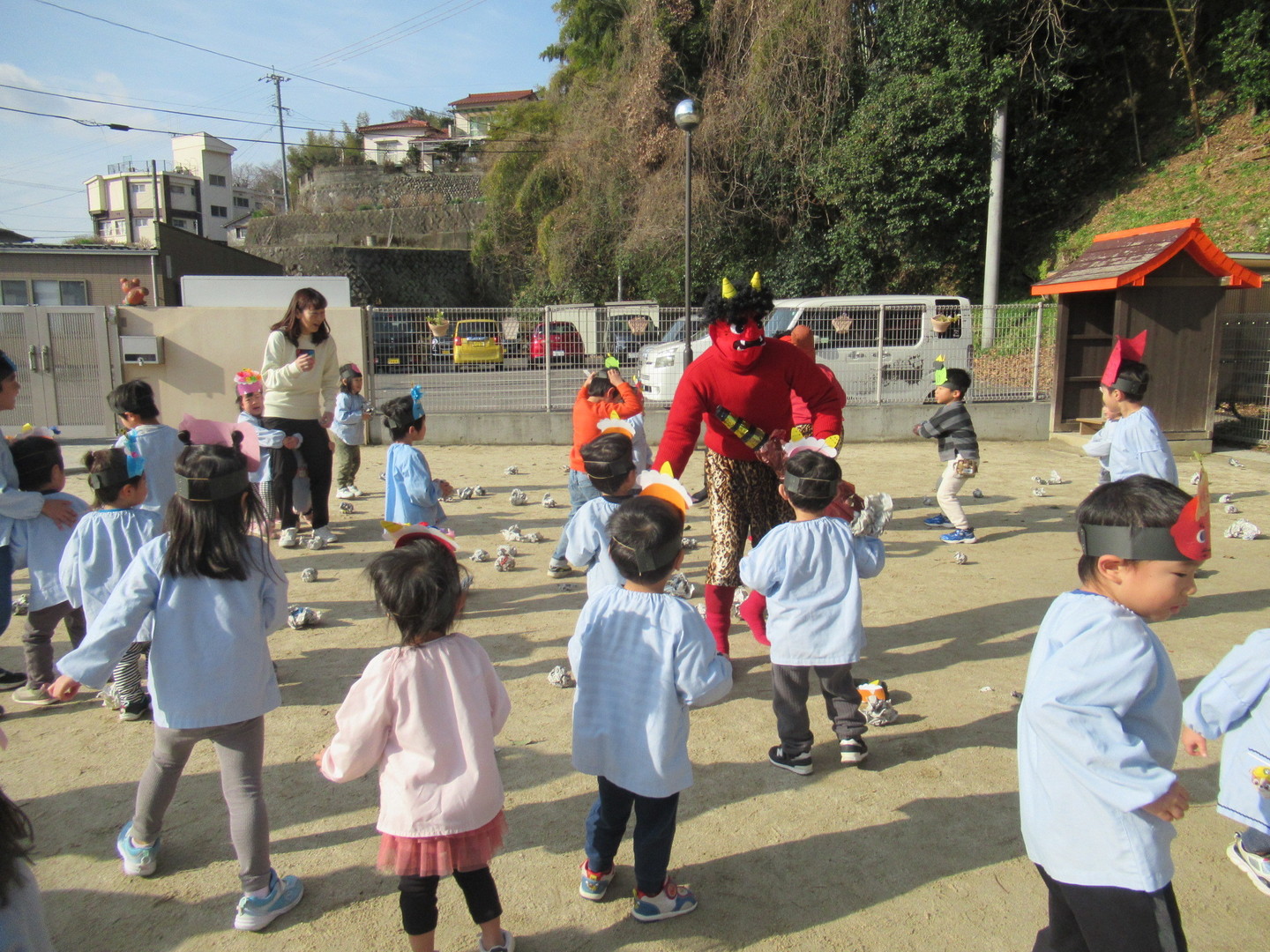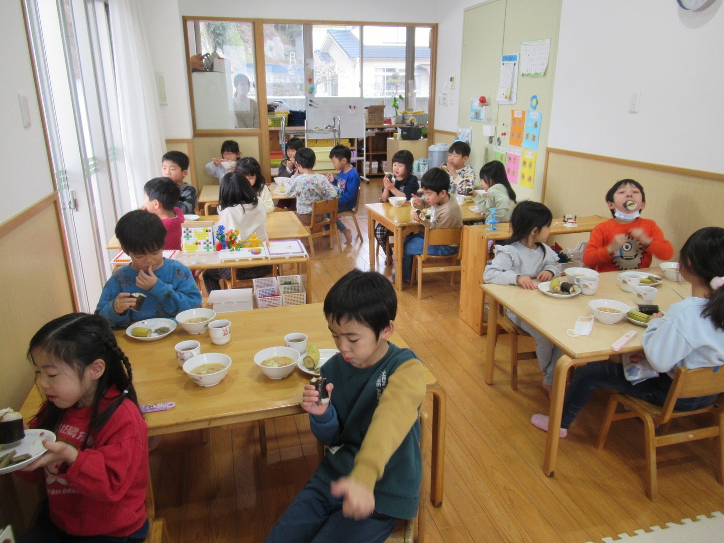 にじ~そら組の園児が、豆まきごっこをしました。みんなで“鬼のパンツ♪”を踊り、鬼が来た時のために豆を投げる練習をしていると、鬼がやって来ました!!慌てて逃げたり、泣いたり、勇敢に立ち向かったり・・・それぞれでしたが、無事にみんなで退治することができました。心の中にいた鬼は出ていったかな?給食は恵方巻(キンパ)でしたが、そら組さんは方角に向かって黙々と食べでいました。